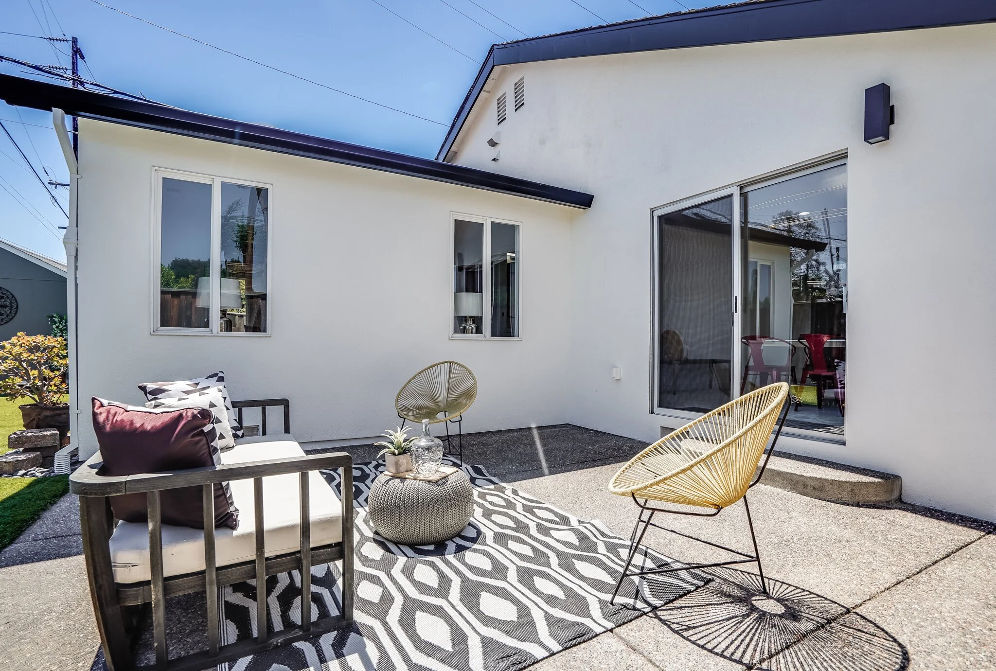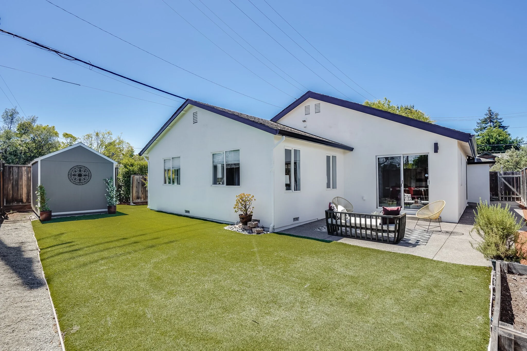 Large yard includes both lawn and concrete space for outdoor entertaining