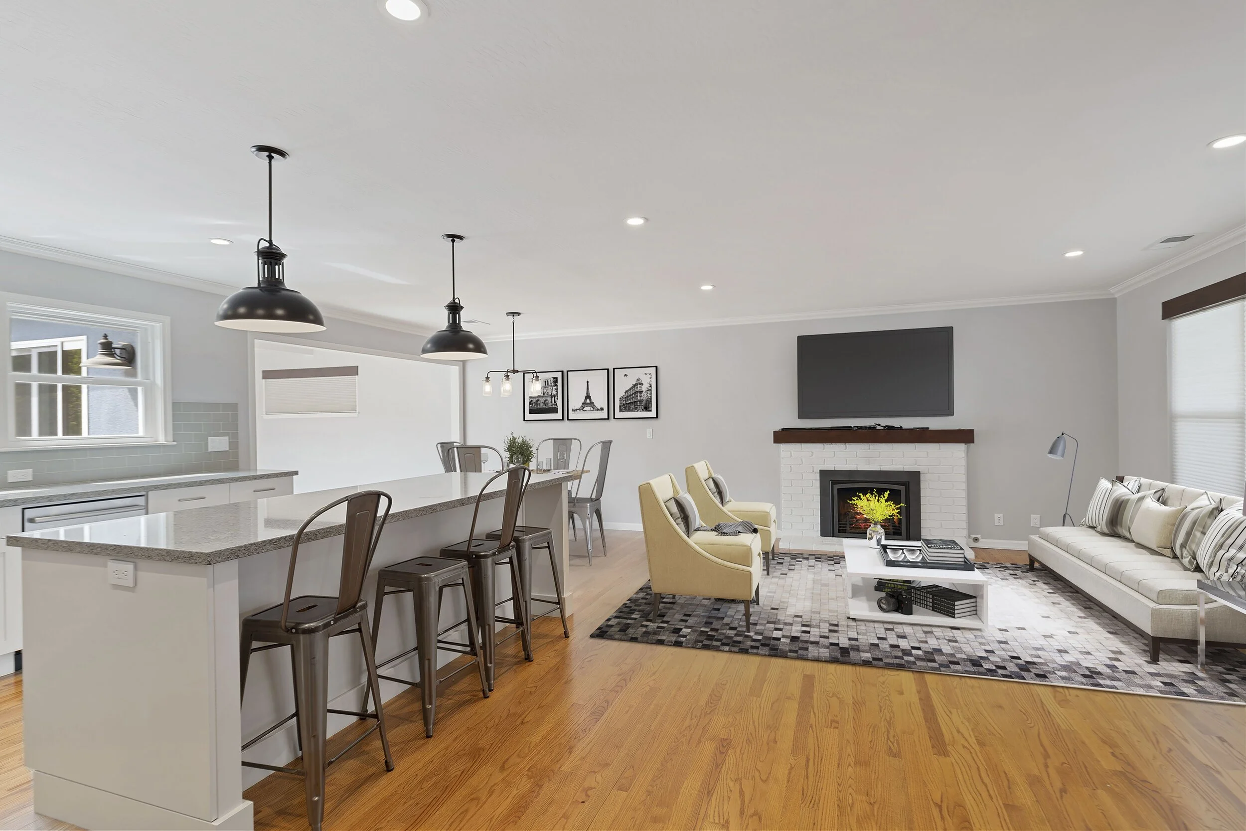 Enjoy must-have kitchen amenities like quartz countertops, a breakfast bar, custom soft-close cabinetry with pull-out storage, and high-end appliances by Bosch