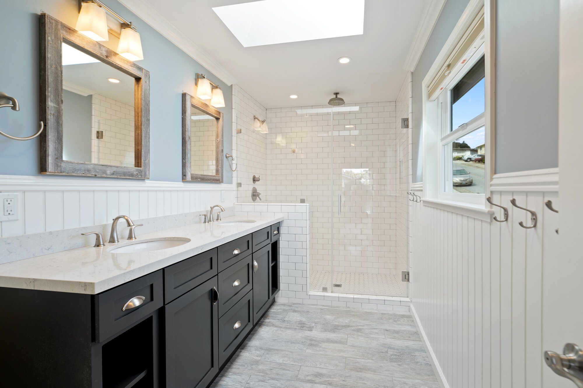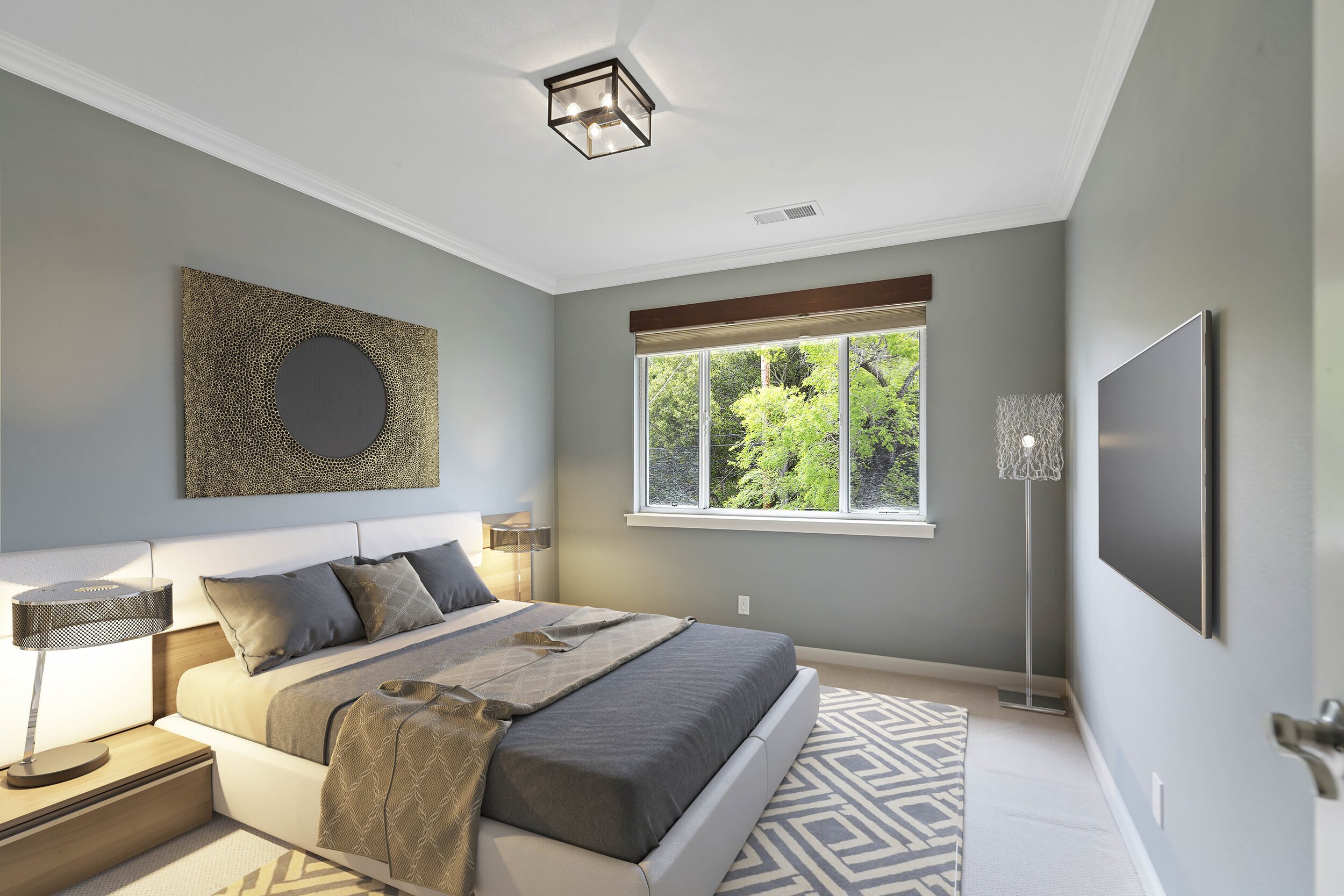The serene master suite displays soothing bay views, a walk-in closet, and sky-lit bath with rainfall shower and dual vanities