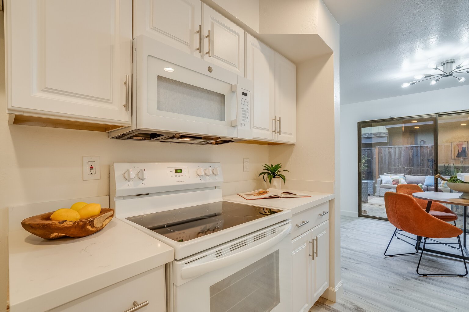 Bright kitchen with quartz countertops and brand-new microwave and stove