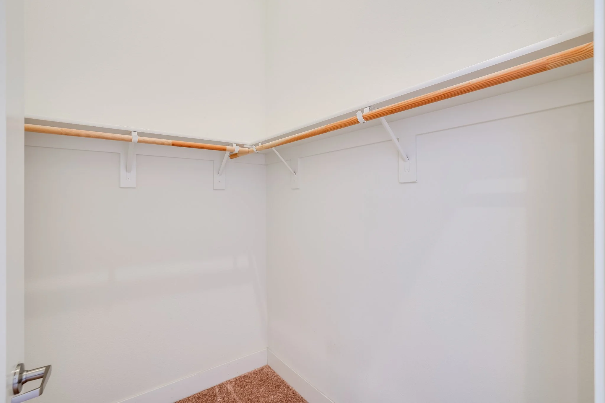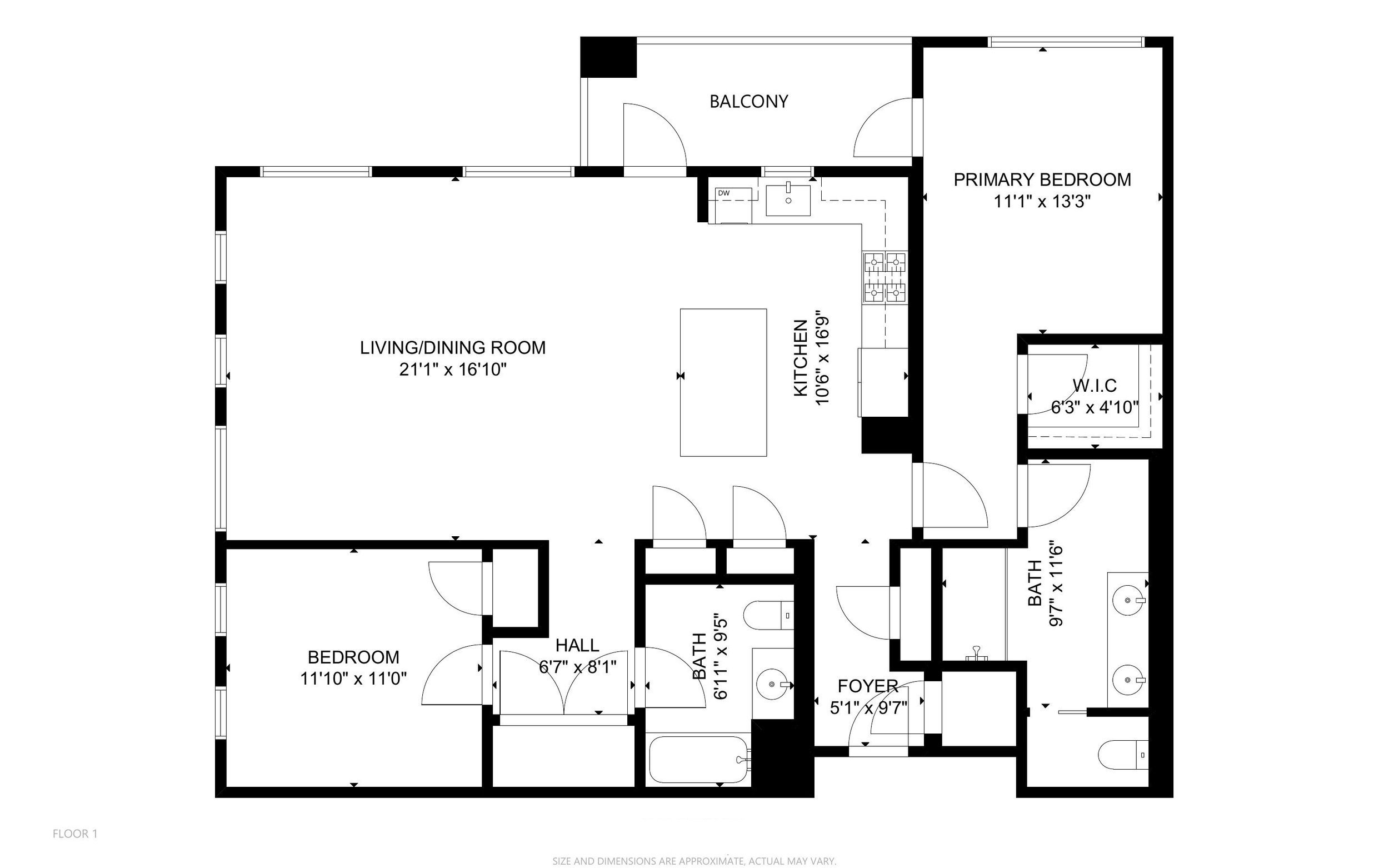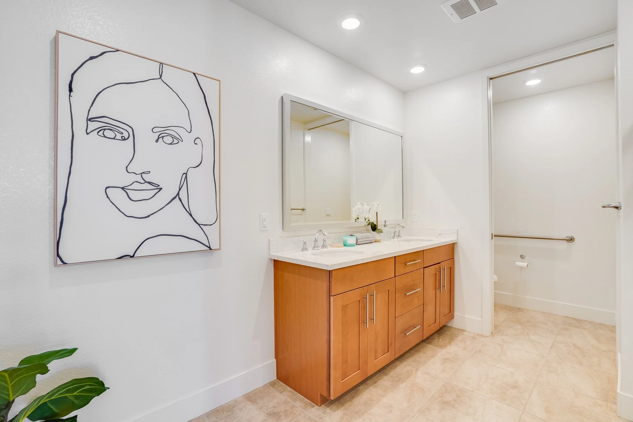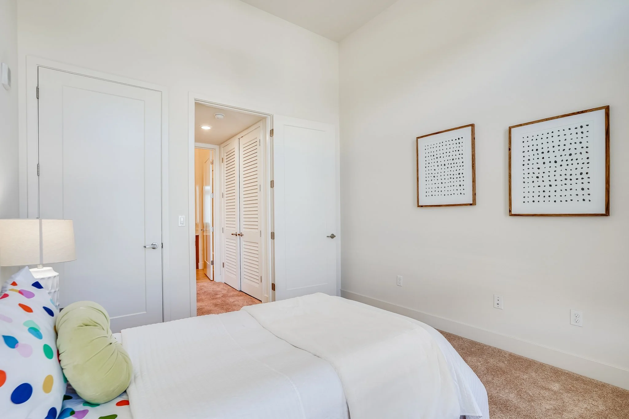 The primary bedroom includes a walk-in closet, and a few additional luxuries: double sink vanity, a walk-in shower, a water closet accessible via a pocket door, and balcony access.