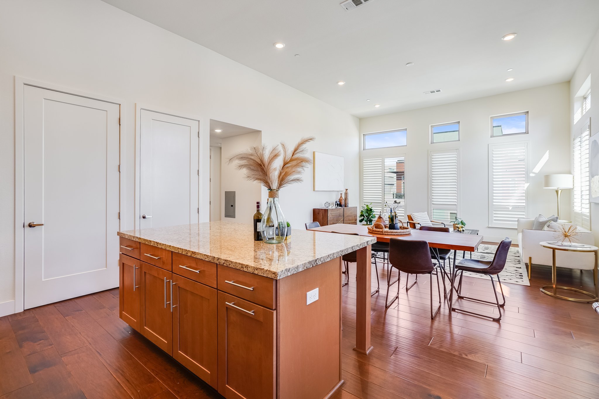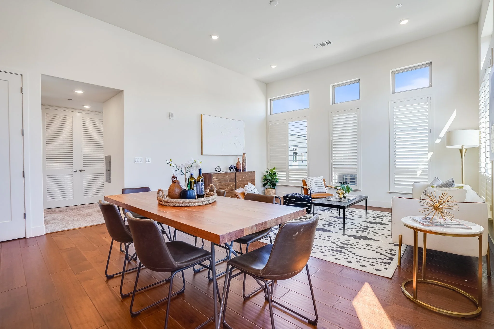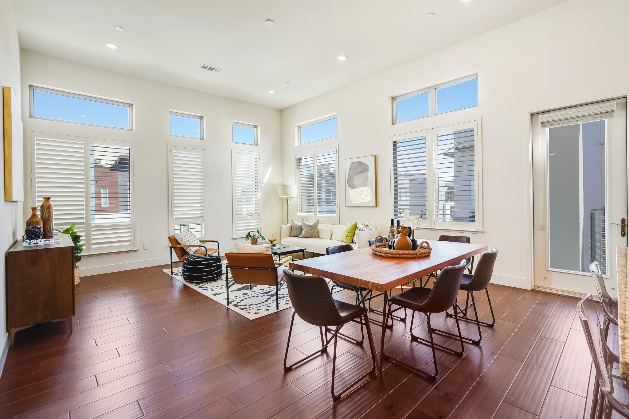 High ceilings accentuate the home’s airy atmosphere as natural light pours in through an array of tall windows with white interior shutters and a glass door opening to the private balcony.