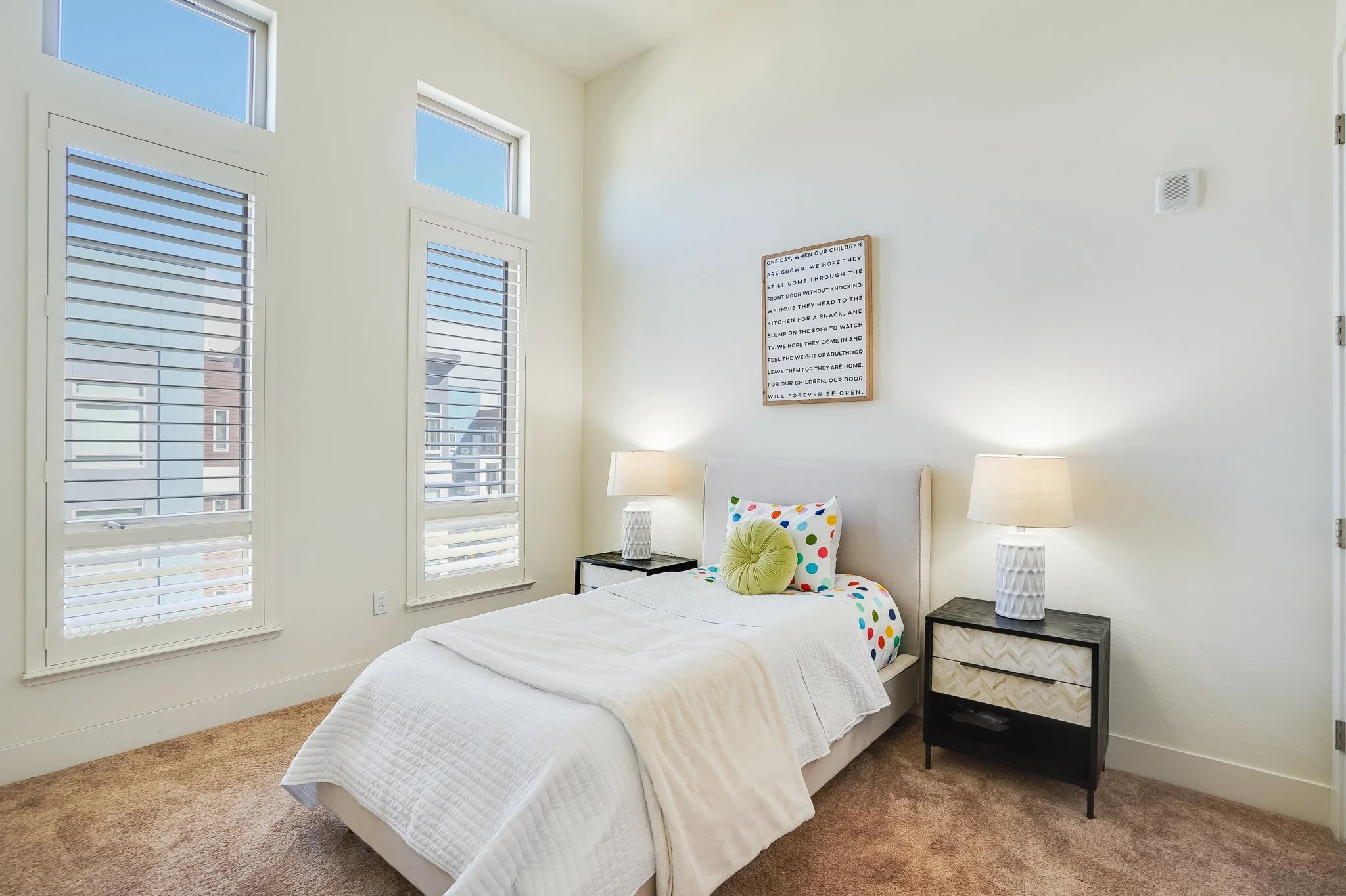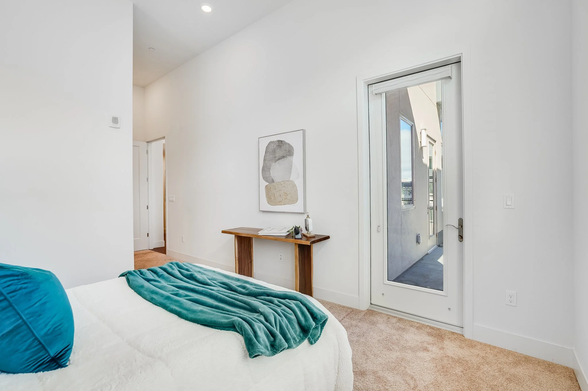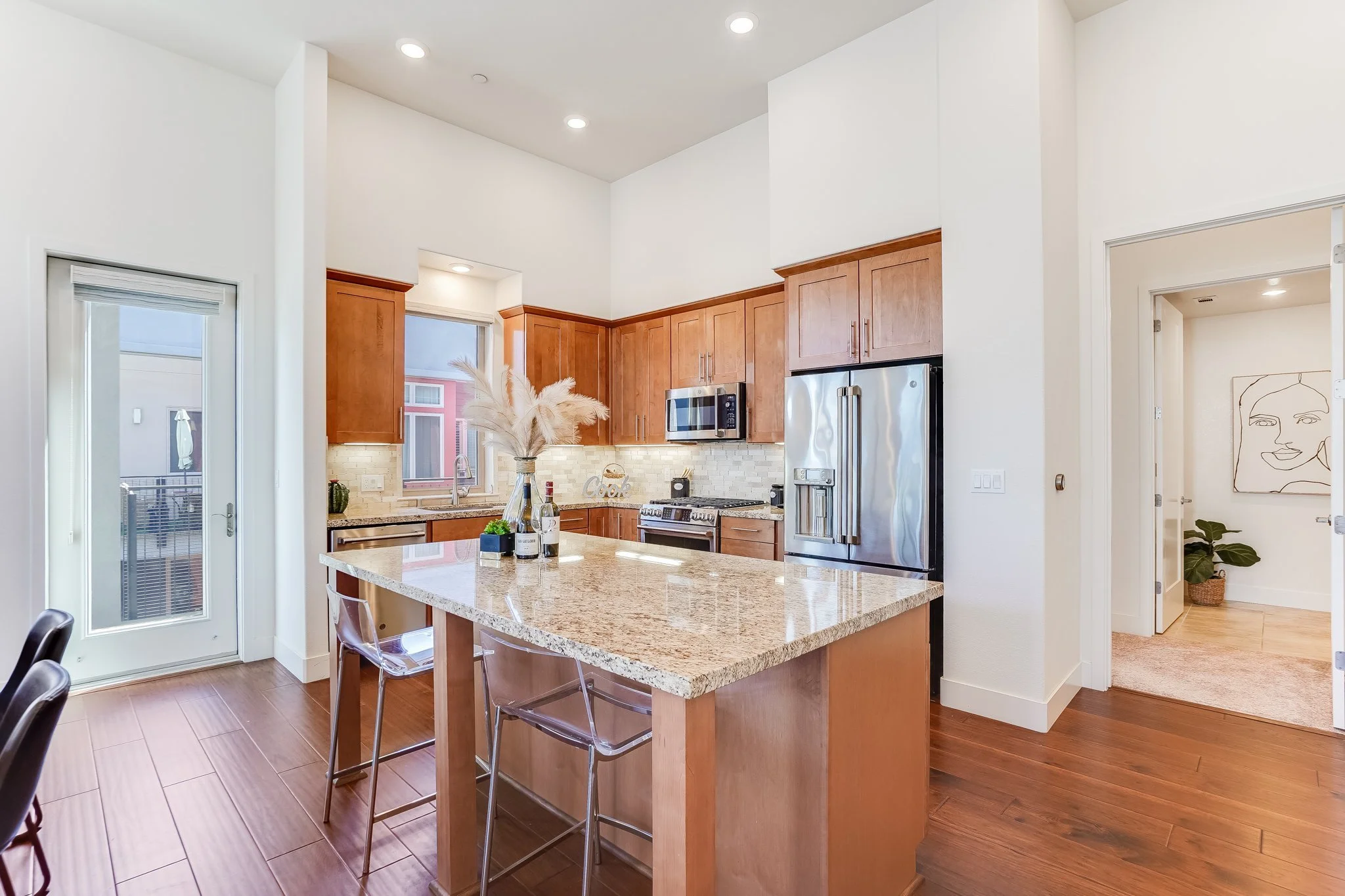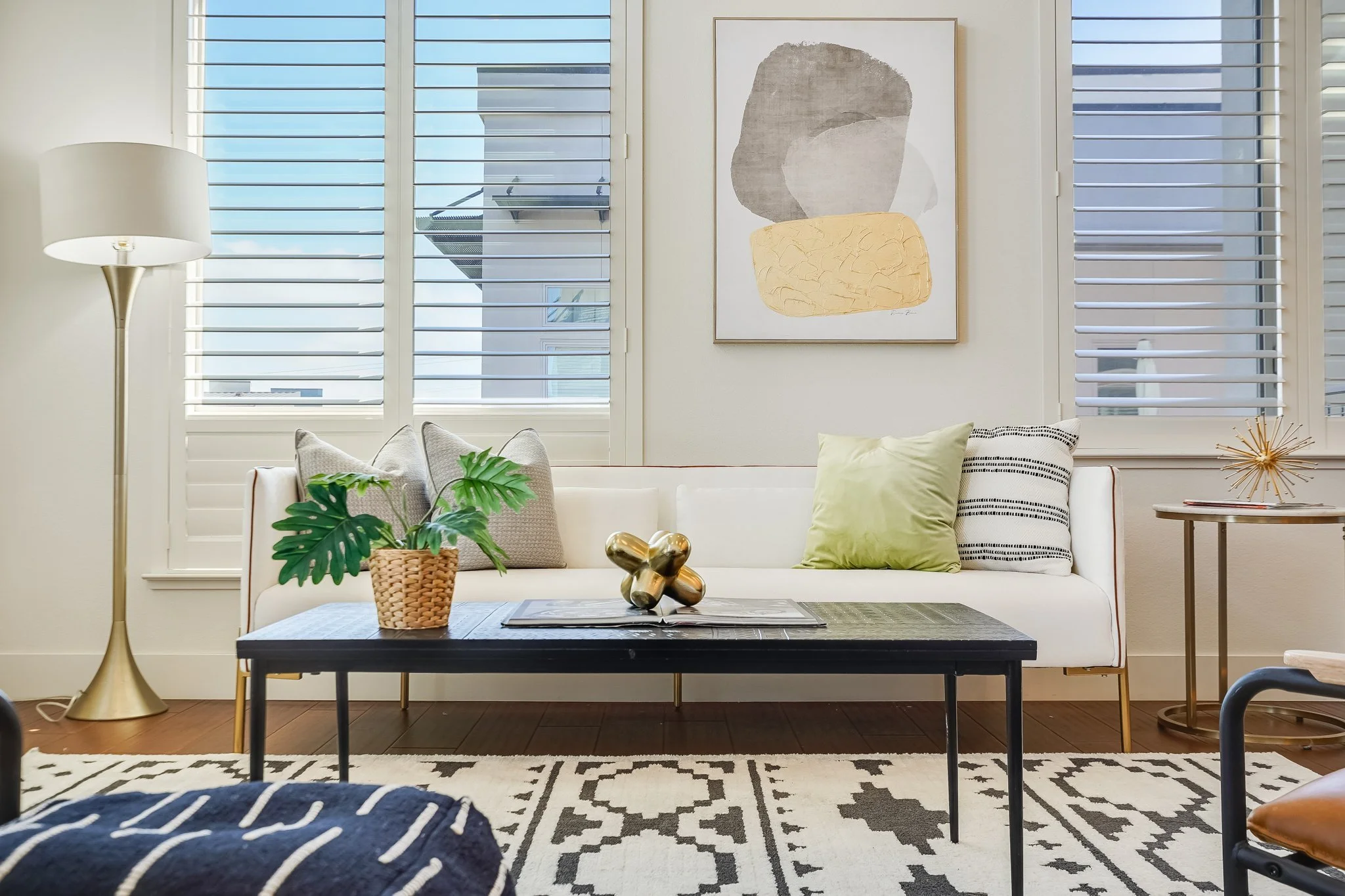 High ceilings accentuate the home’s airy atmosphere as natural light pours in through an array of tall windows with white interior shutters and a glass door opening to the private balcony.