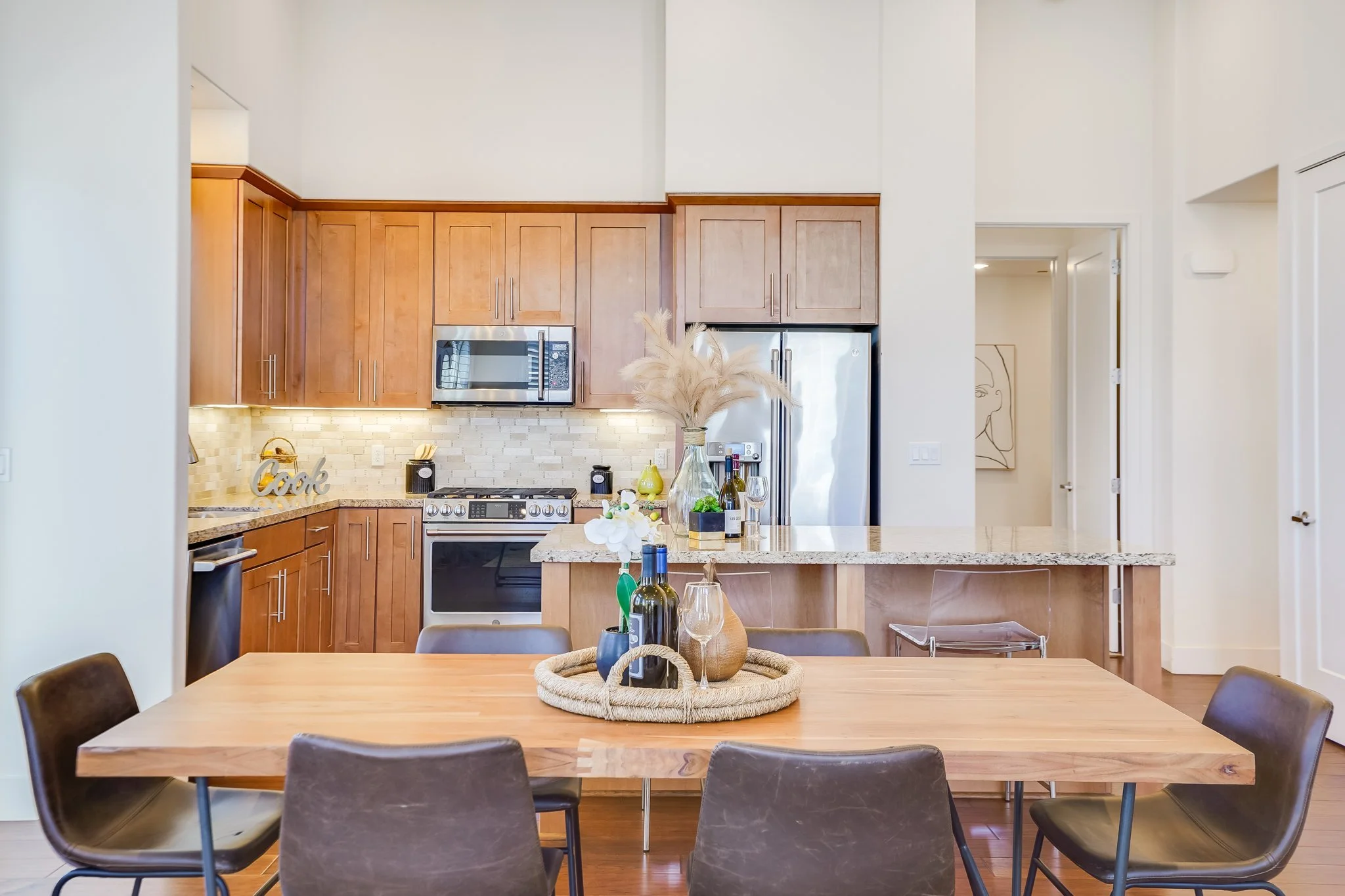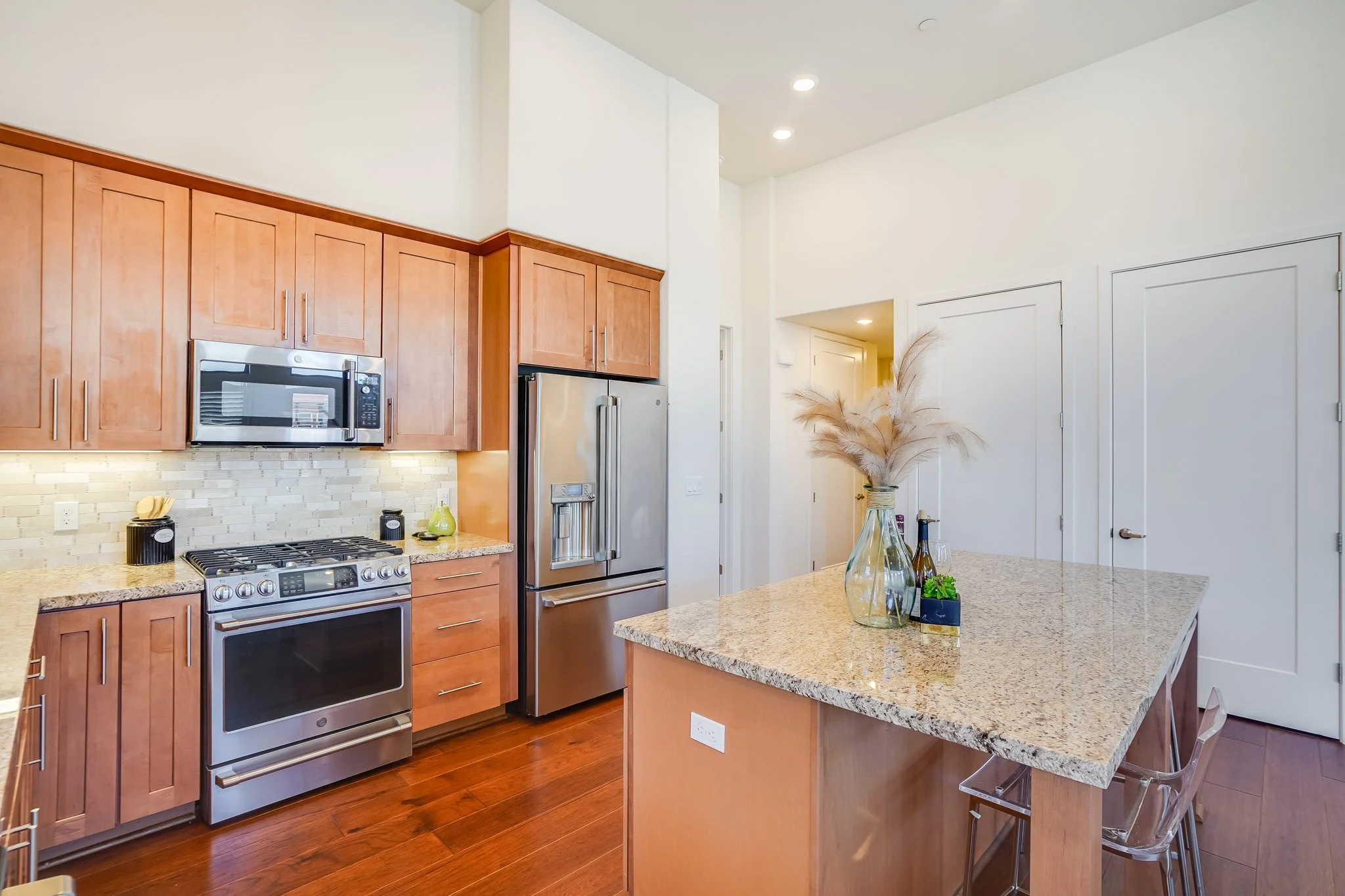 Whether preparing a favorite dish or enjoying a quick bite, the granite-topped island enhances every meal in the gourmet kitchen featuring an abundance of shaker cabinets and a full suite of stainless steel appliances.
