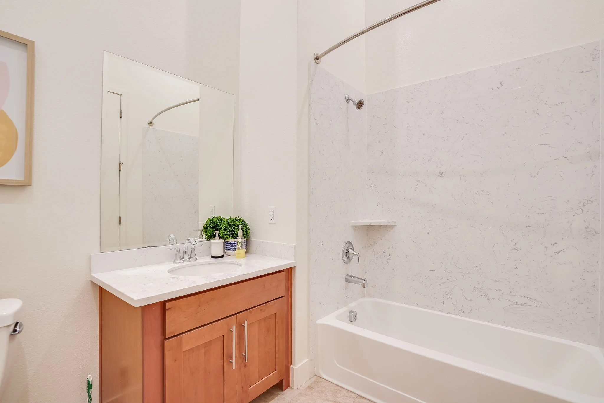 The desirable split-bedroom floor plan will grant peace as well as privacy. The guest bedroom, a hall bath with a shower-tub combo, and laundry reside on one side of the unit, while the primary bedroom is on the other.