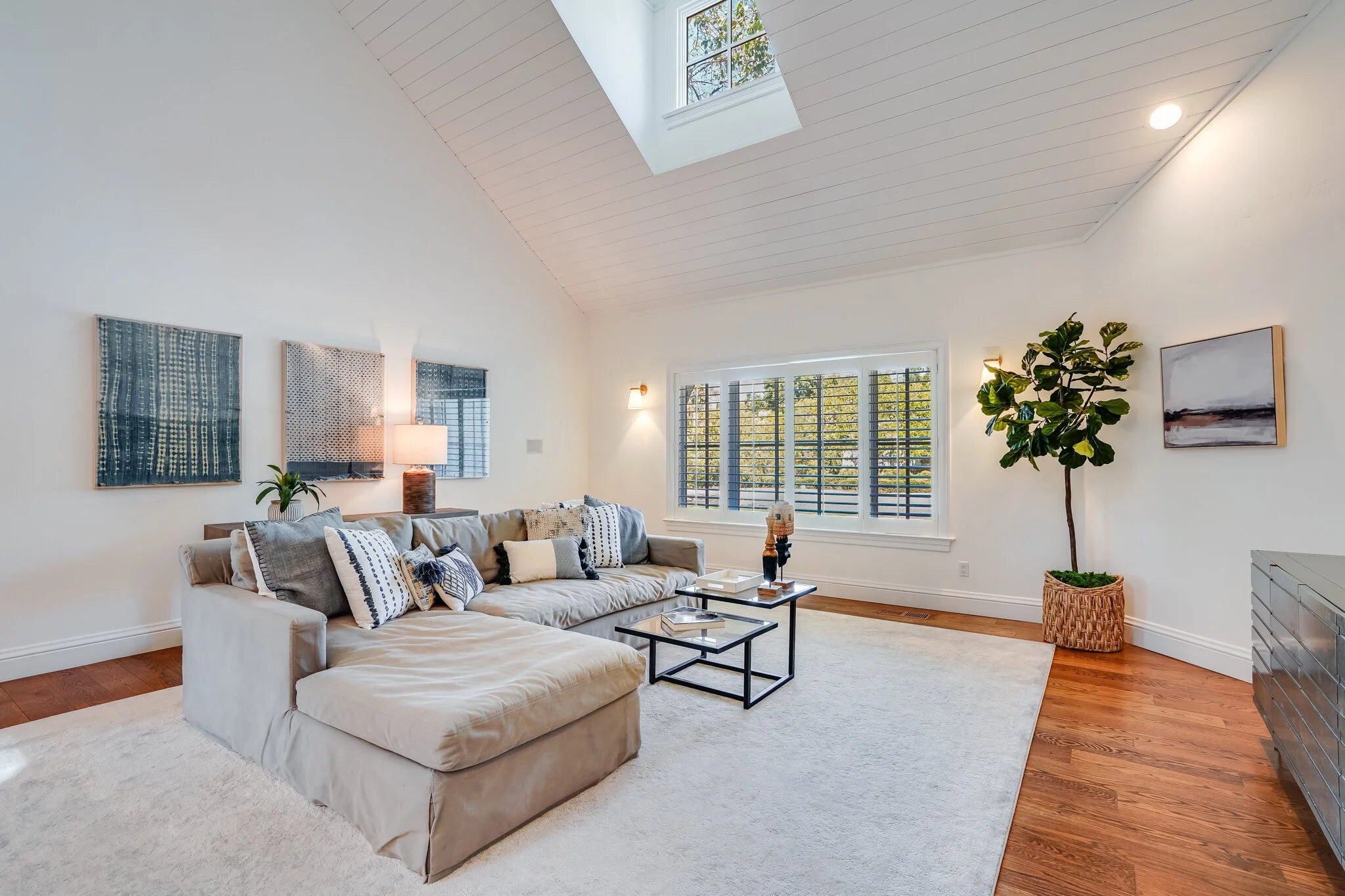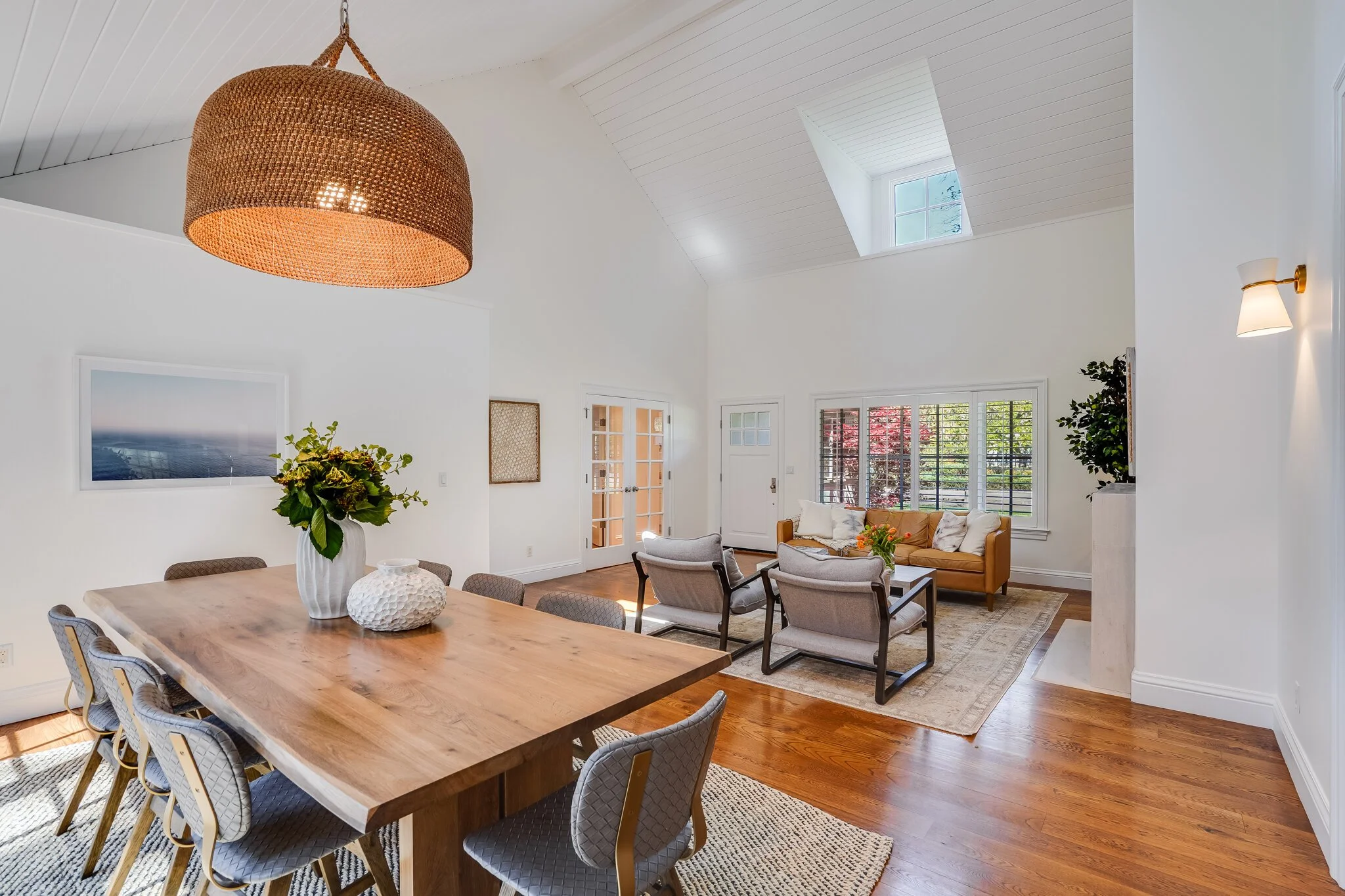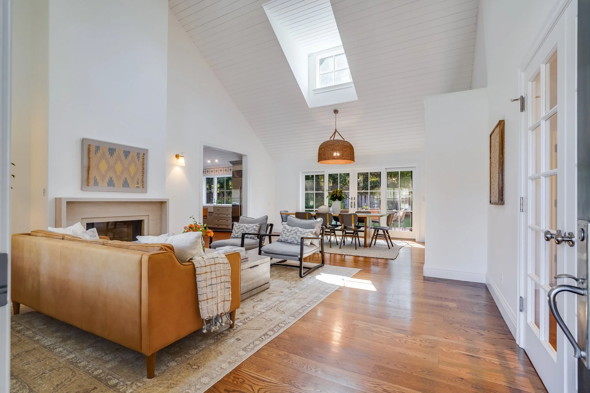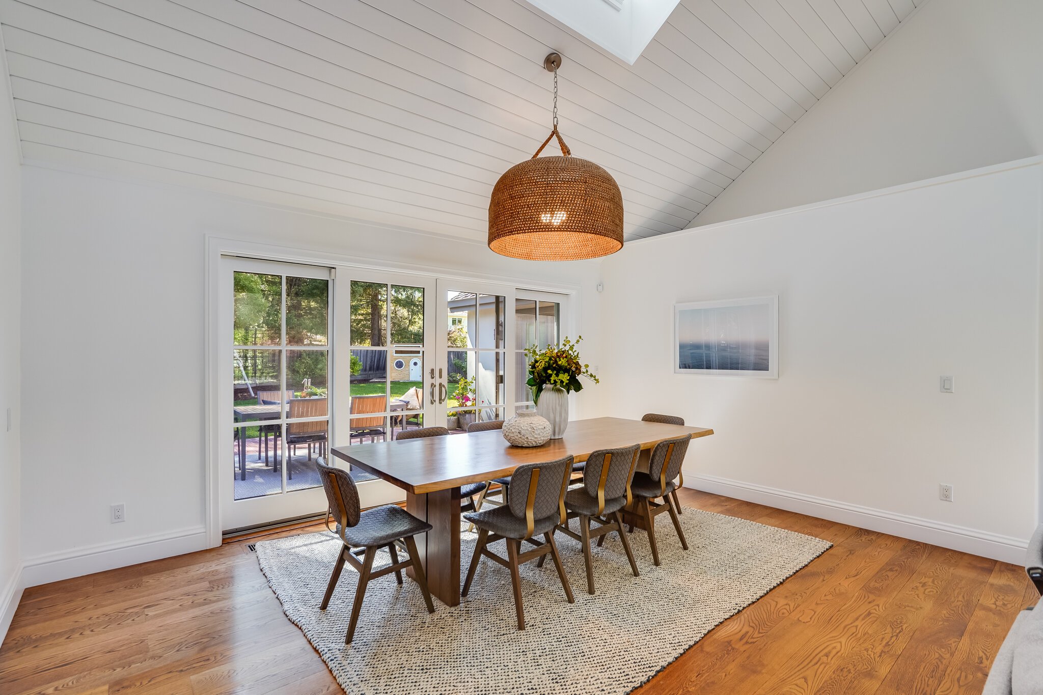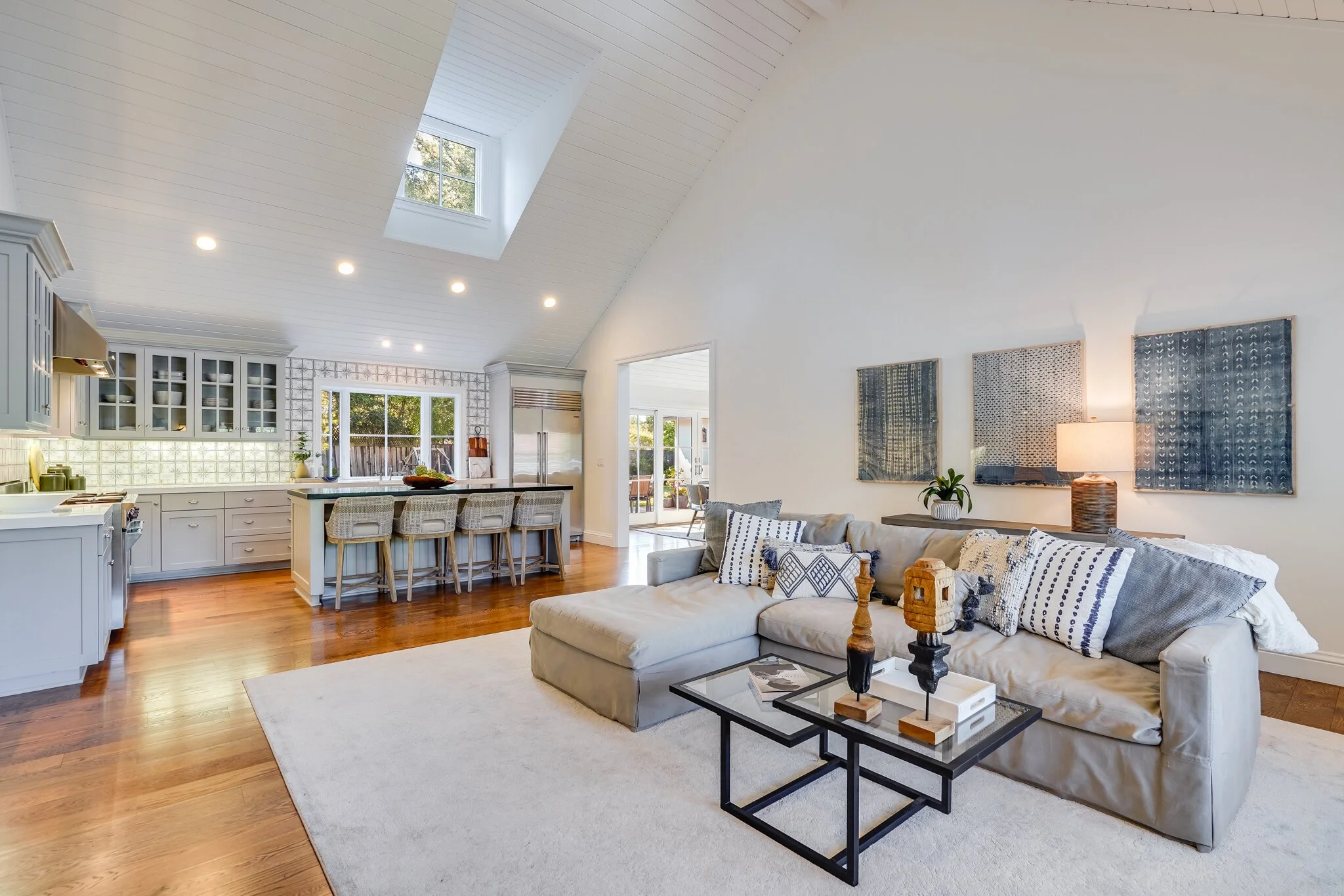 Enters onto a great room with high vaulted wood ceilings and incredible natural light, with broad windows and French doors for an indoor-outdoor feel