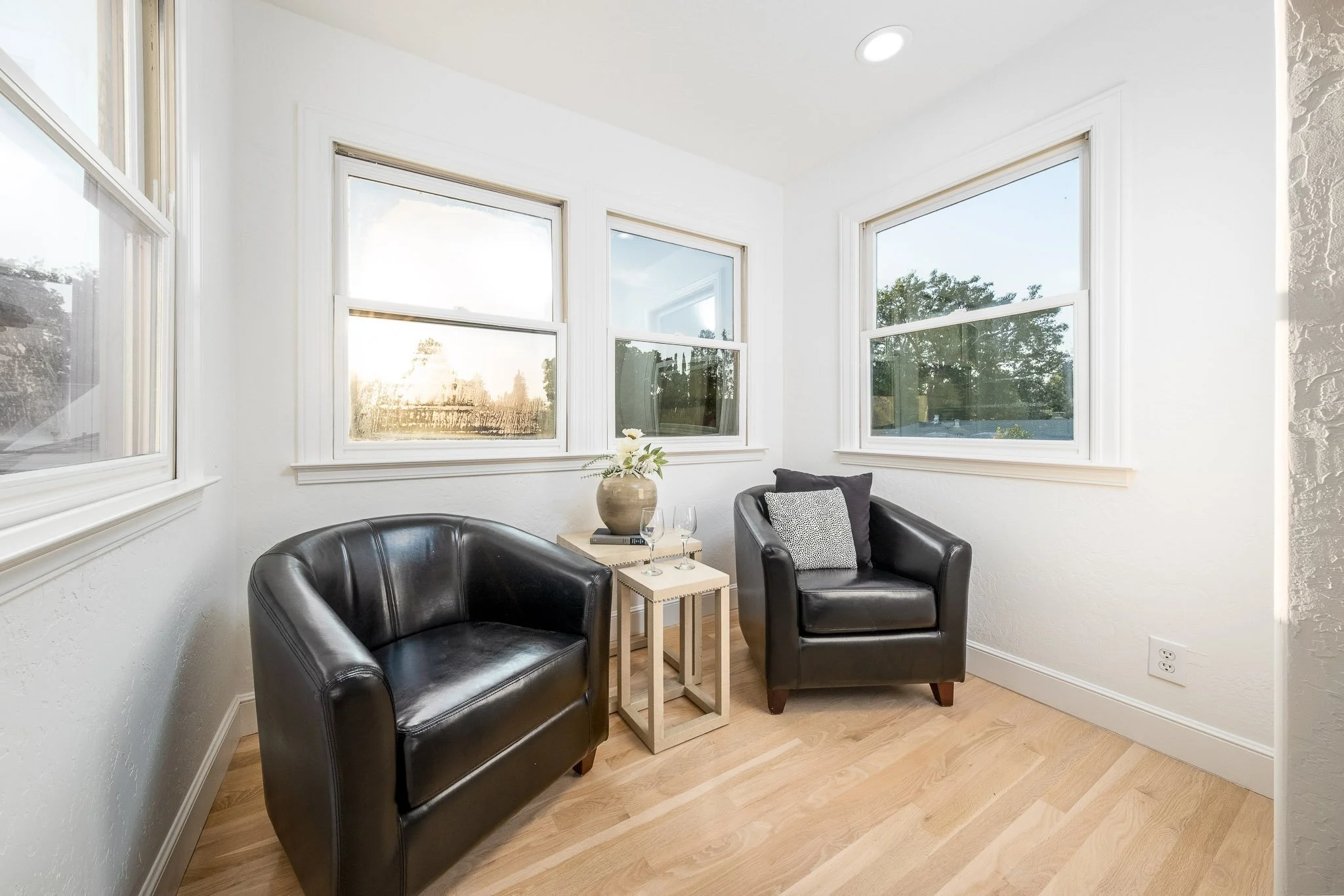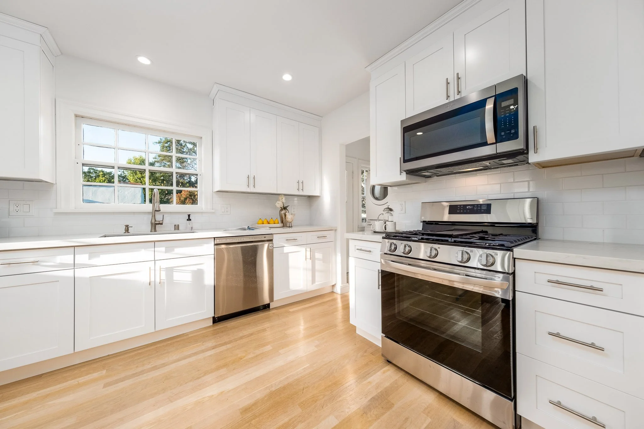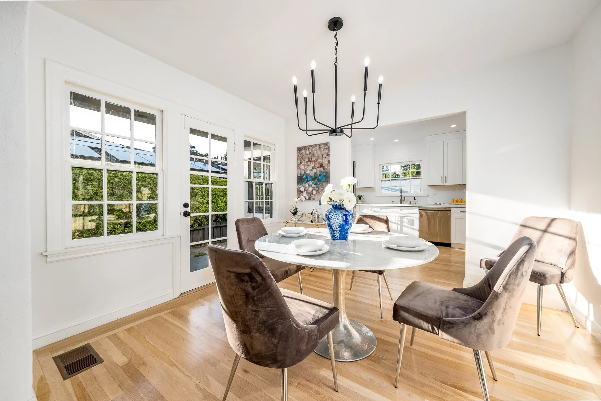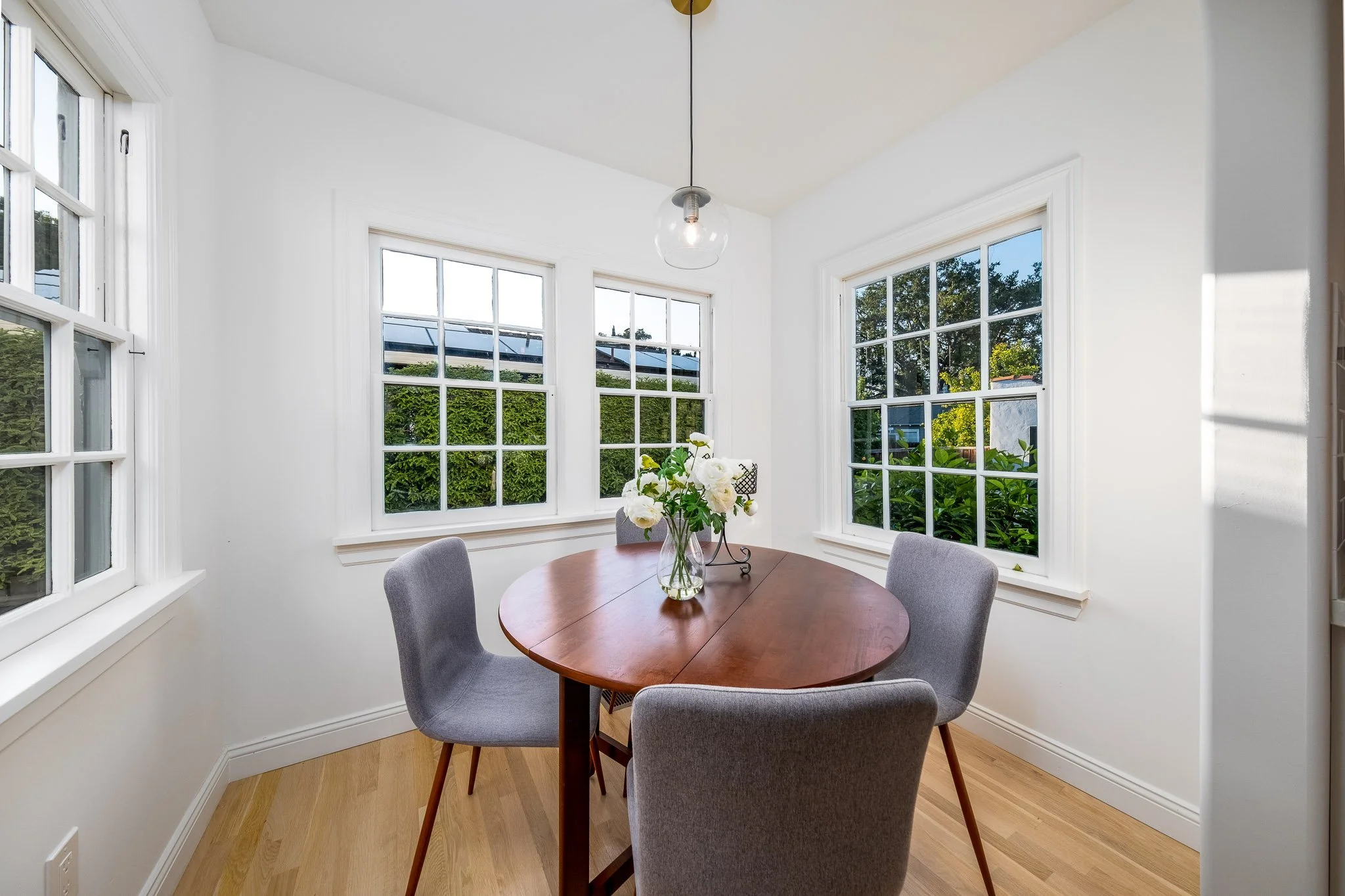 Breakfast nook off the remodeled kitchen with shaker cabinets, quartz countertops, stainless steel appliances