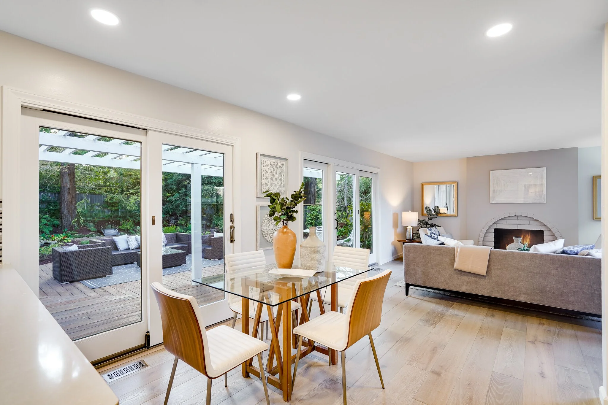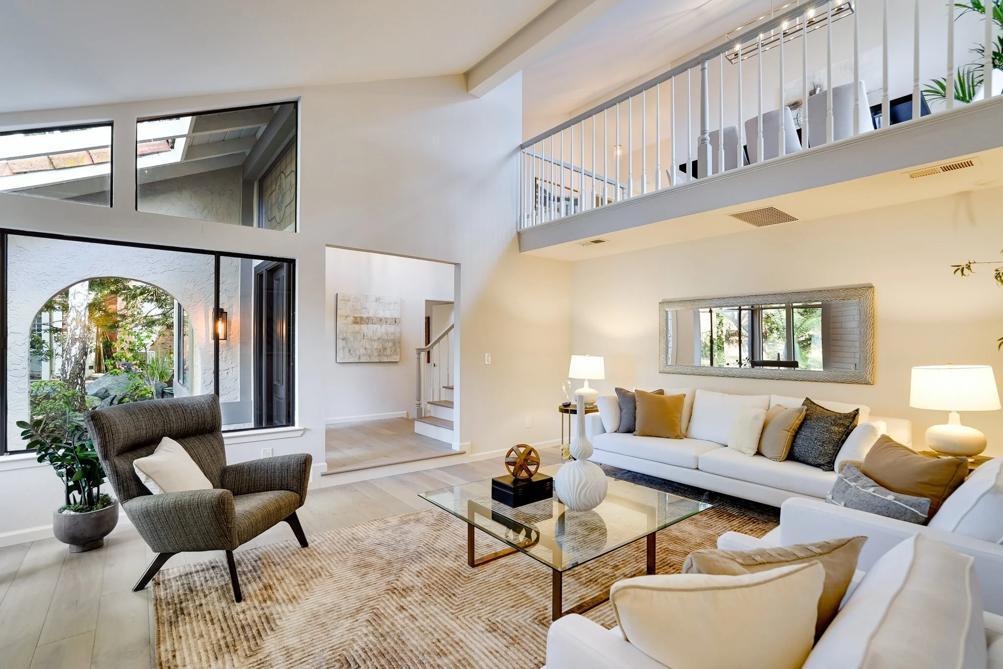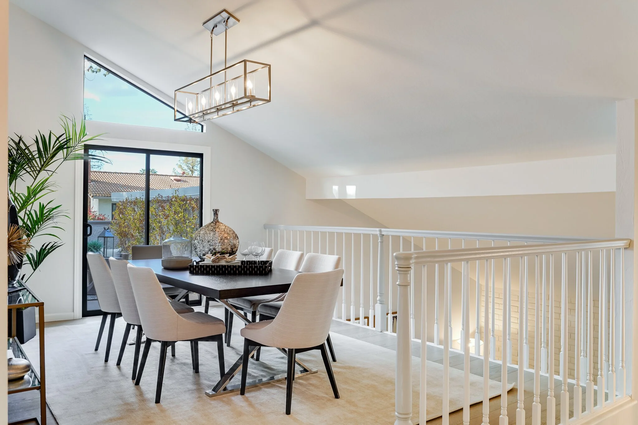 Perfect for entertaining both large and small gatherings, the spacious living room below is connected by soaring vaulted ceilings to the dining room above that features modern lighting and patio access