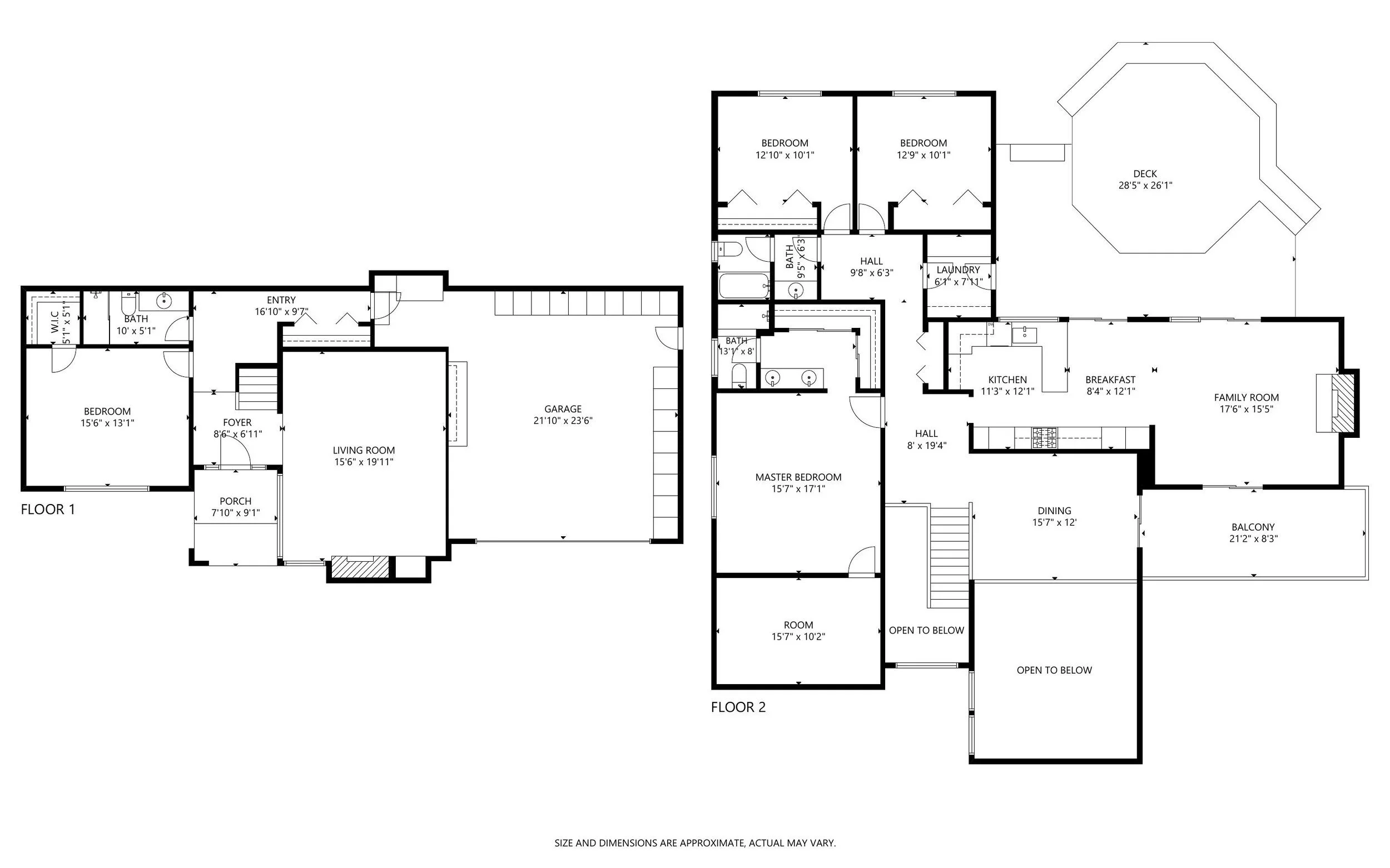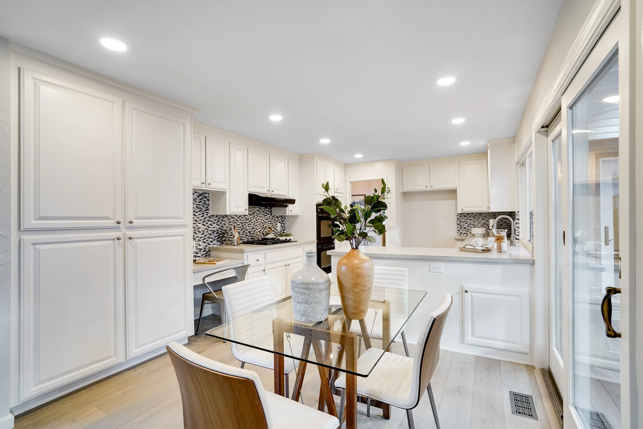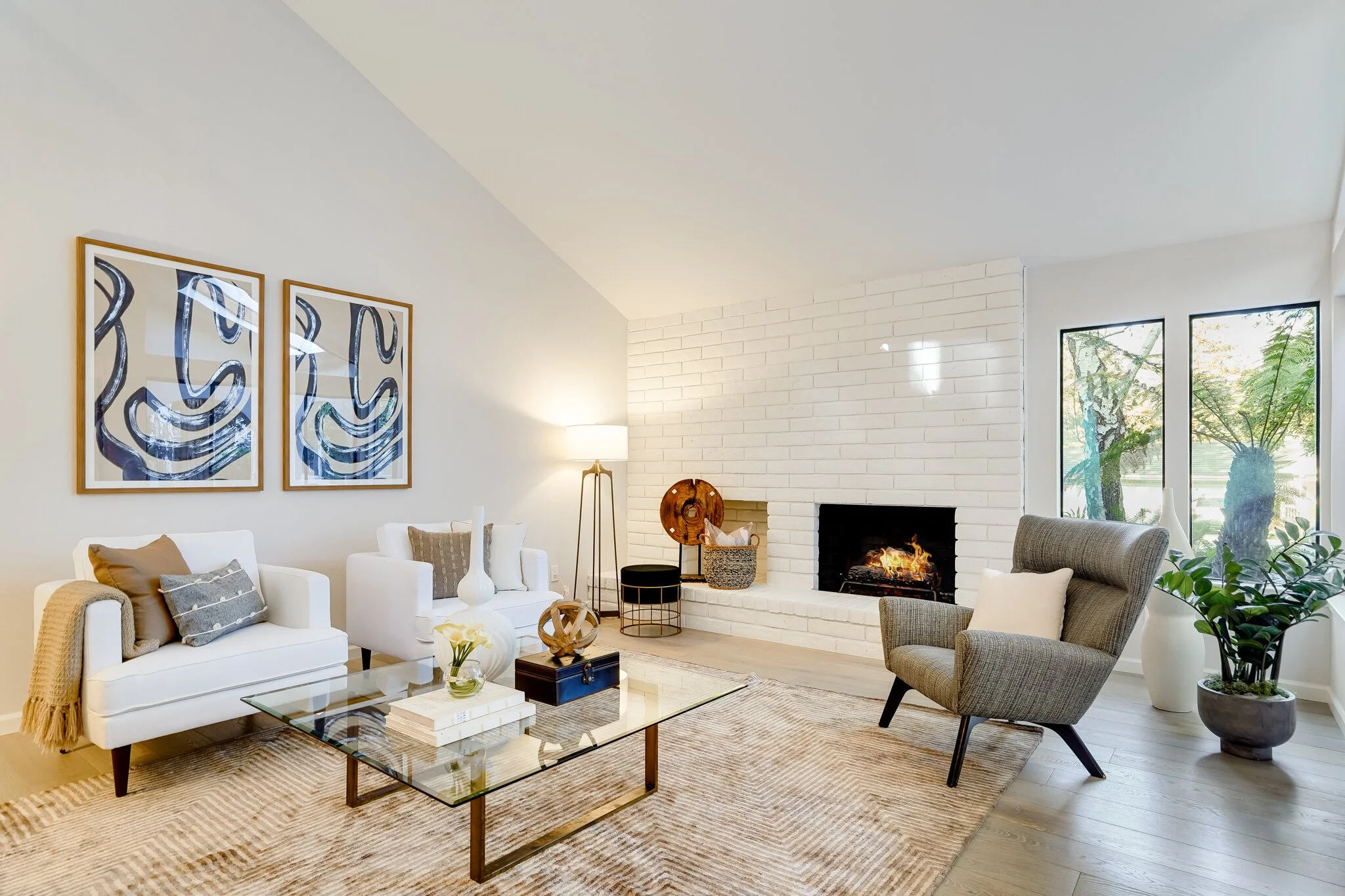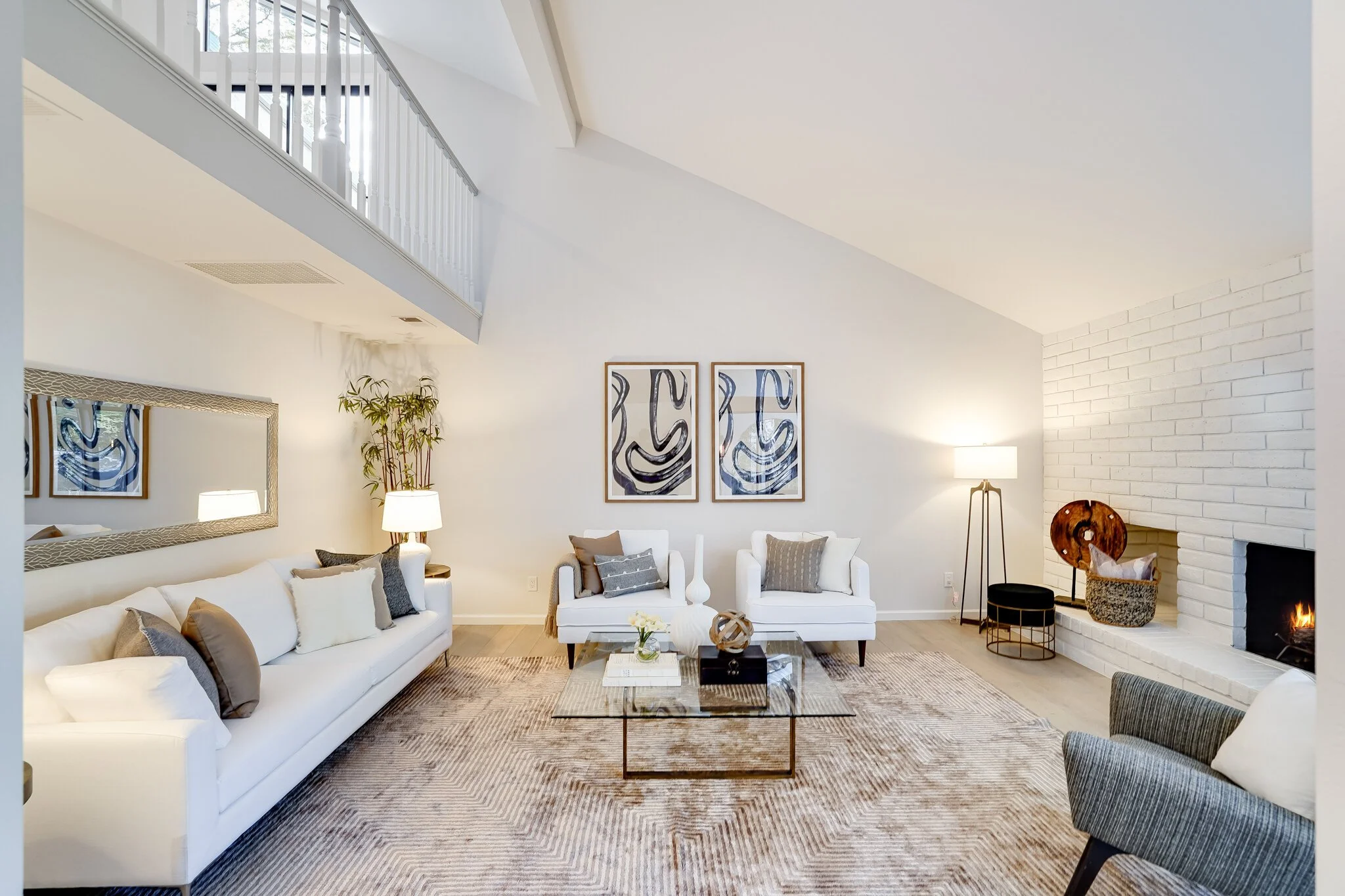 Perfect for entertaining both large and small gatherings, the spacious living room below is connected by soaring vaulted ceilings to the dining room above that features modern lighting and patio access