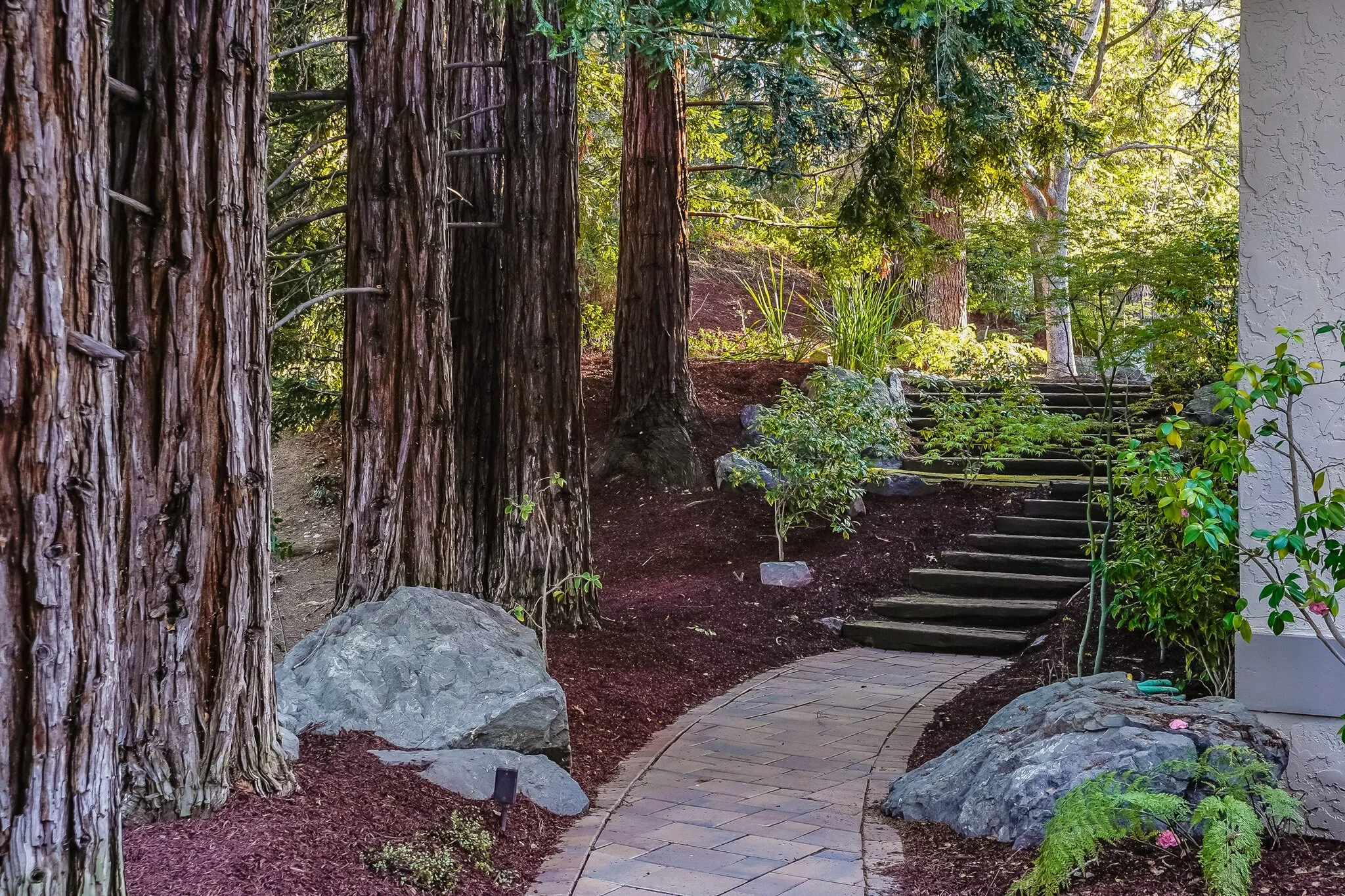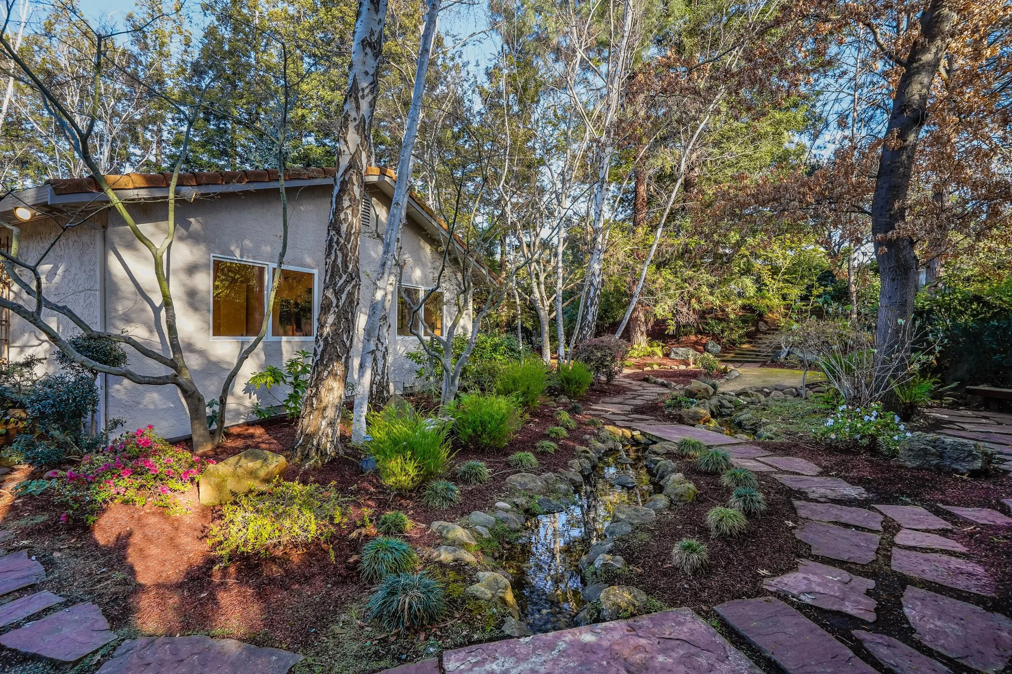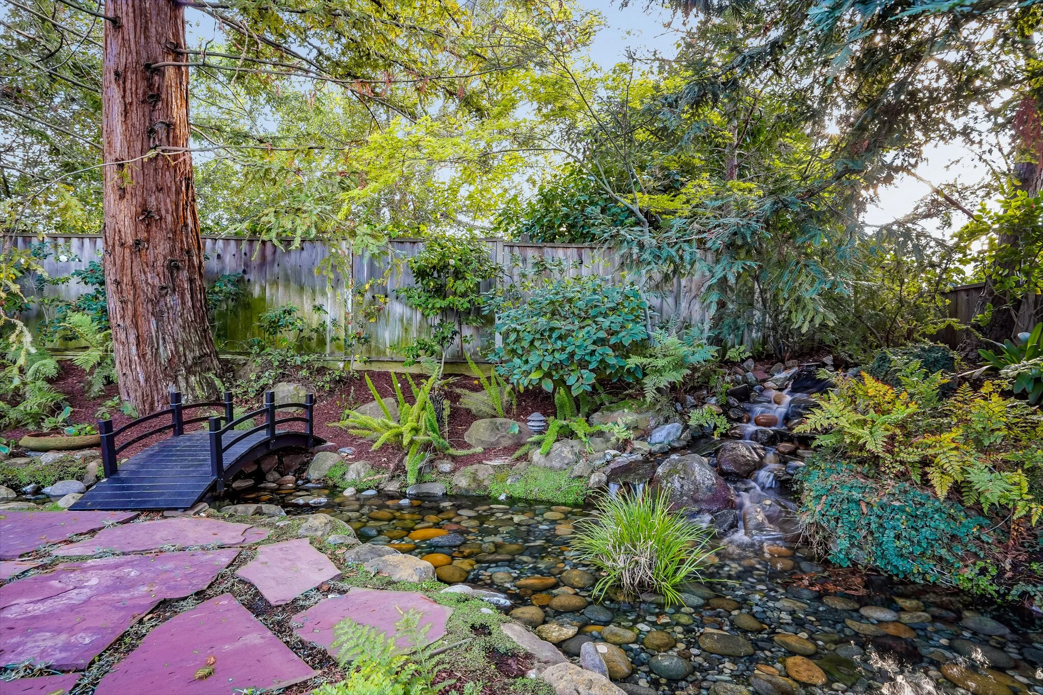 Surrounded by mature redwoods, the backyard forms a magical getaway showcasing romantic footpaths, a babbling brook with waterfall, and multiple seating areas