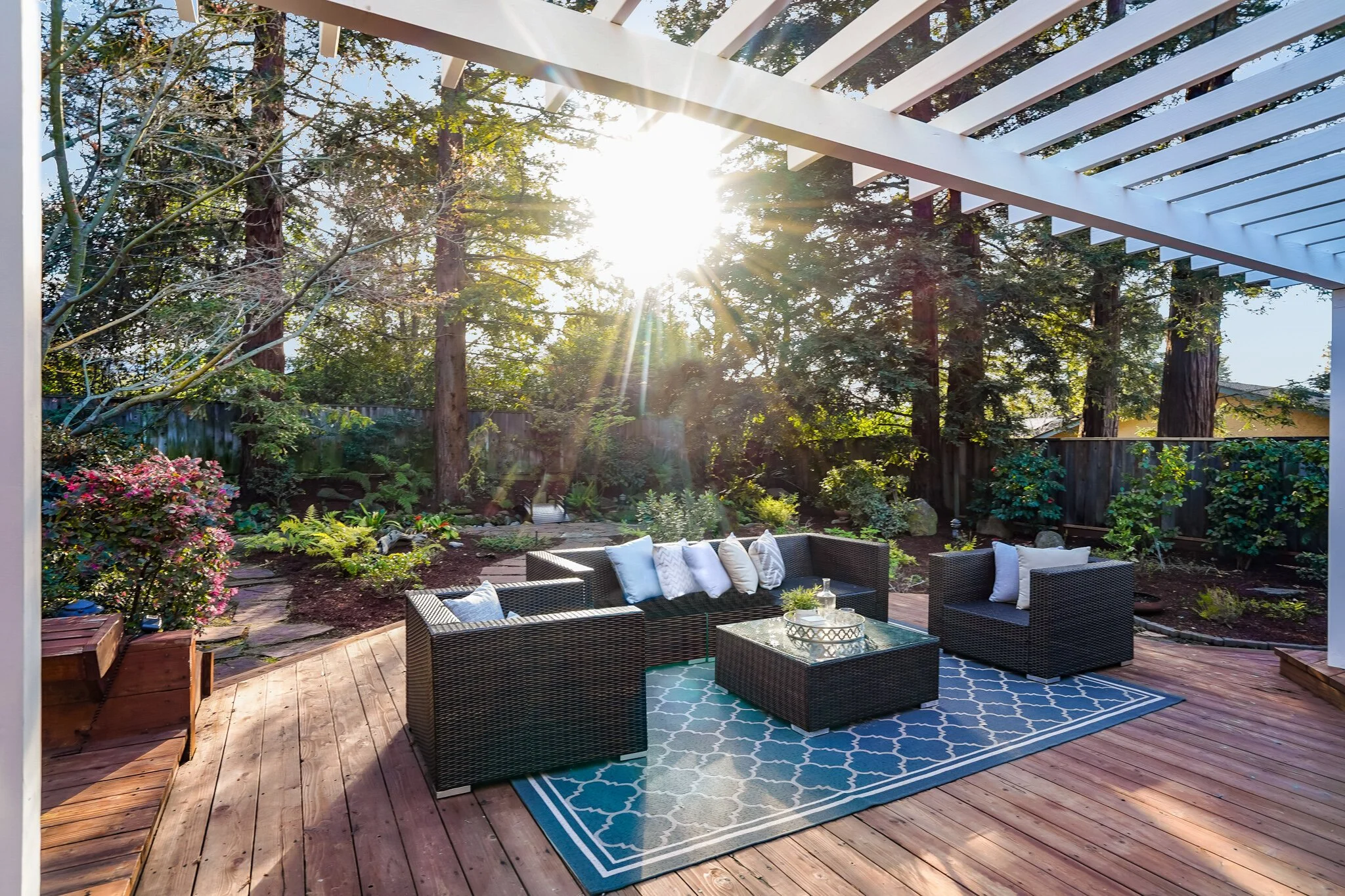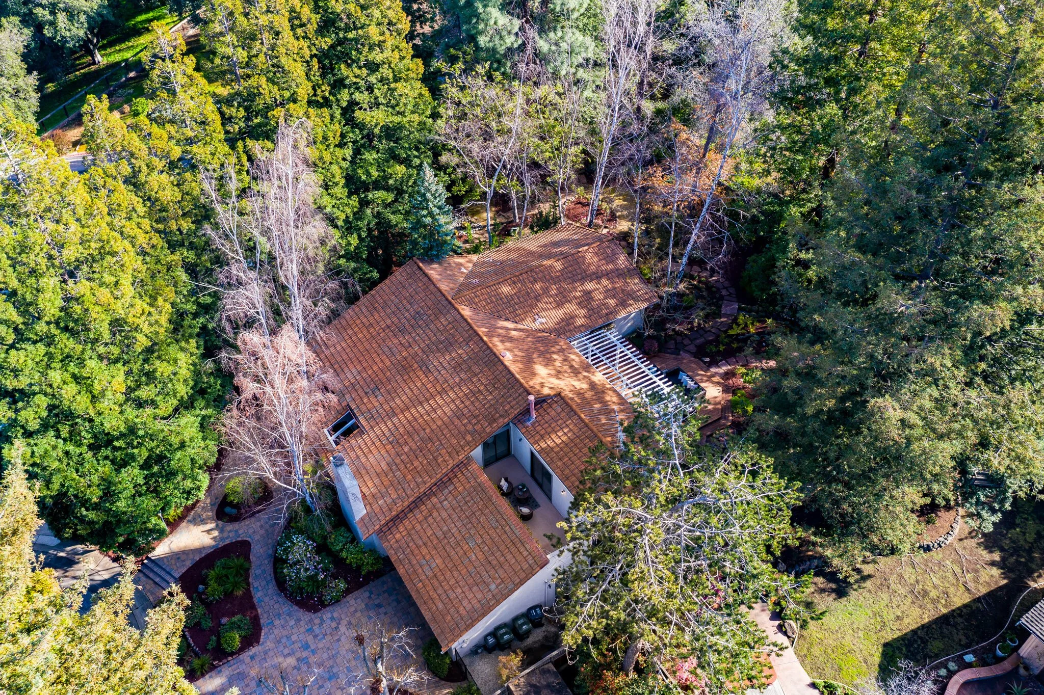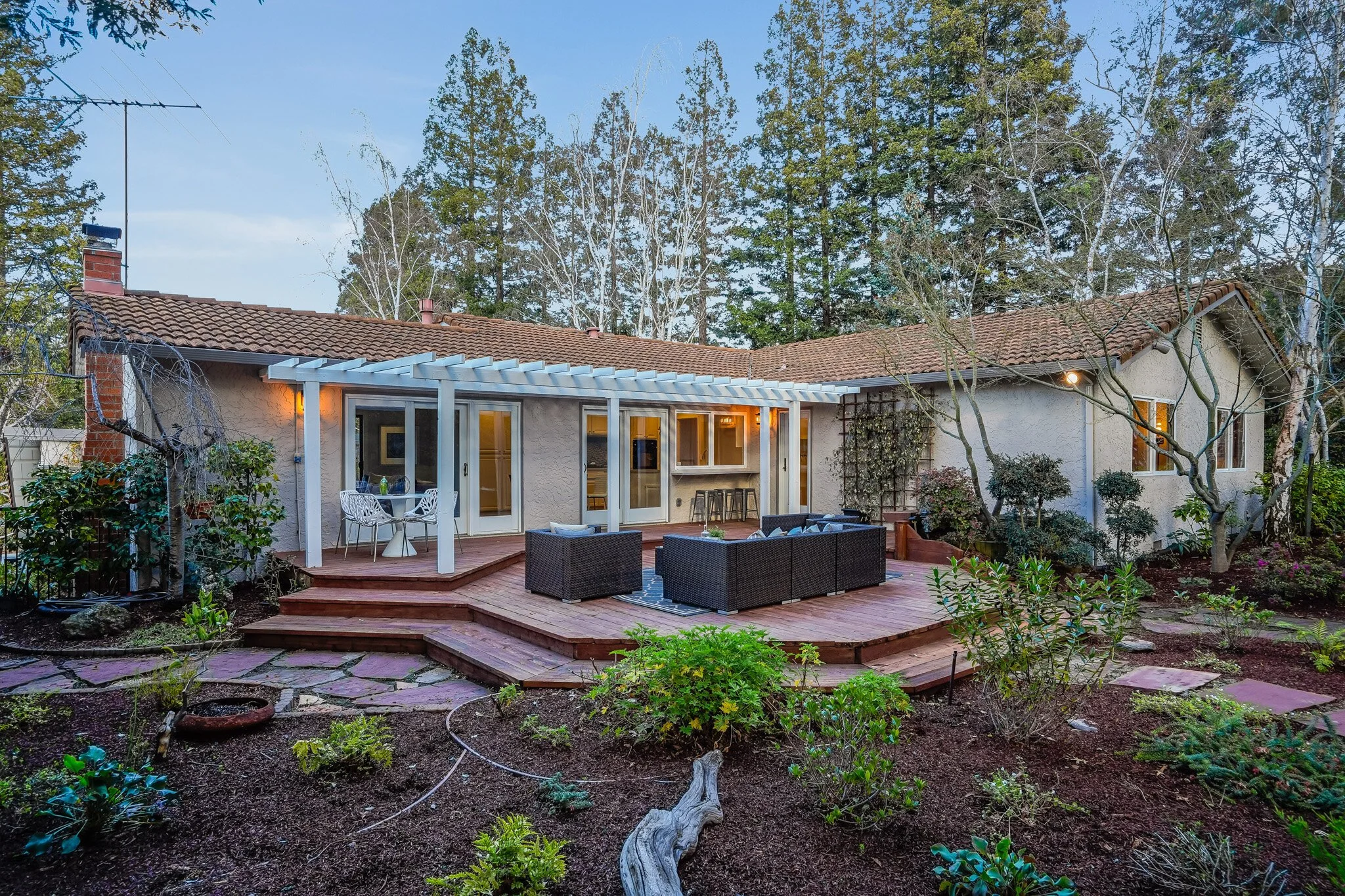 Surrounded by mature redwoods, the backyard forms a magical getaway showcasing romantic footpaths, a babbling brook with waterfall, and multiple seating areas