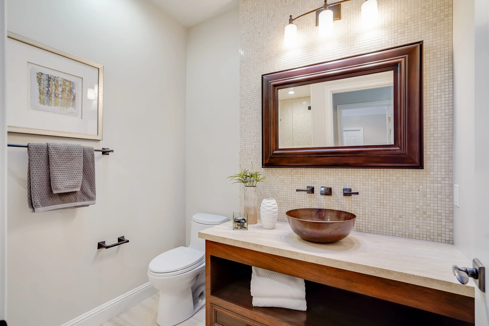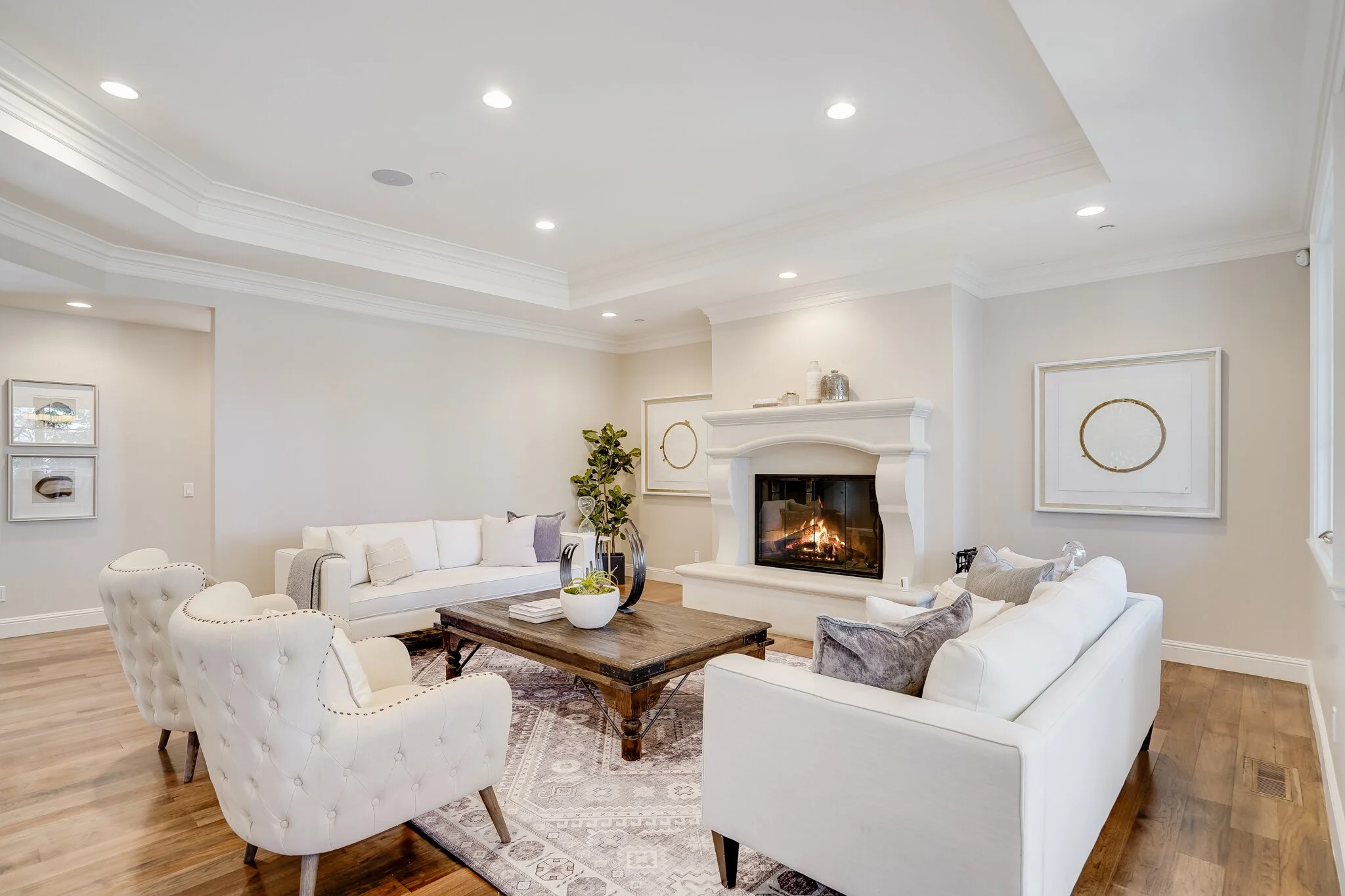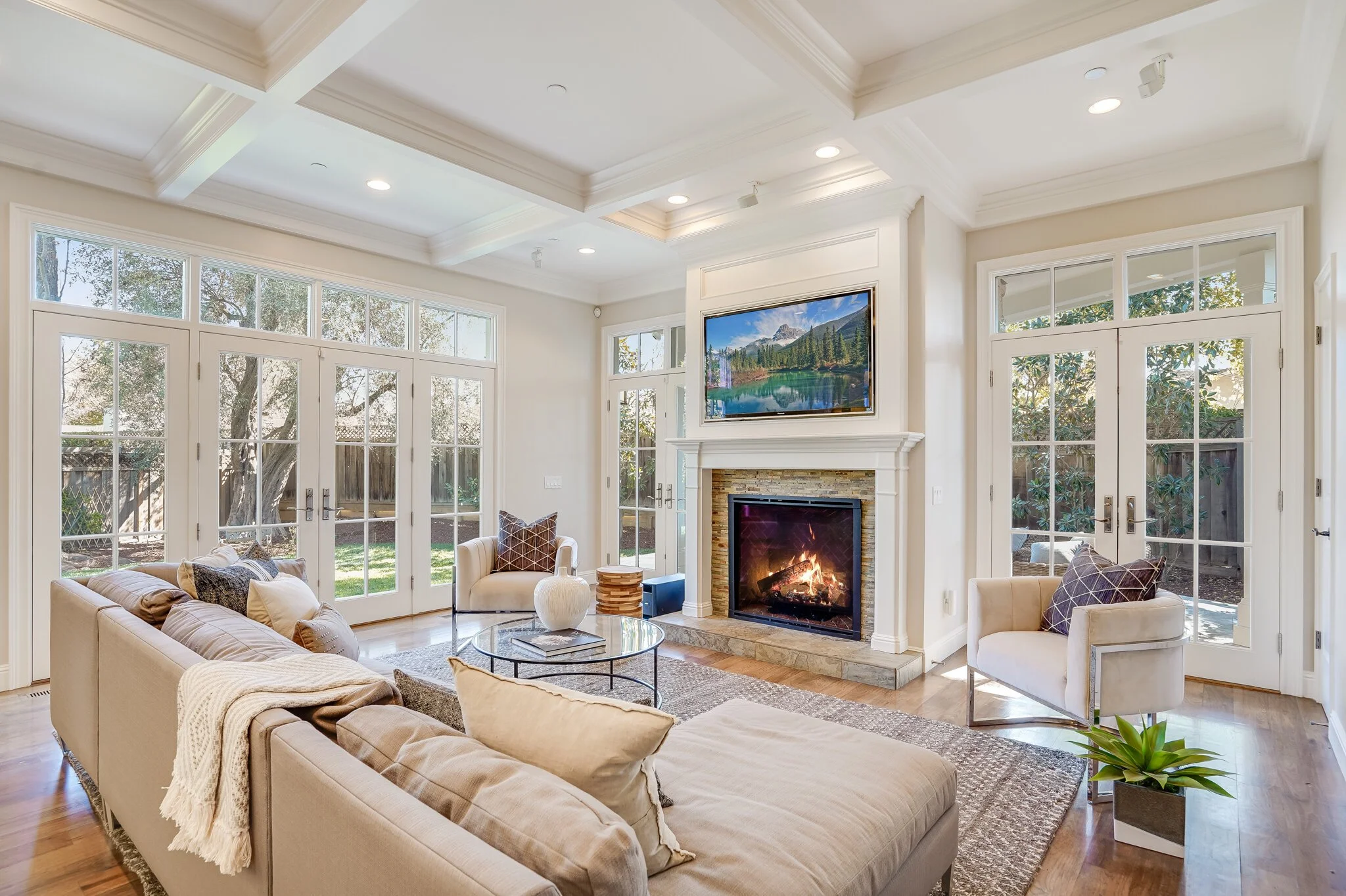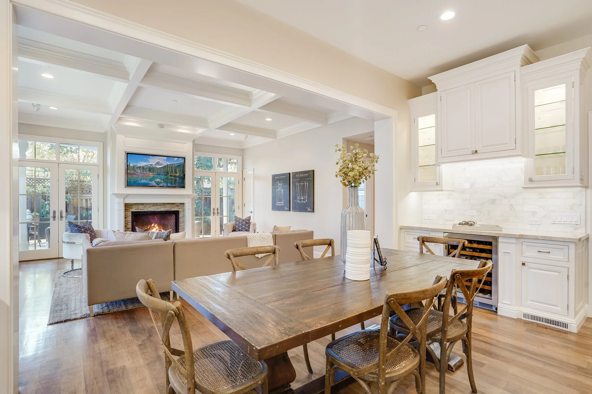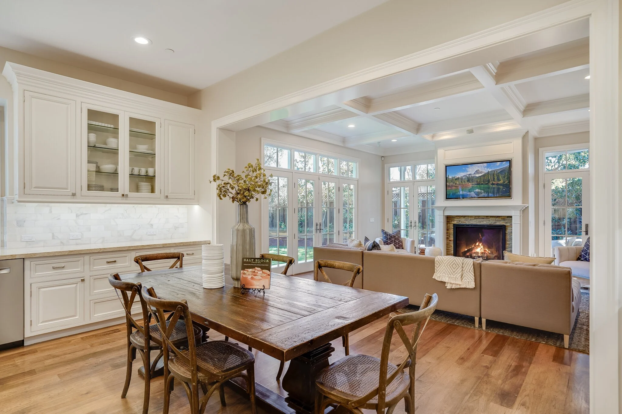 Thoughtful details include fire sprinklers throughout the house & underground utilities, hot water recirculation pump, custom-stained hickory hardwood floors, Baldwin hardware, and Ring doorbell and outdoor security cameras
