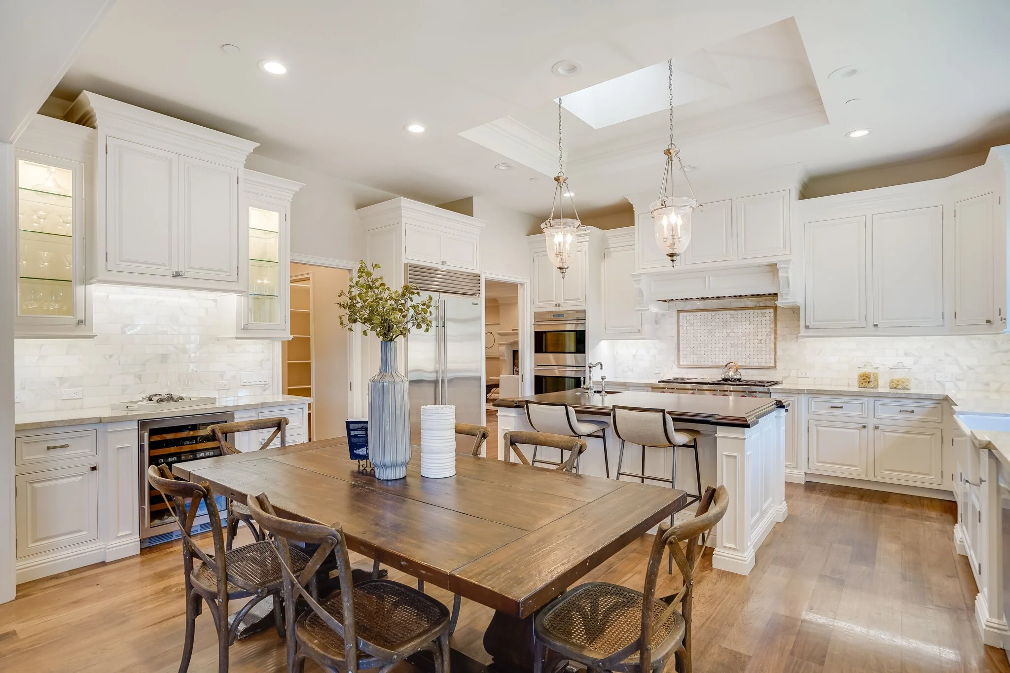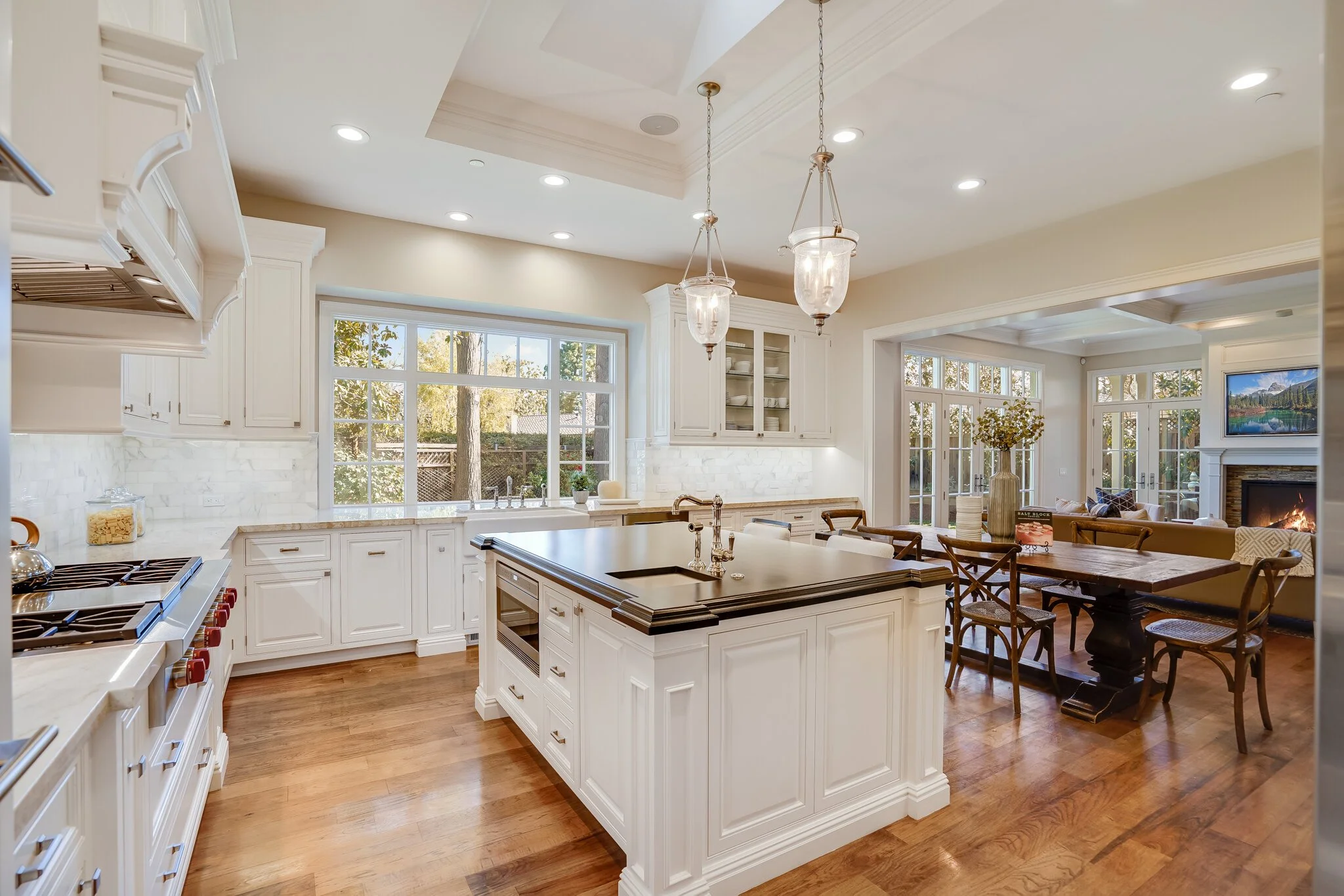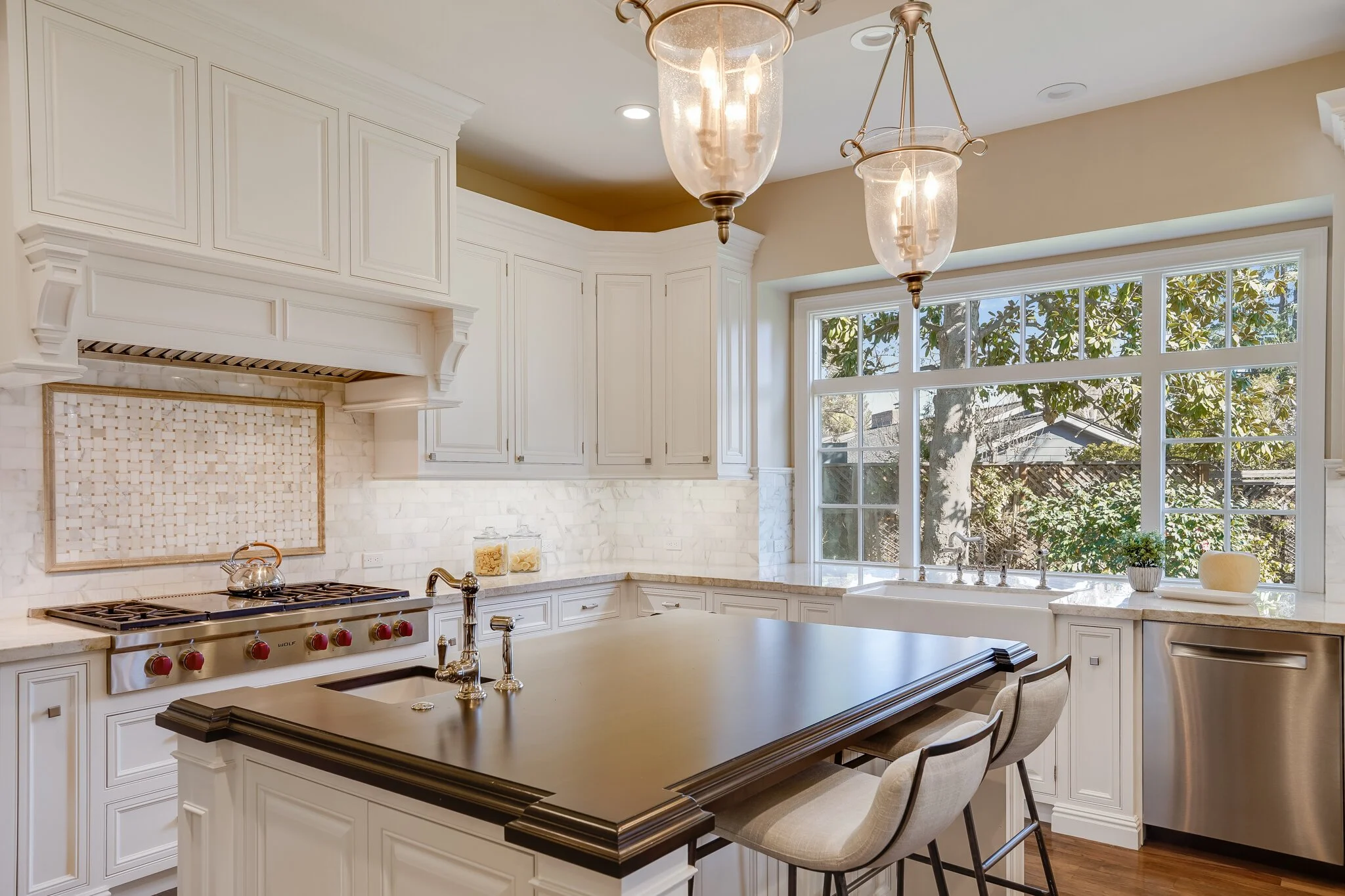 High-end kitchen appliances include Wolf double-oven, warming drawer, built-in microwave drawer, six-burner stove with griddle, Sub-Zero fridges, and new Bosch dishwasher