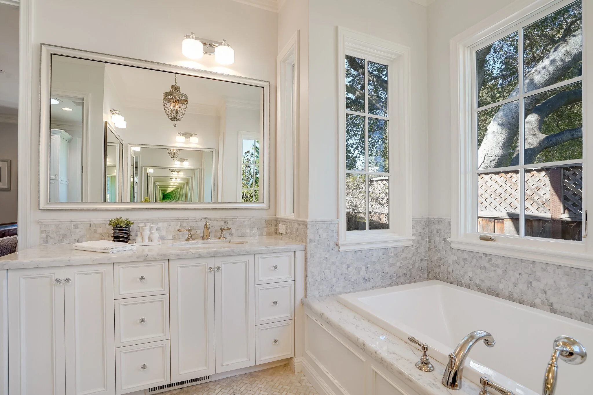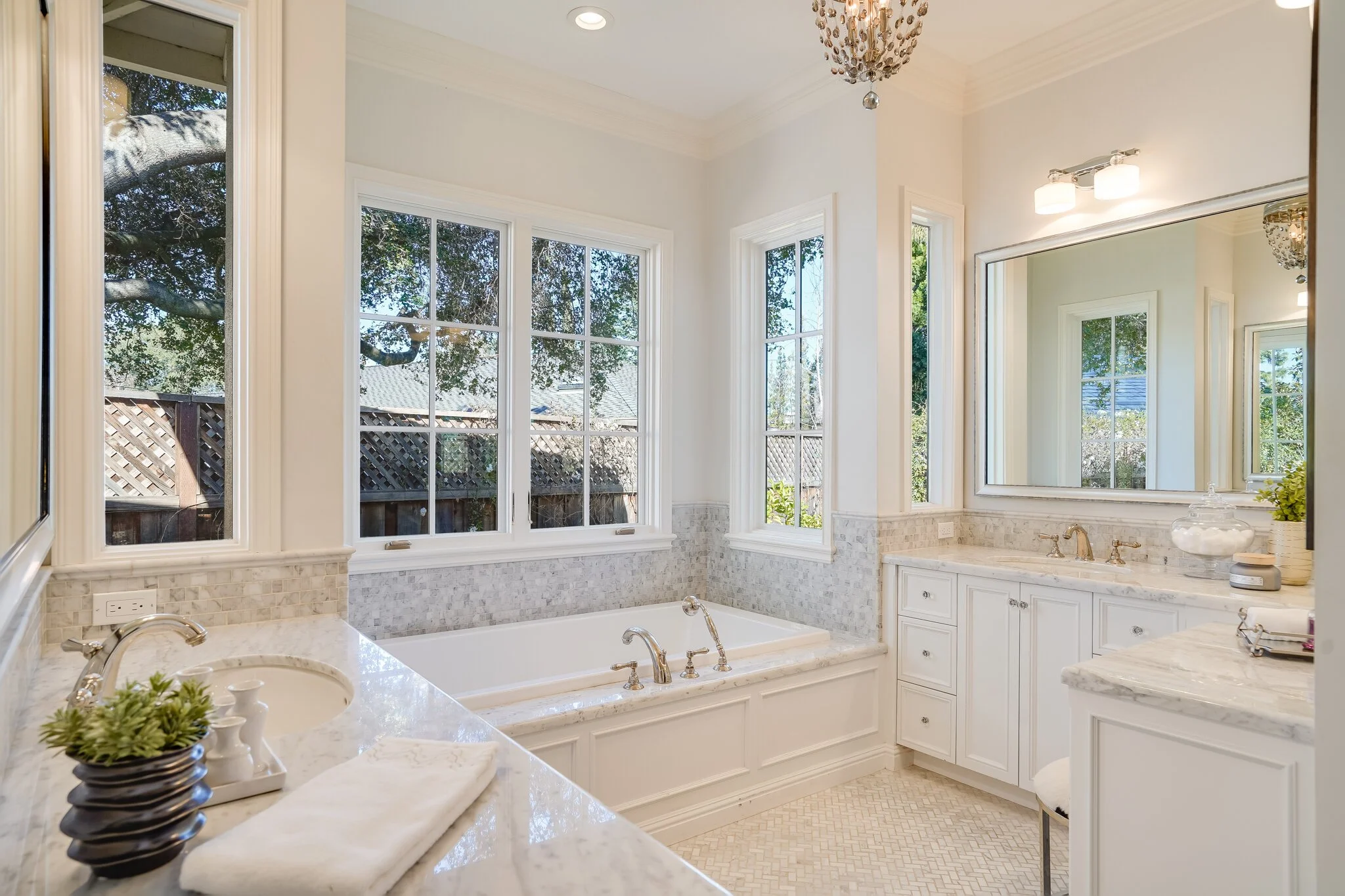 Master bath features marble stone, seated vanity, custom drawers, Rohl fixtures, walk-in shower with dual standing shower and large soaking tub