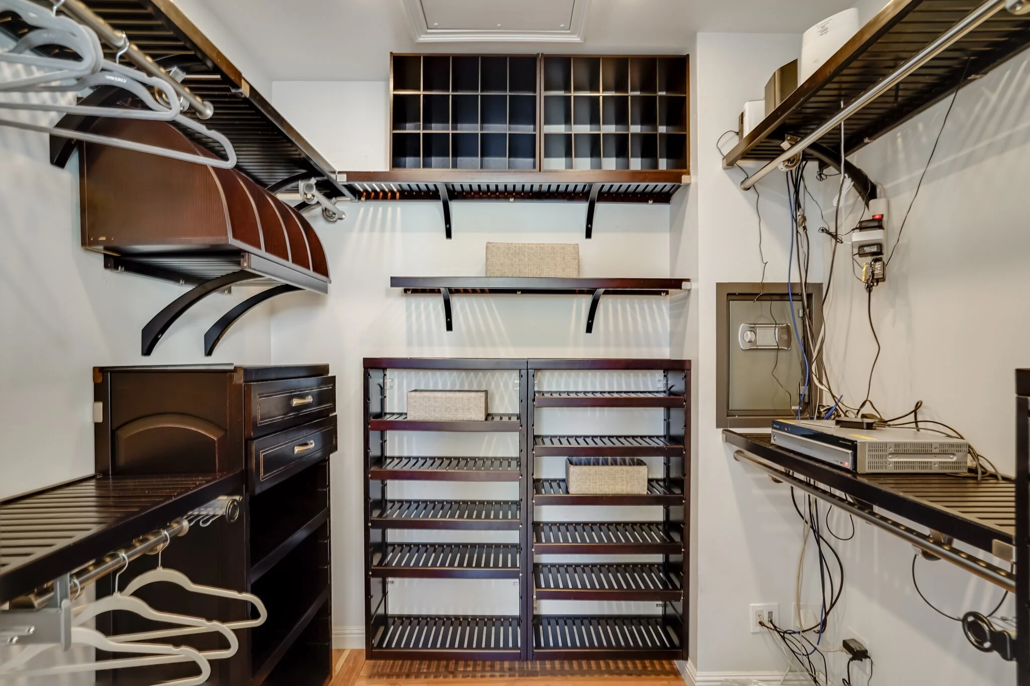 Master bedroom boasts wall safe, partial cedar floors, walk-in closet with built-ins, and overhead and bedside lights