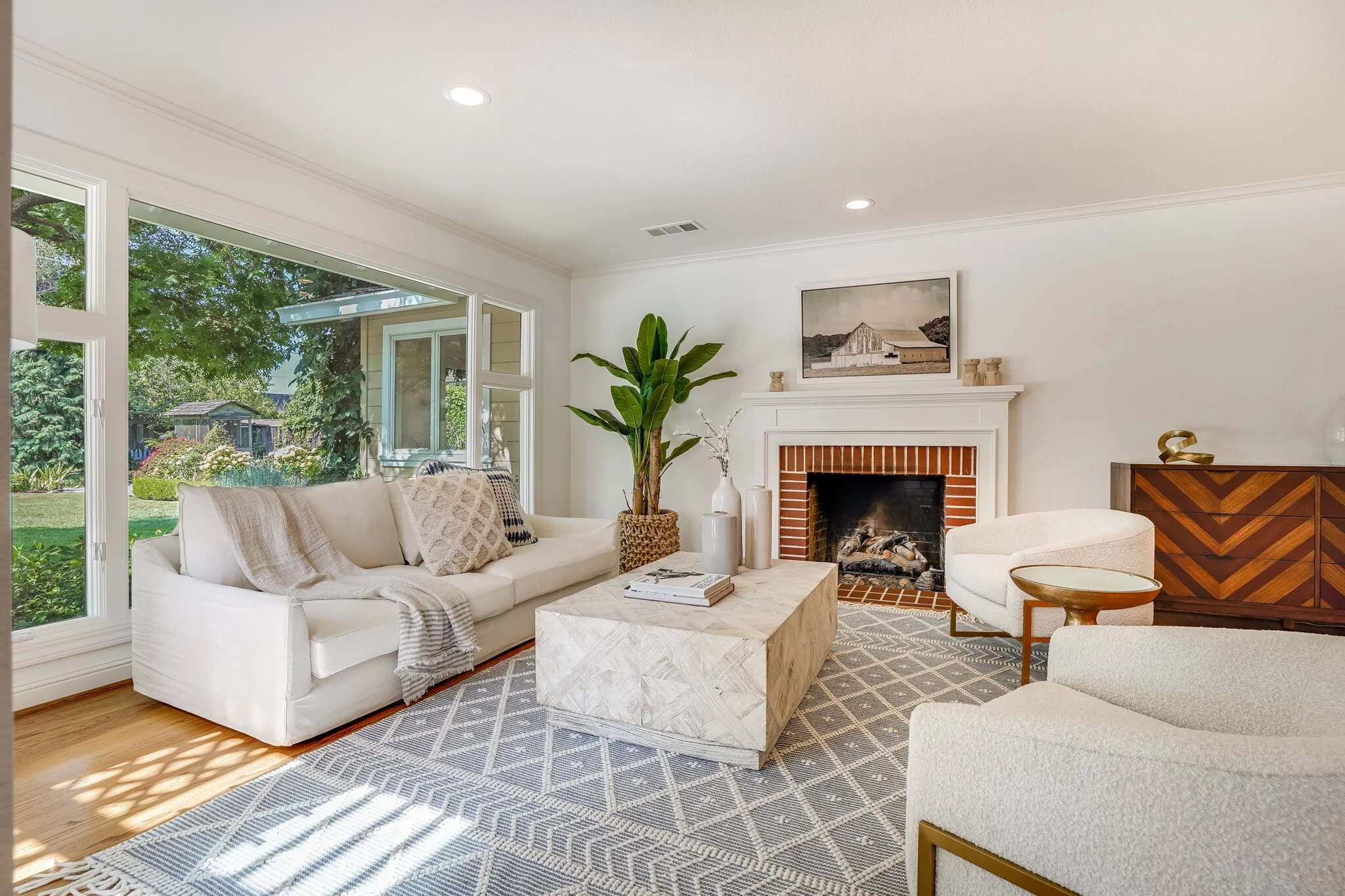 Enter onto a spacious living room with broad picture windows and gas-log fireplace