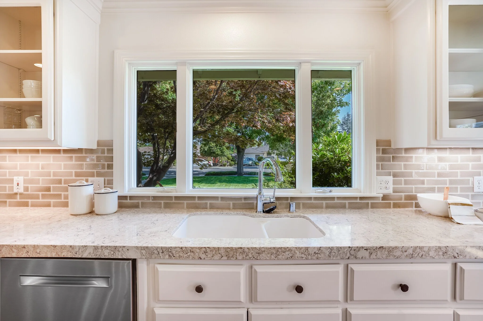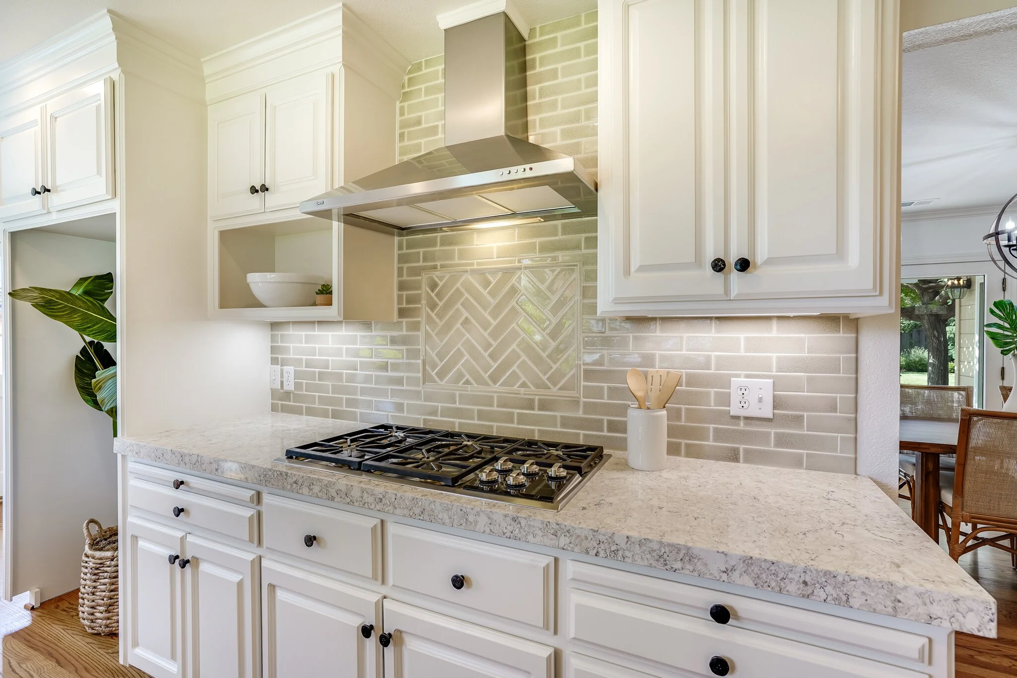 Updated kitchen with stacked ovens, quartz countertops, ample storage and a bright dining nook