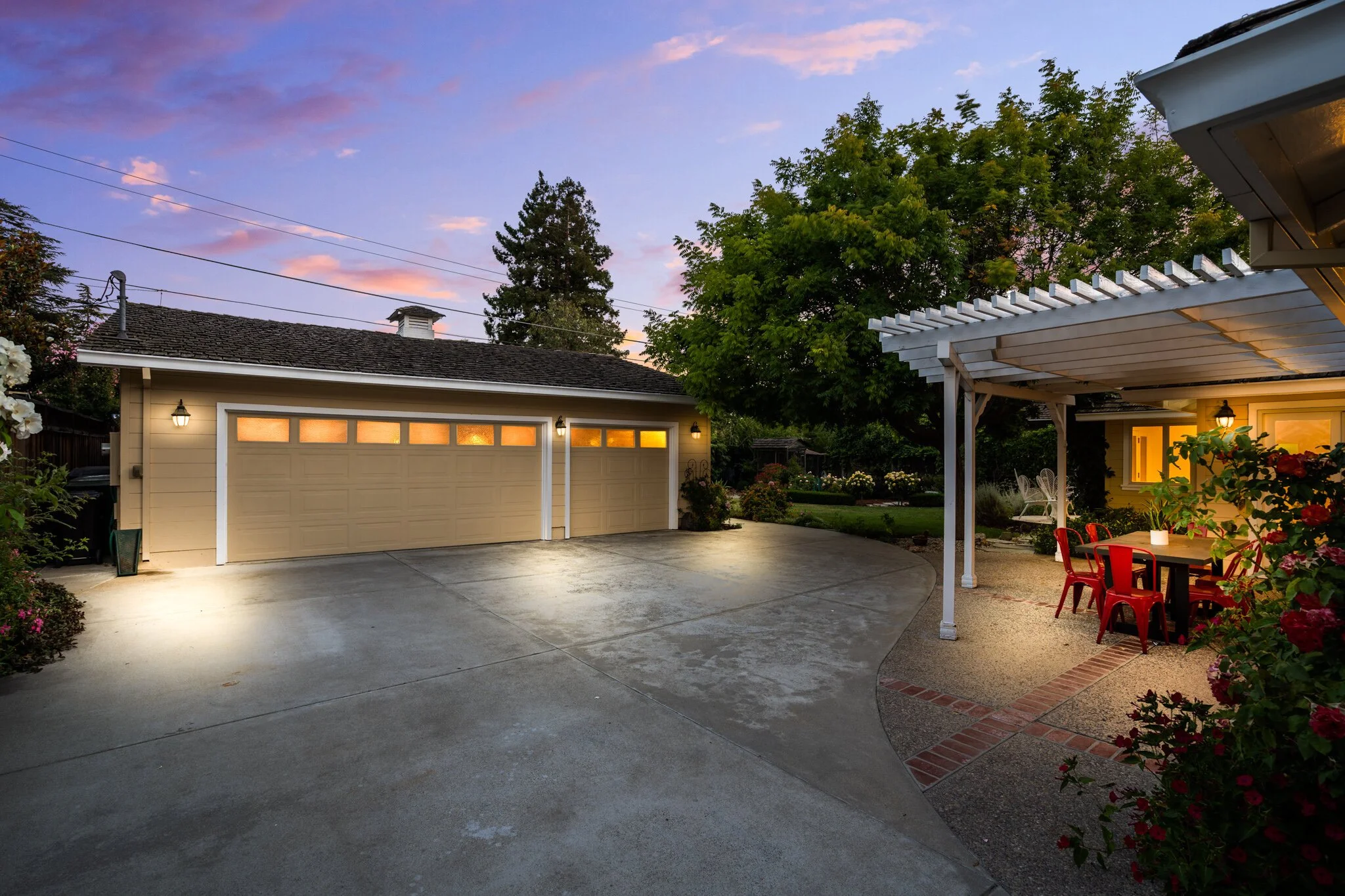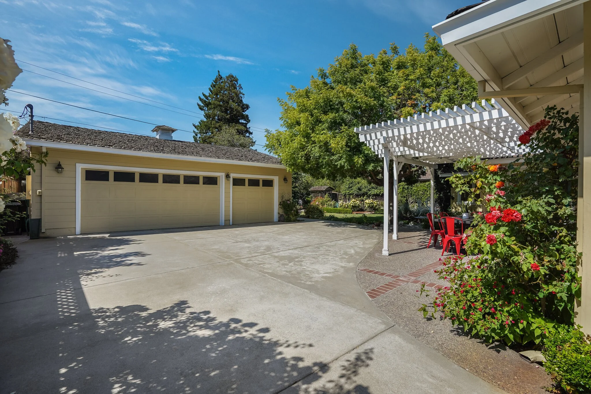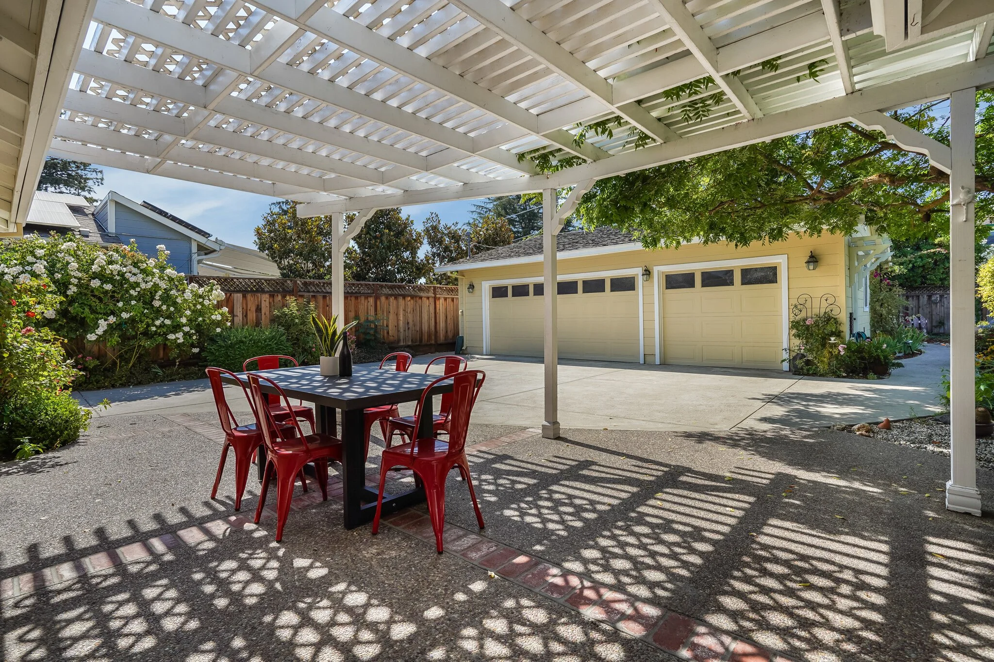 Detached 3-car garage boasts custom built-in storage and workspace, with a covered terrace beside perfect for weekend warriors