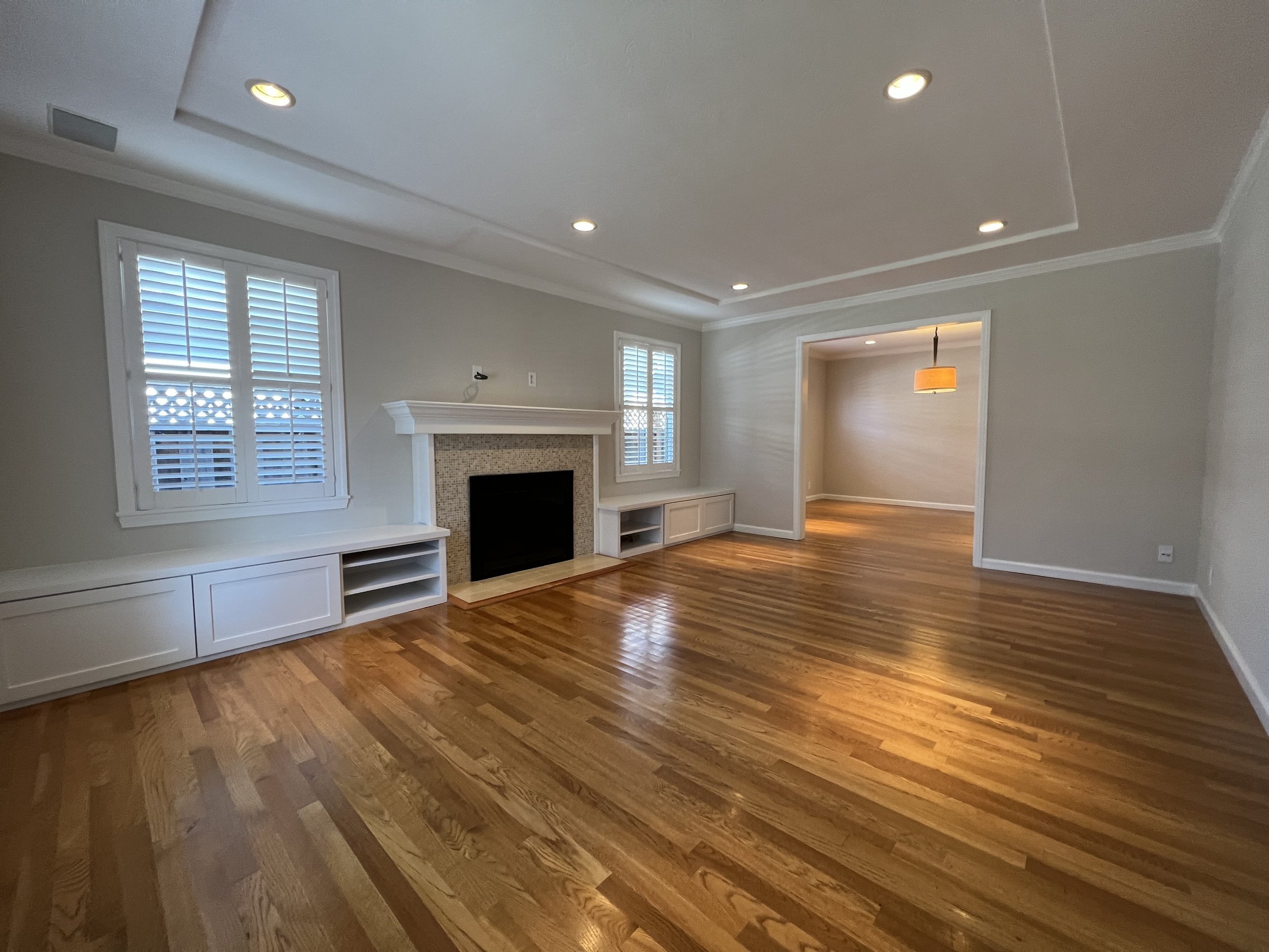 Living room boasts a refinished wood-burning fireplace fitted with built-in benches alongside the wall, offering lounging space and additional storage