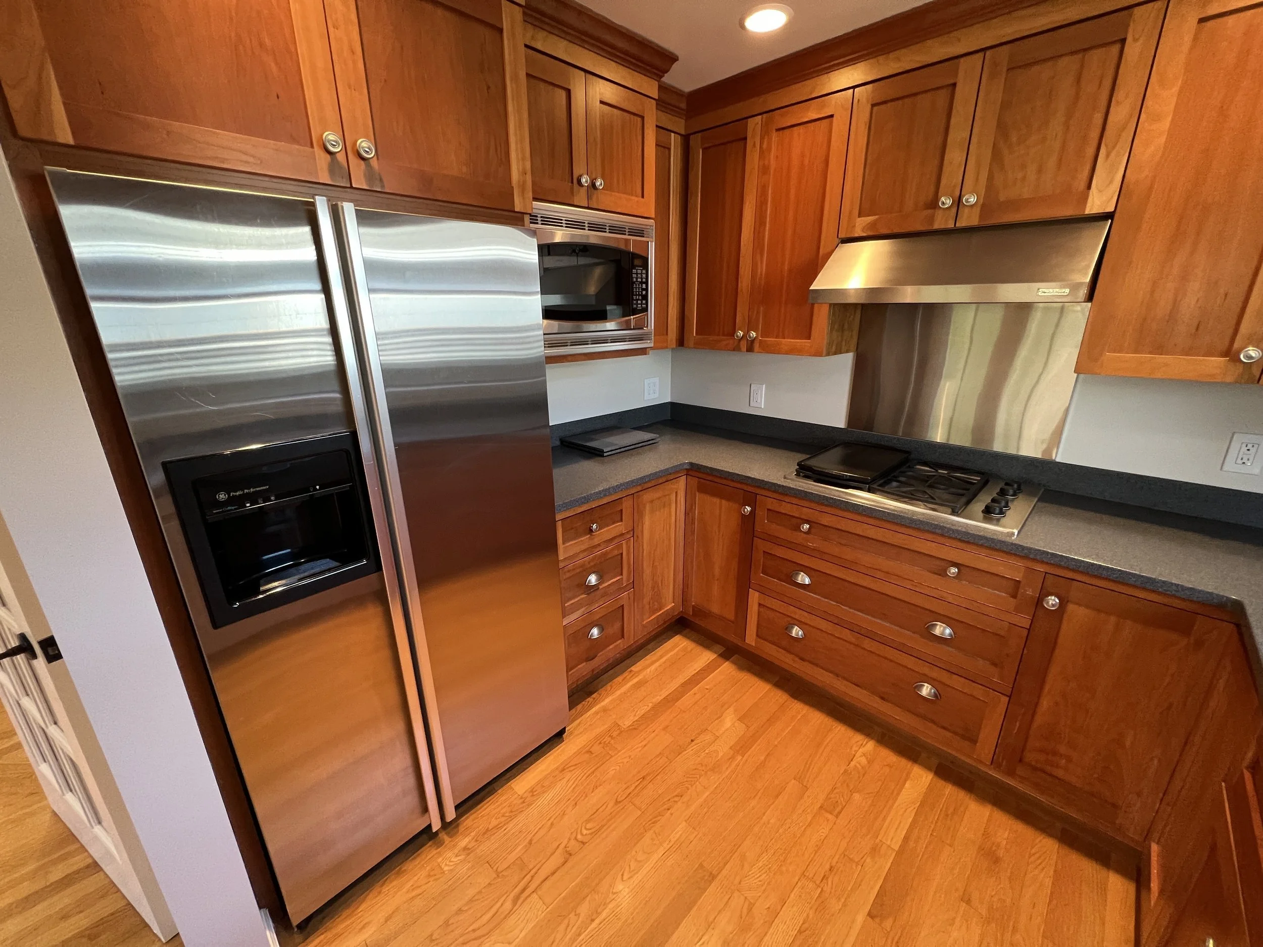 Beyond, find a kitchen including generous counter space and storage, plus a full stainless steel appliance set including a double-door fridge, microwave, dishwasher, stove, and stacked ovens