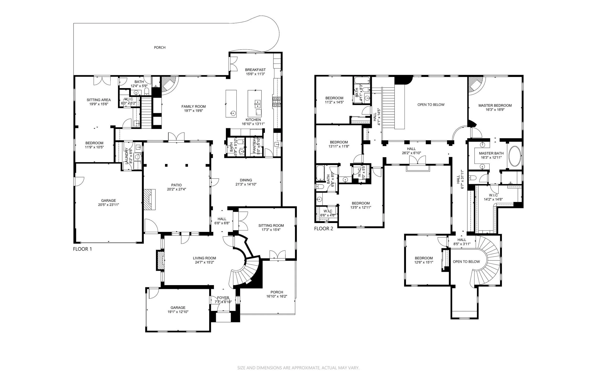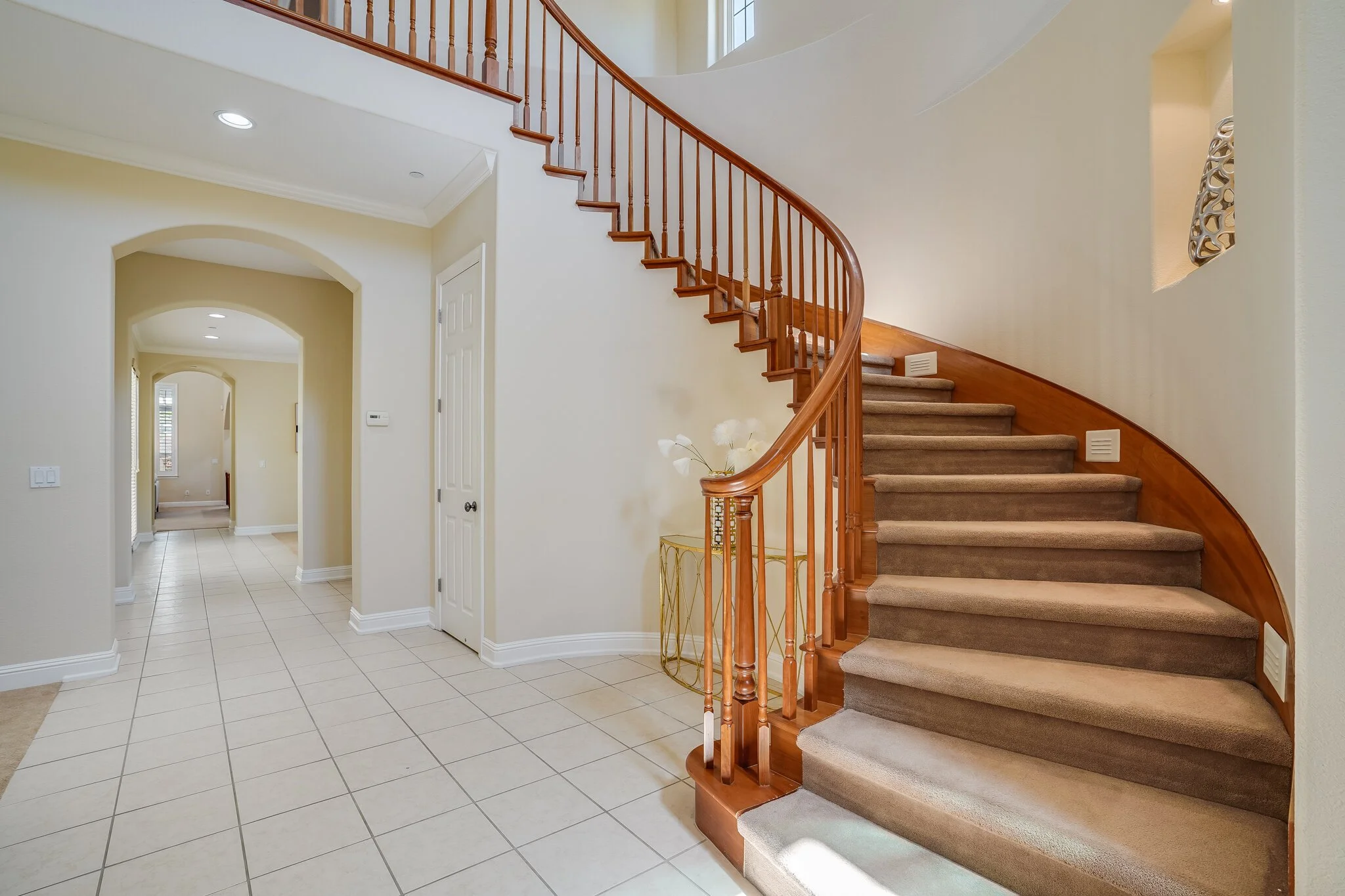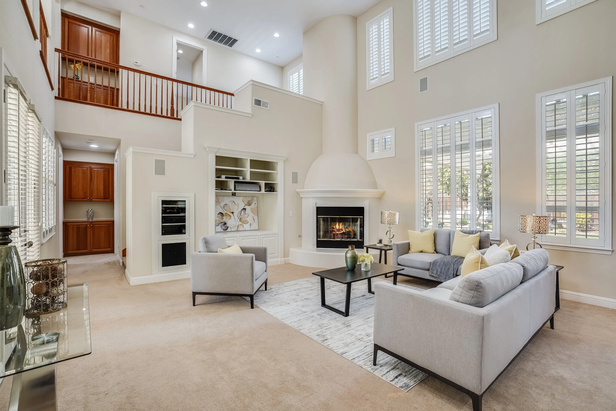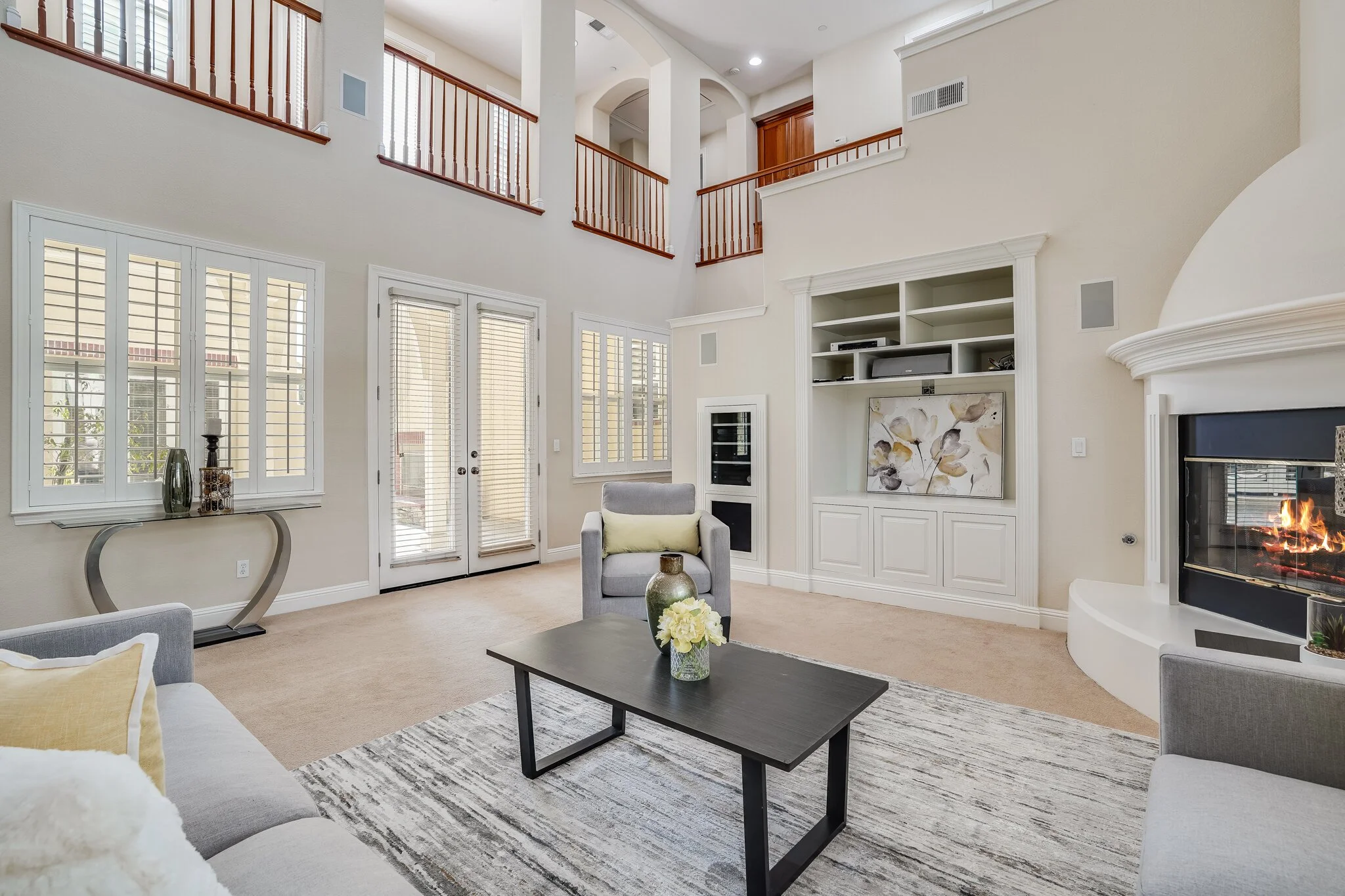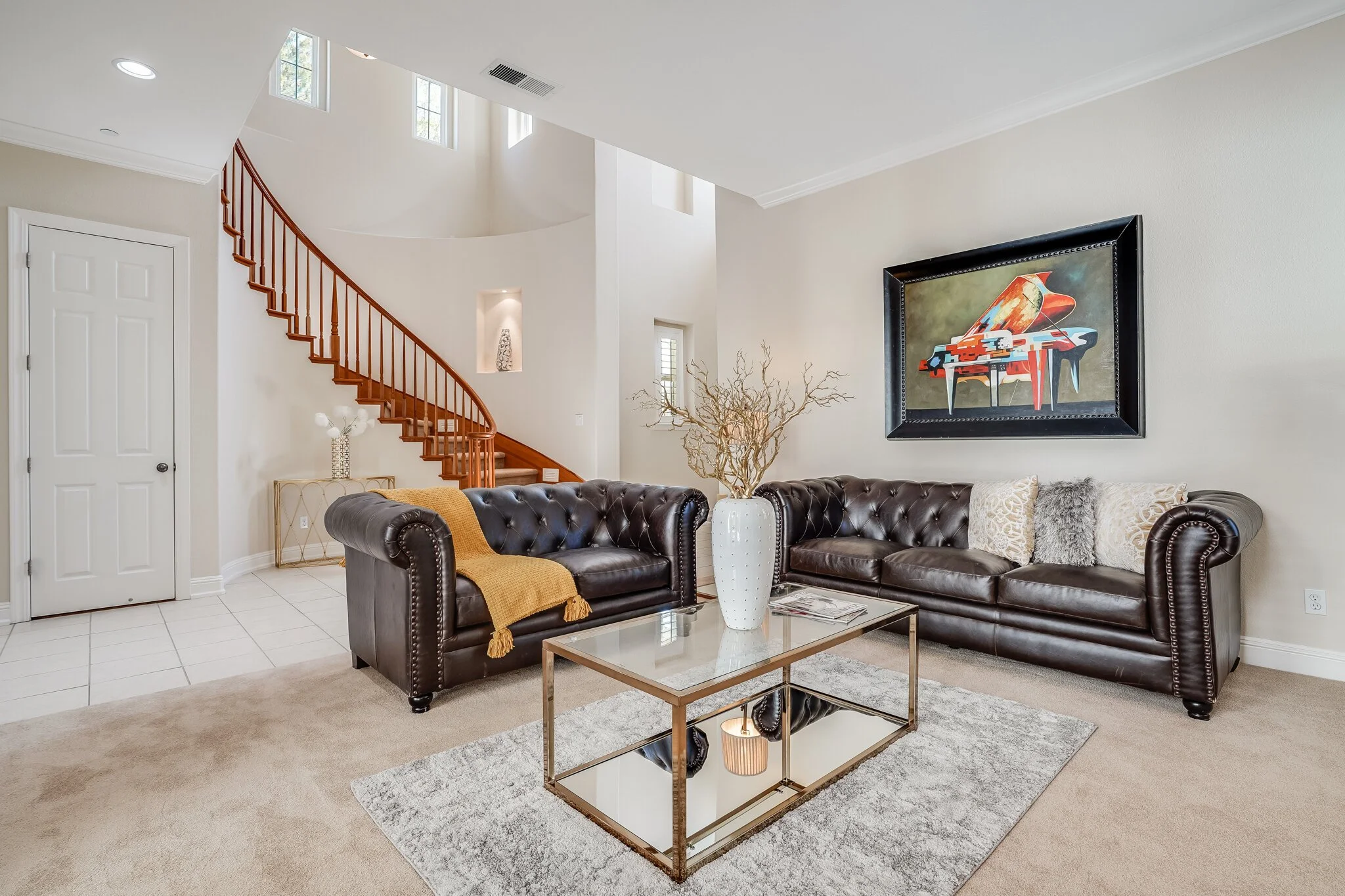 Dramatic entrance is marked by a sweeping staircase and two-story walls