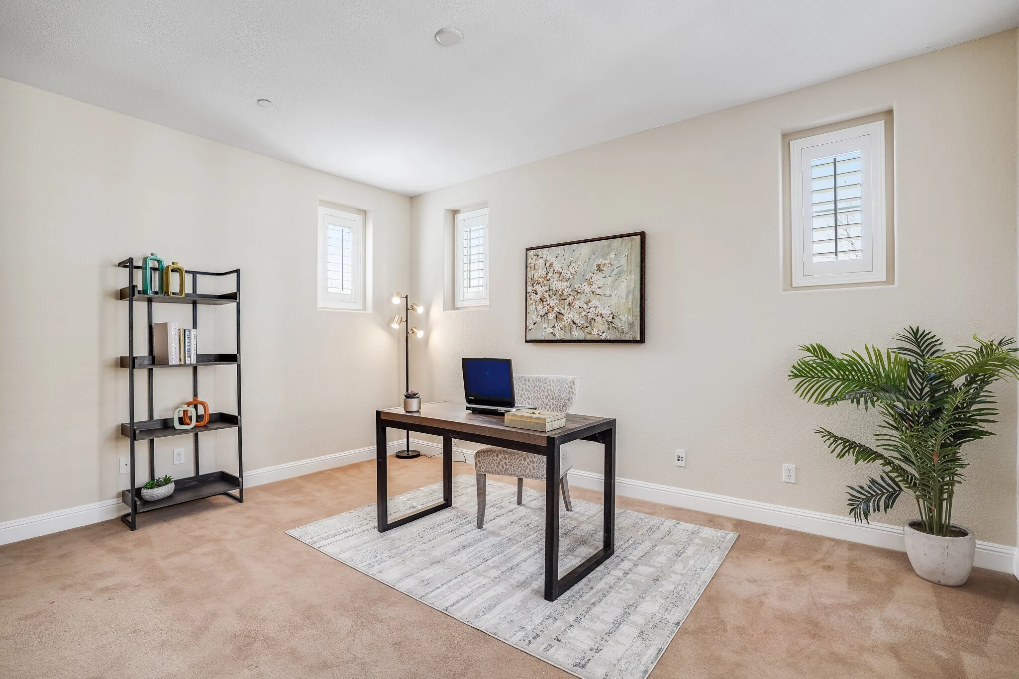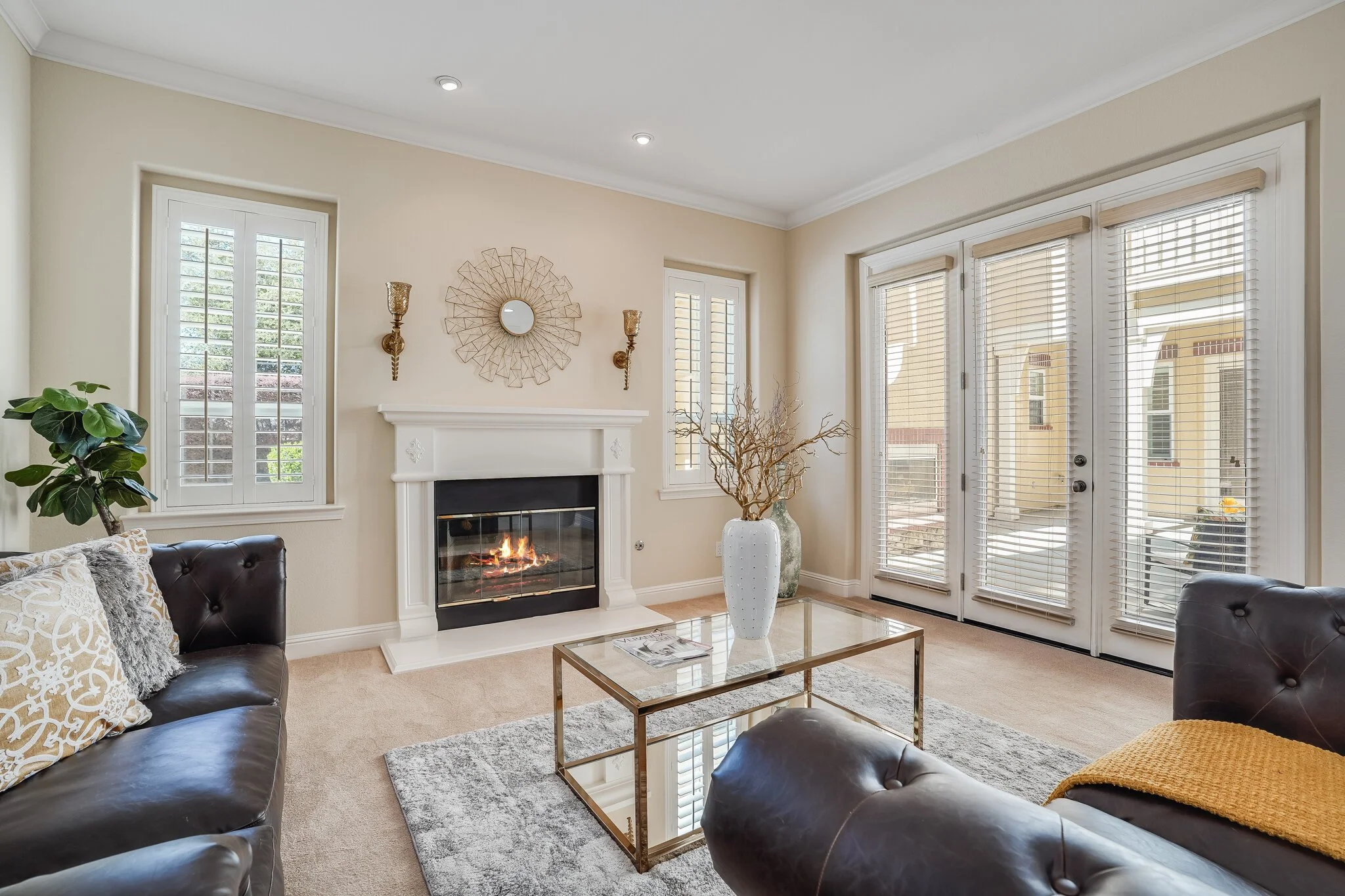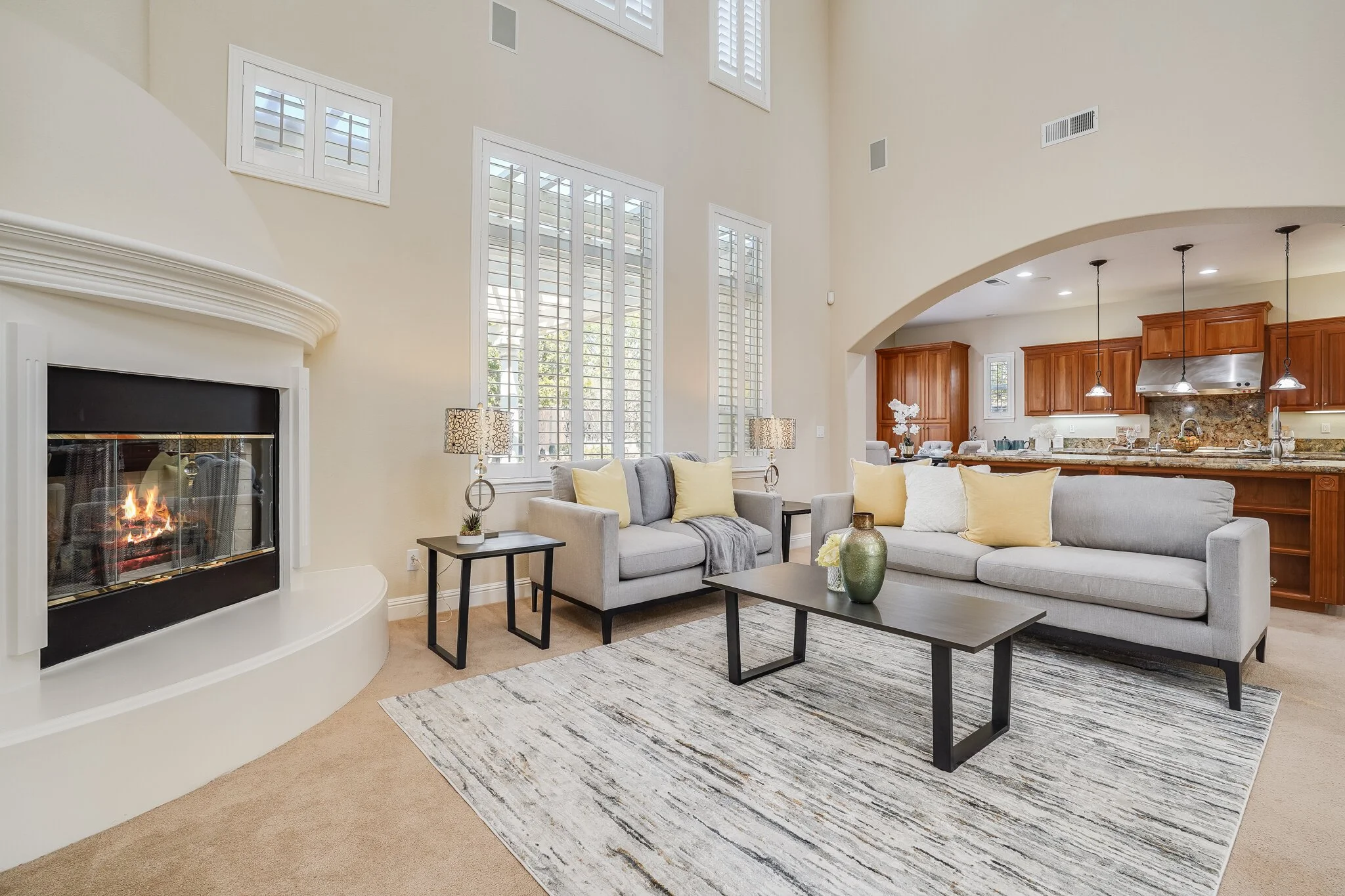 Sun-soaked living room features high walls and broad windows