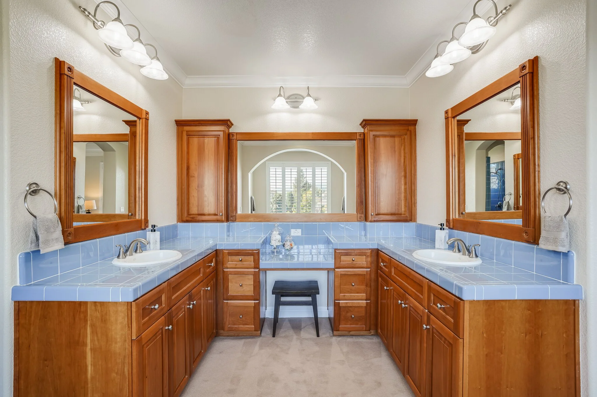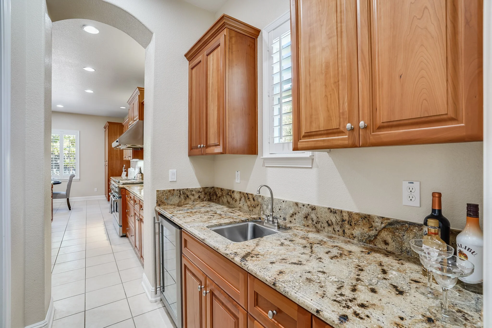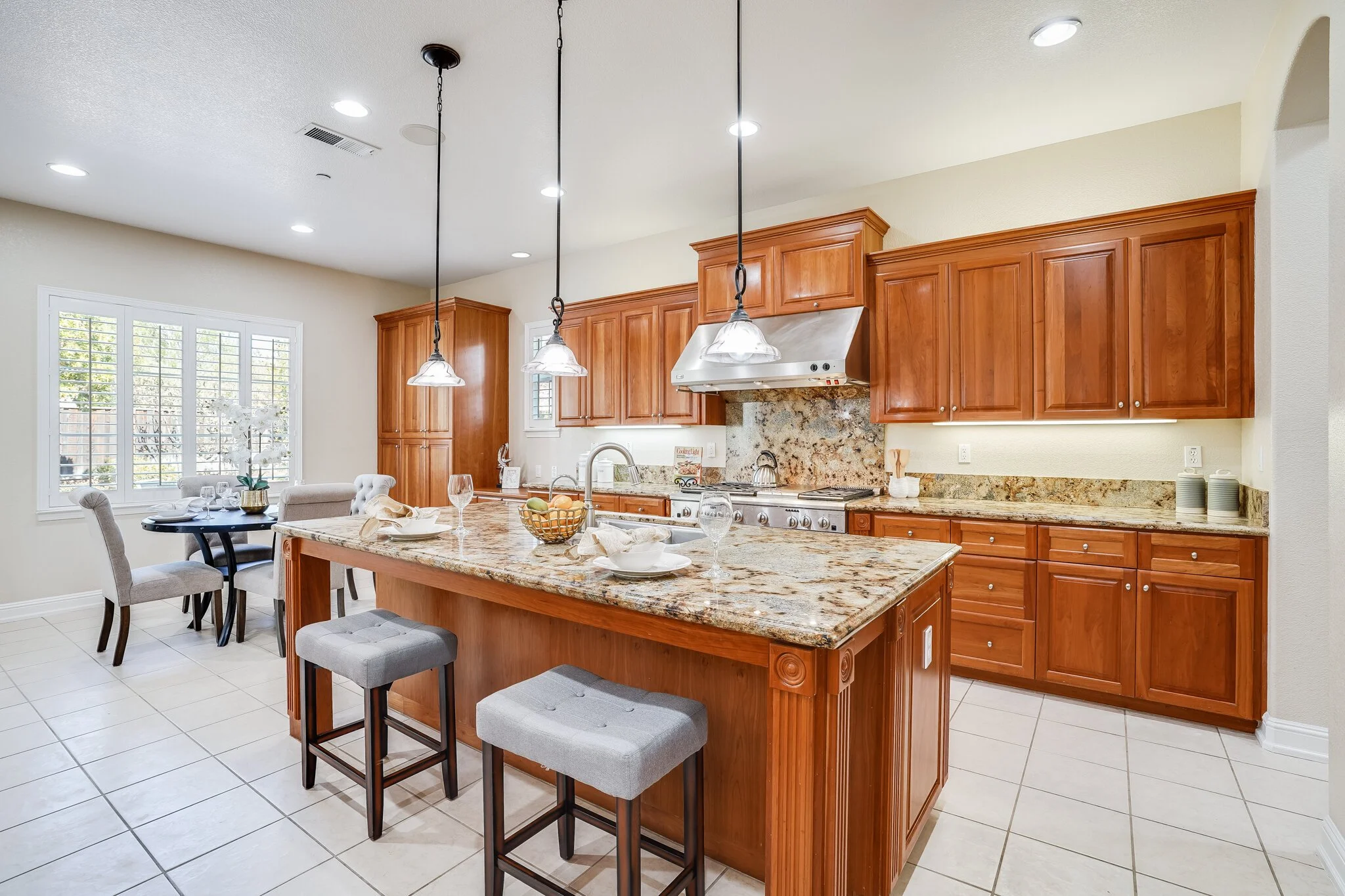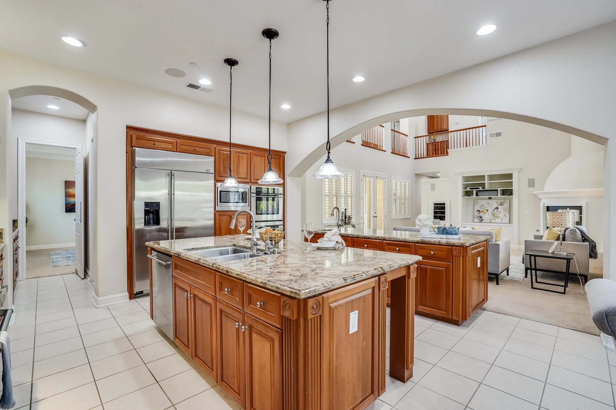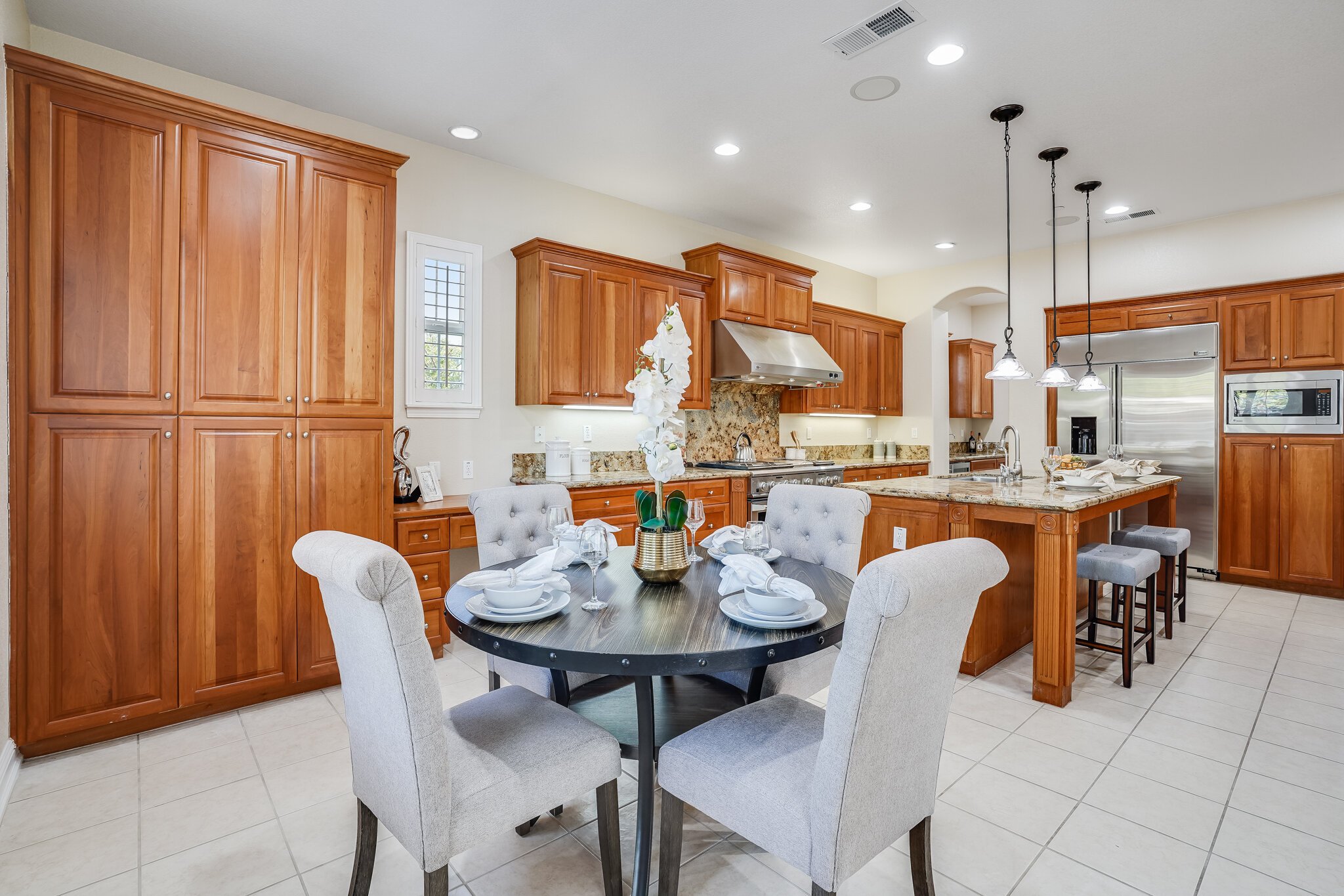 Kitchen is spacious and ultra-functional, with a gourmet stove, two stacked wall ovens, an extra-large high-end fridge, generous pantry, and double kitchen islands