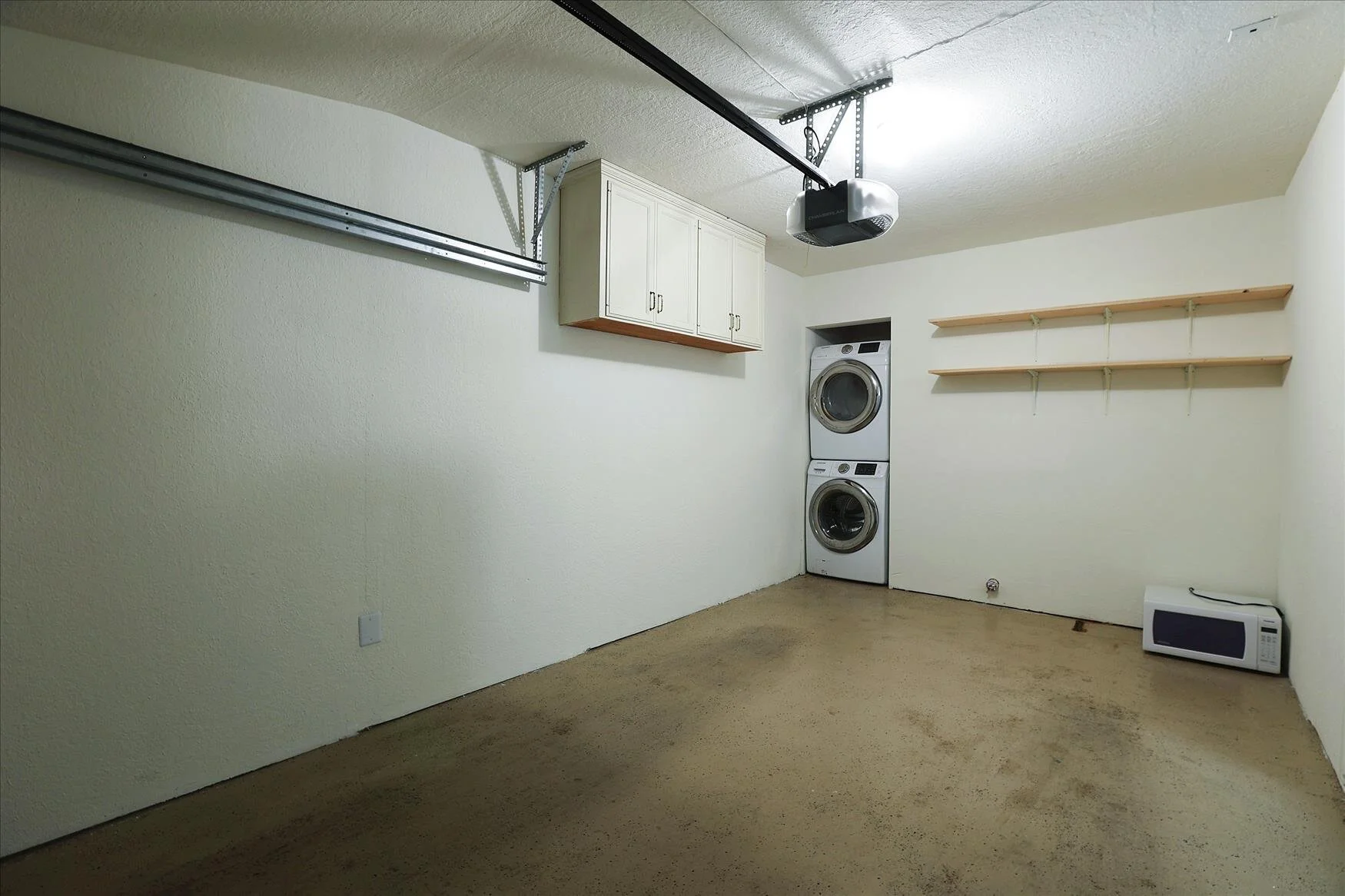 Each unit includes a one-car garage with kitchen entry and a dedicated space for stacked laundry, including stainless steel washer/dryer