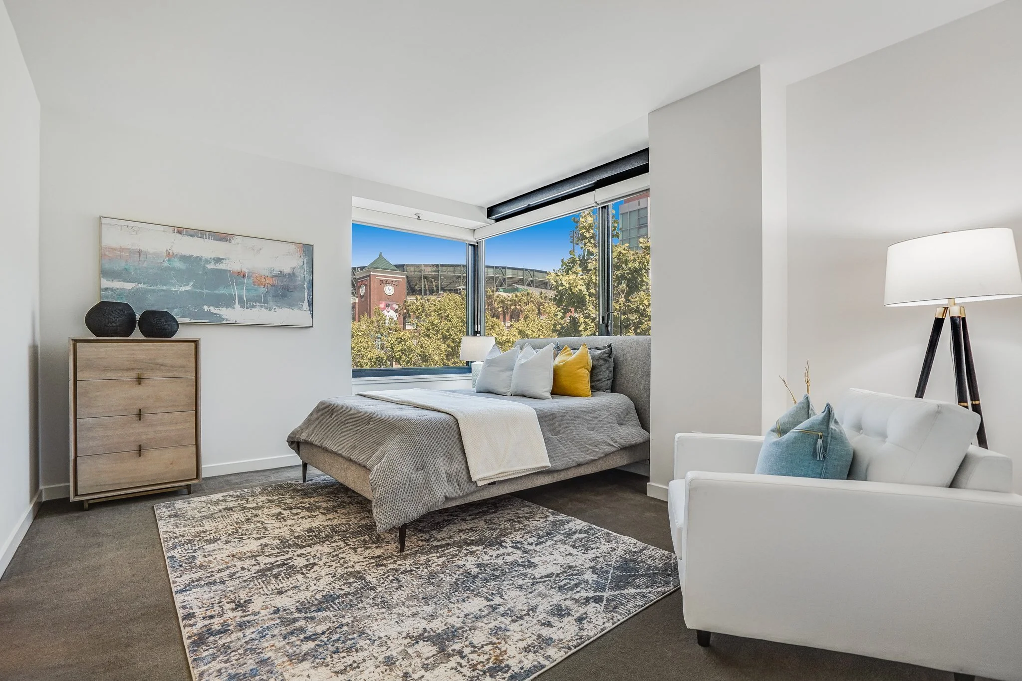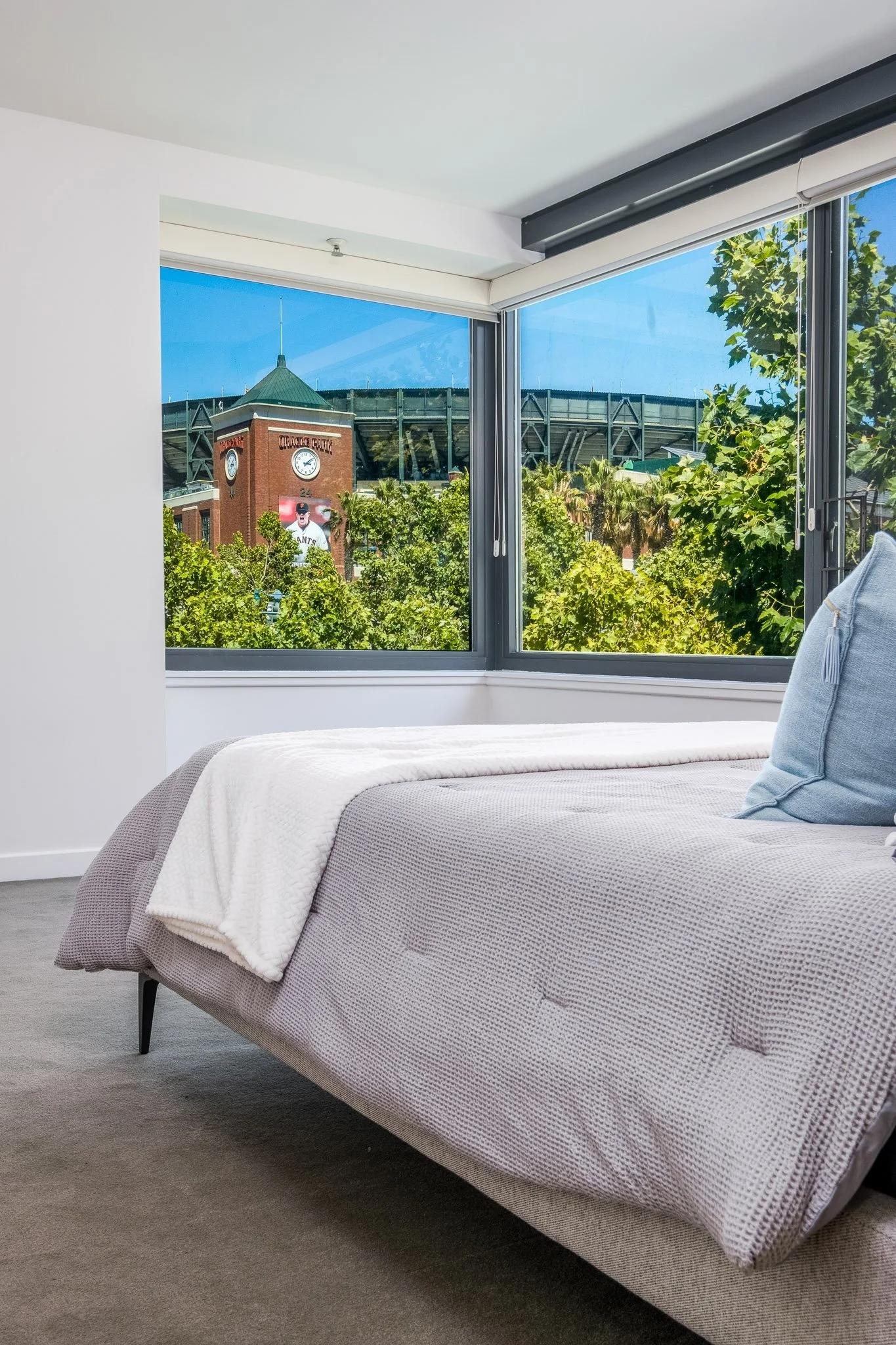 Enjoy coffee with a view of Oracle Park from the huge bedroom with walk-in closet