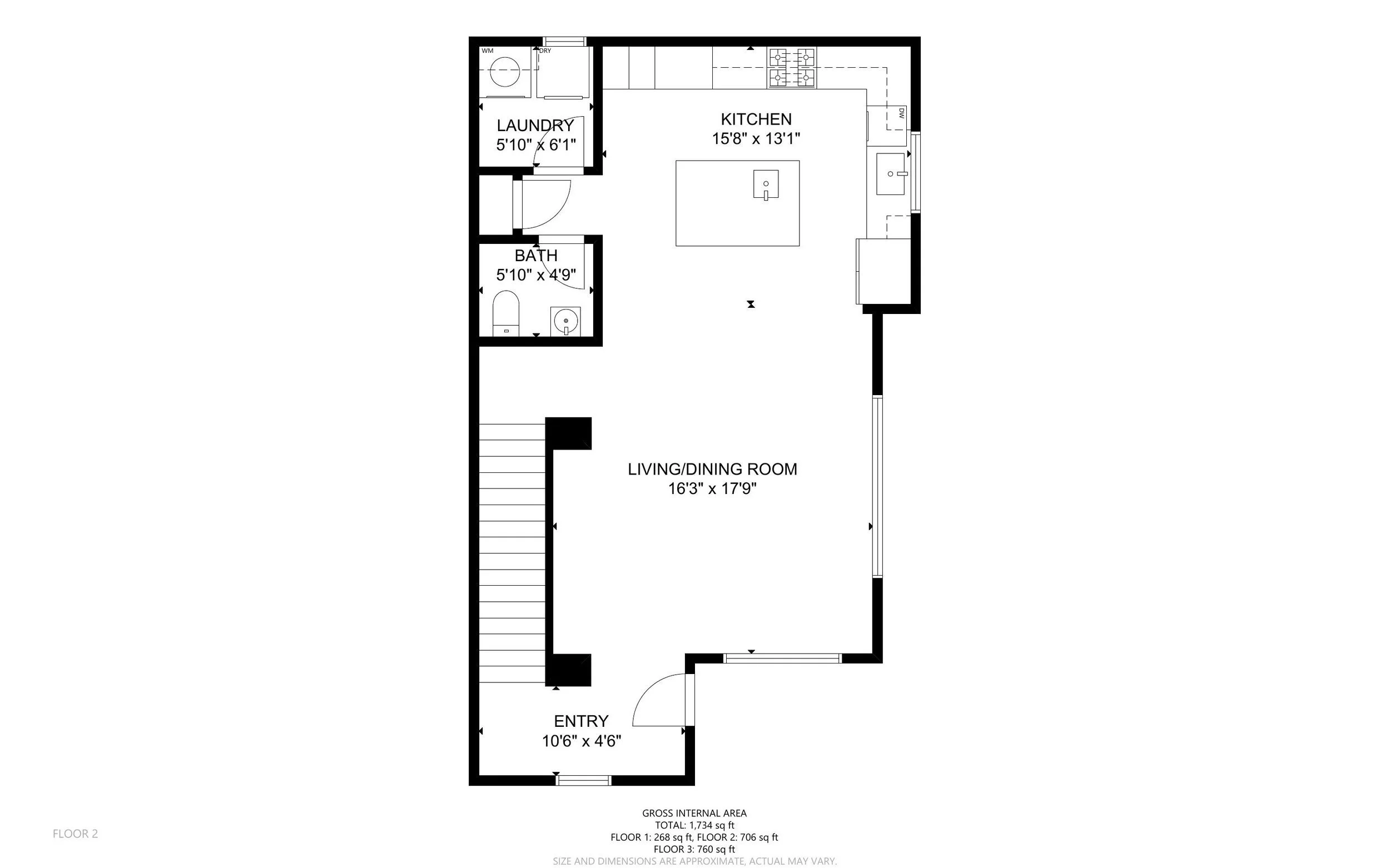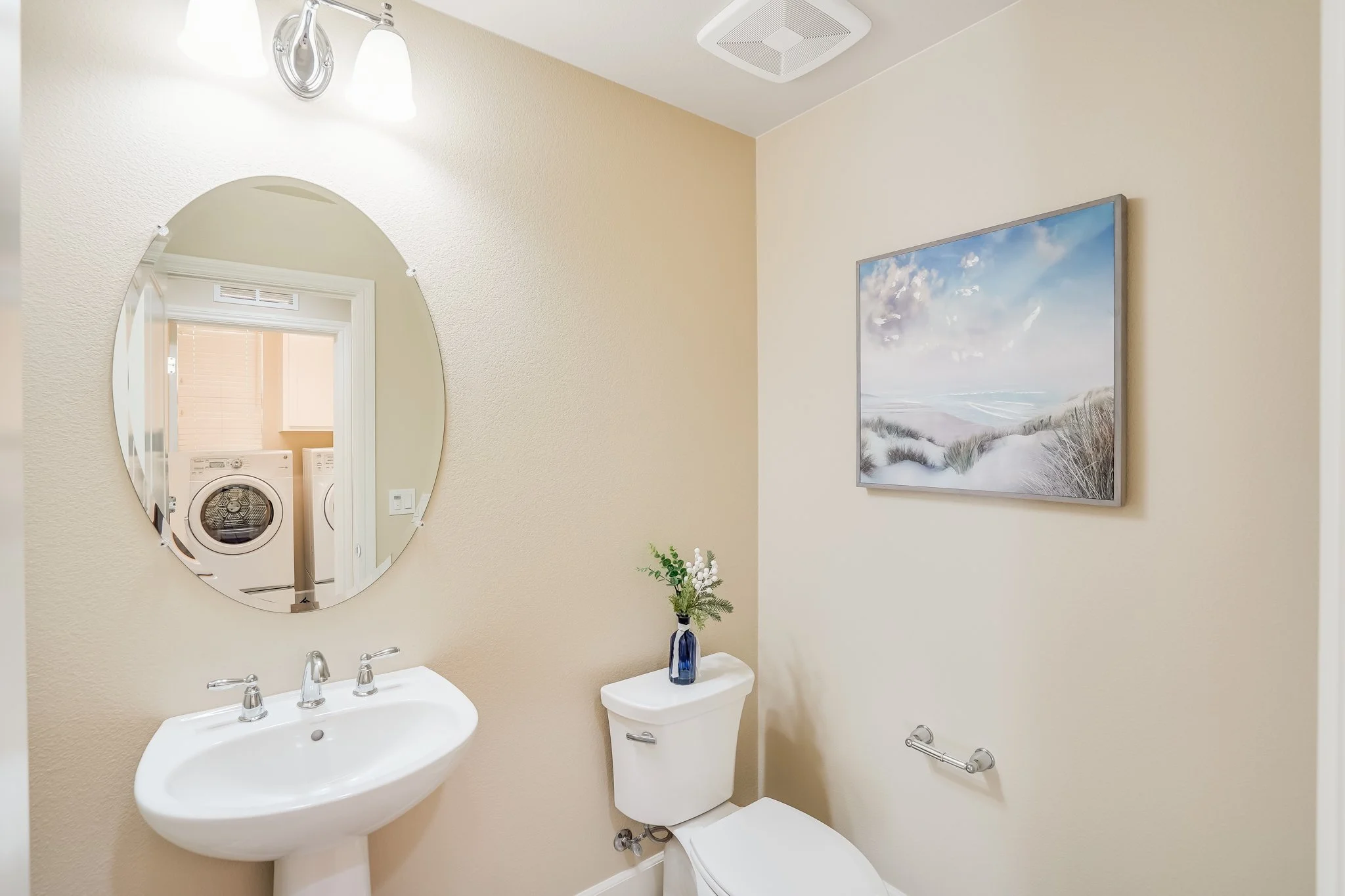 Main floor displays open communal space and half bath