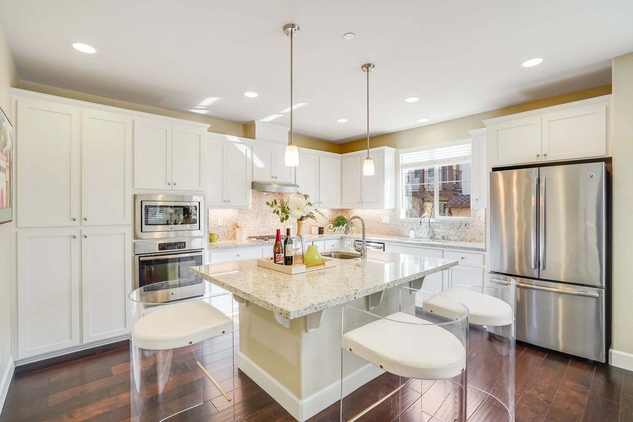 Kitchen boasts modern appliances, an oversized island, and ample storage and counter space