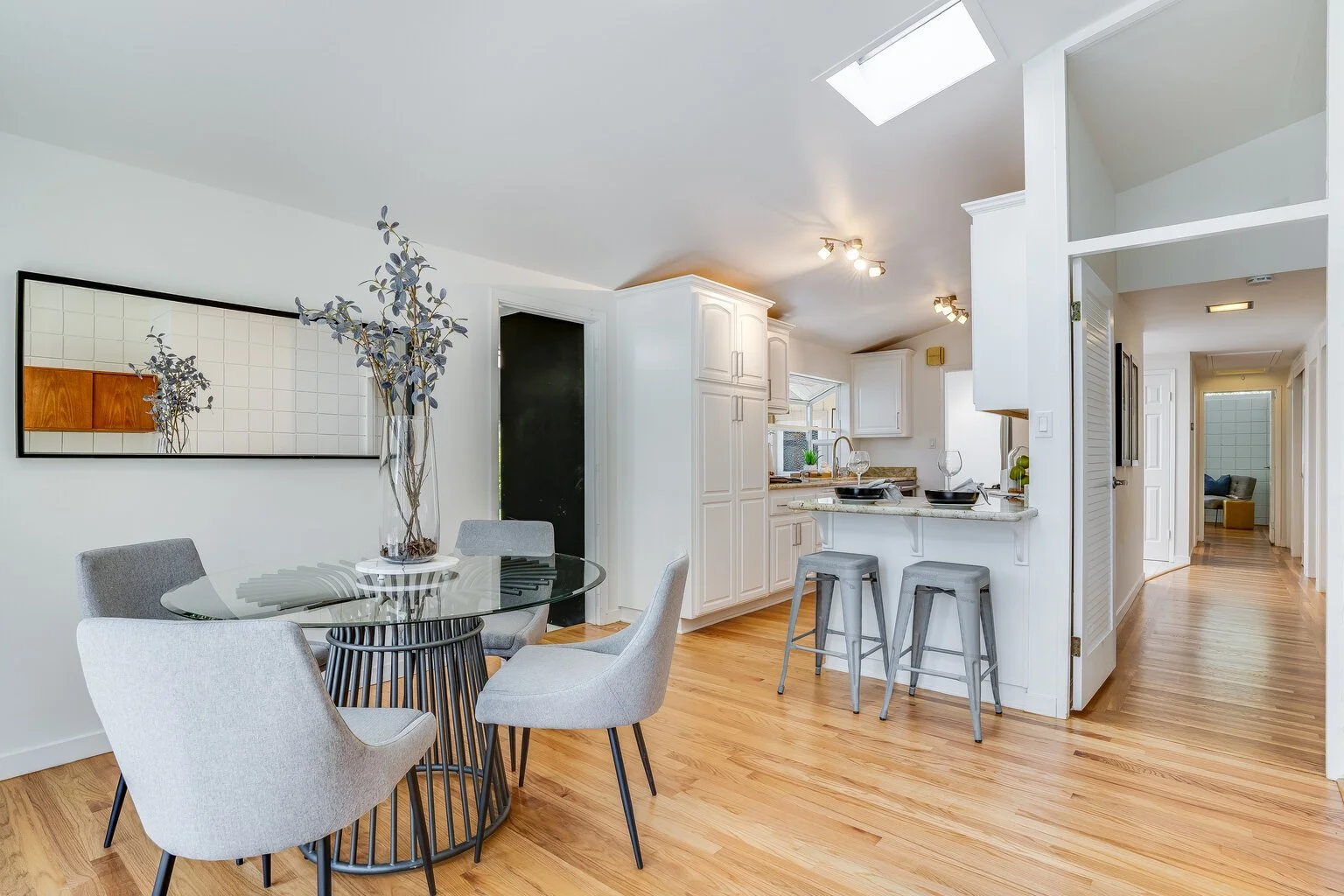 Entry flows into bright and cheerful living space dominated by glass walls along the back of the house, bringing incredible light into the communal space