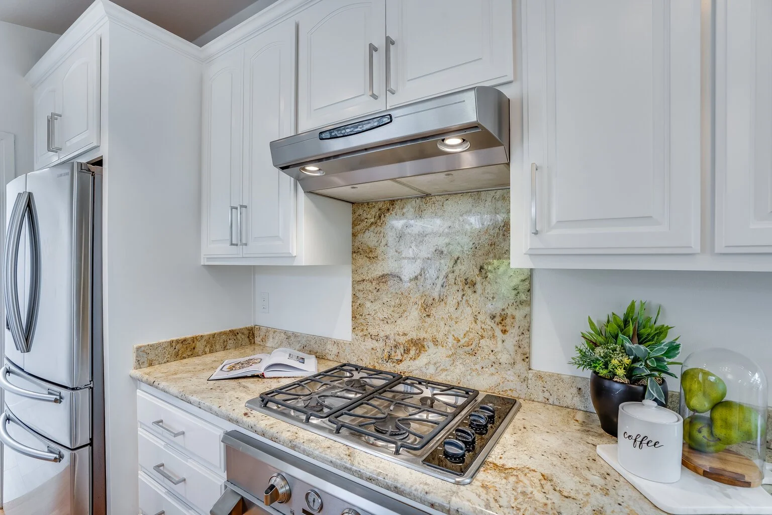 Cozy kitchen is well-planned with ample storage, stainless steel appliances, and granite counters