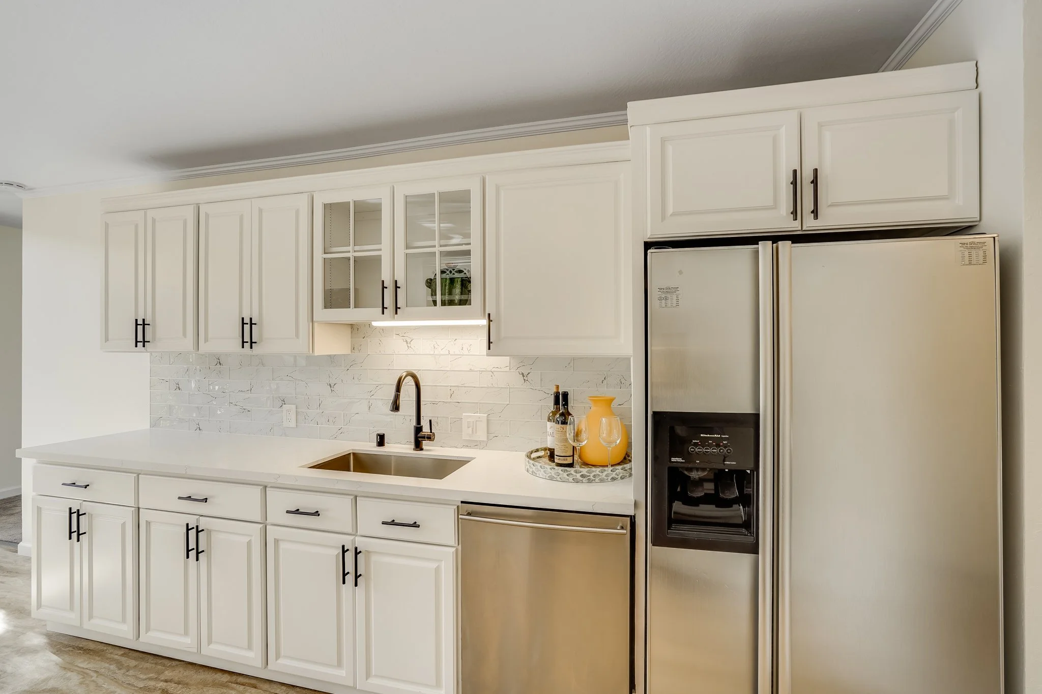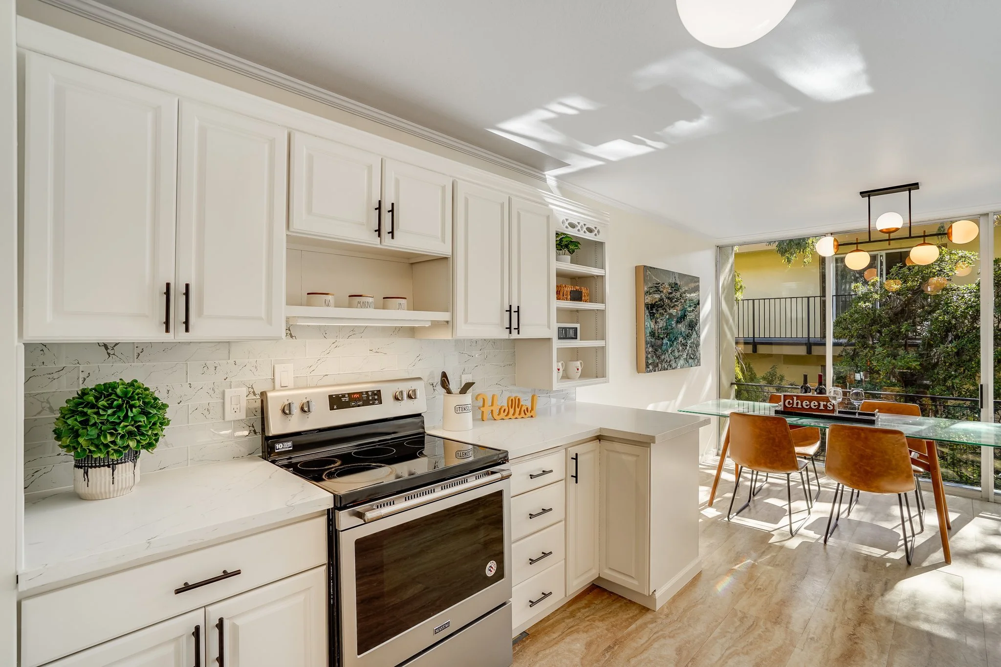 Bright updated kitchen with modern appliances, ample cabinetry, and new quartz counters and backsplash