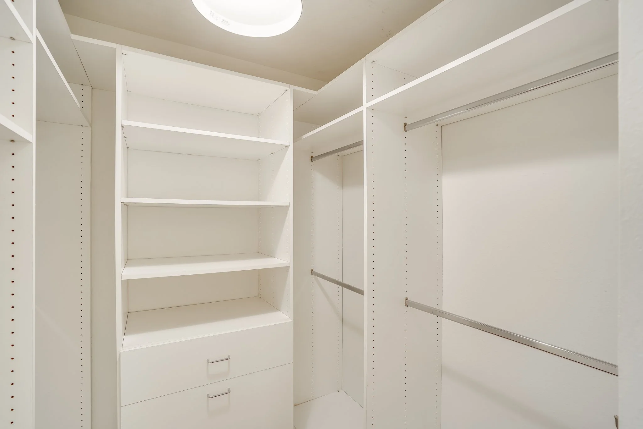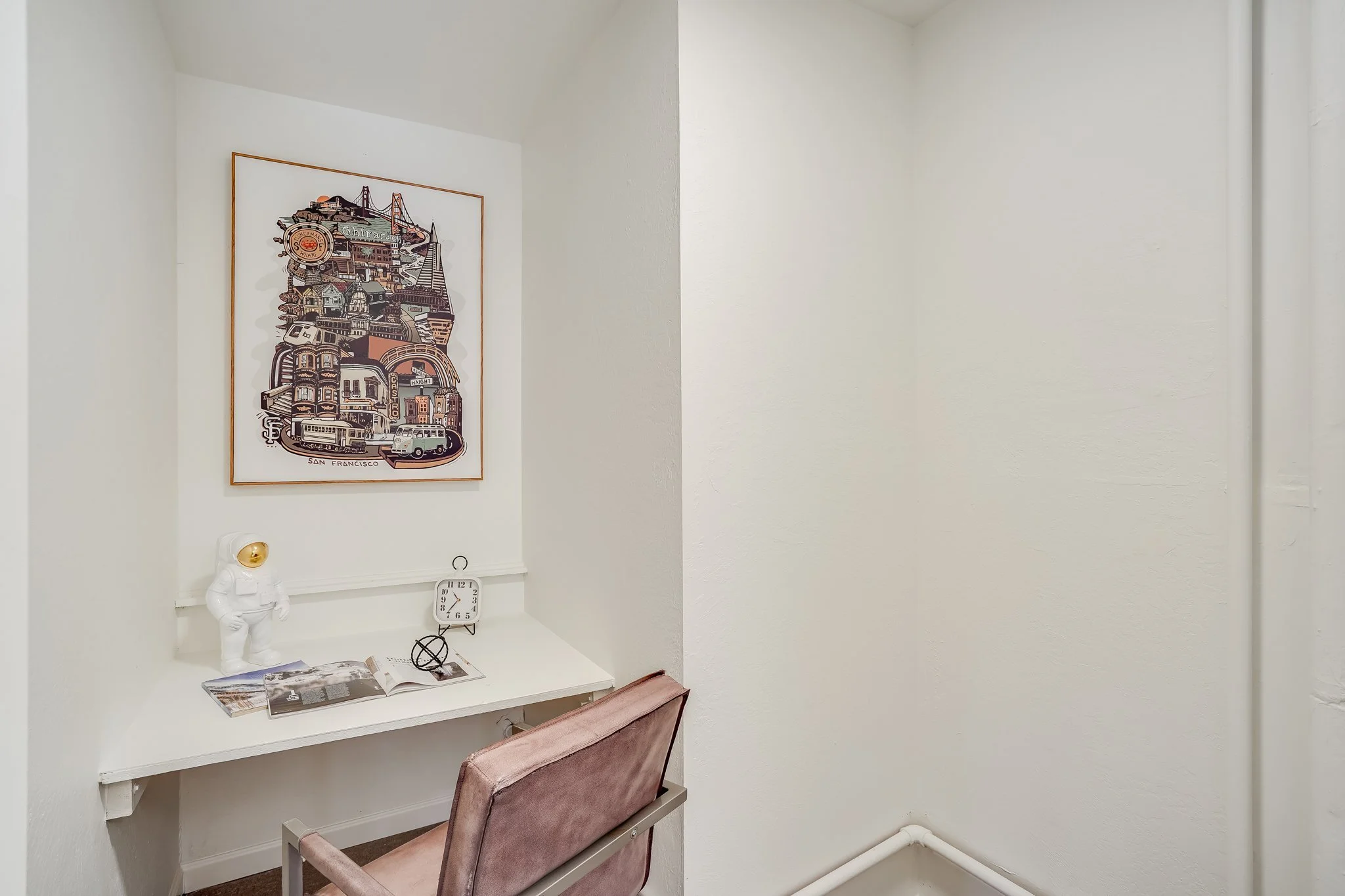 A private updated full bath, study niche, and walk-in closet with custom shelving define the primary bedroom