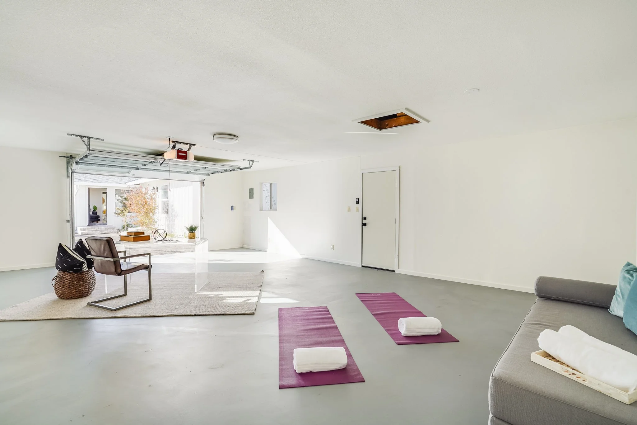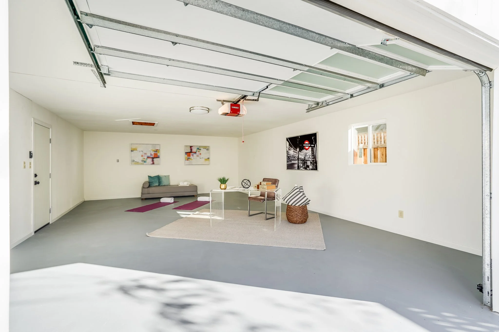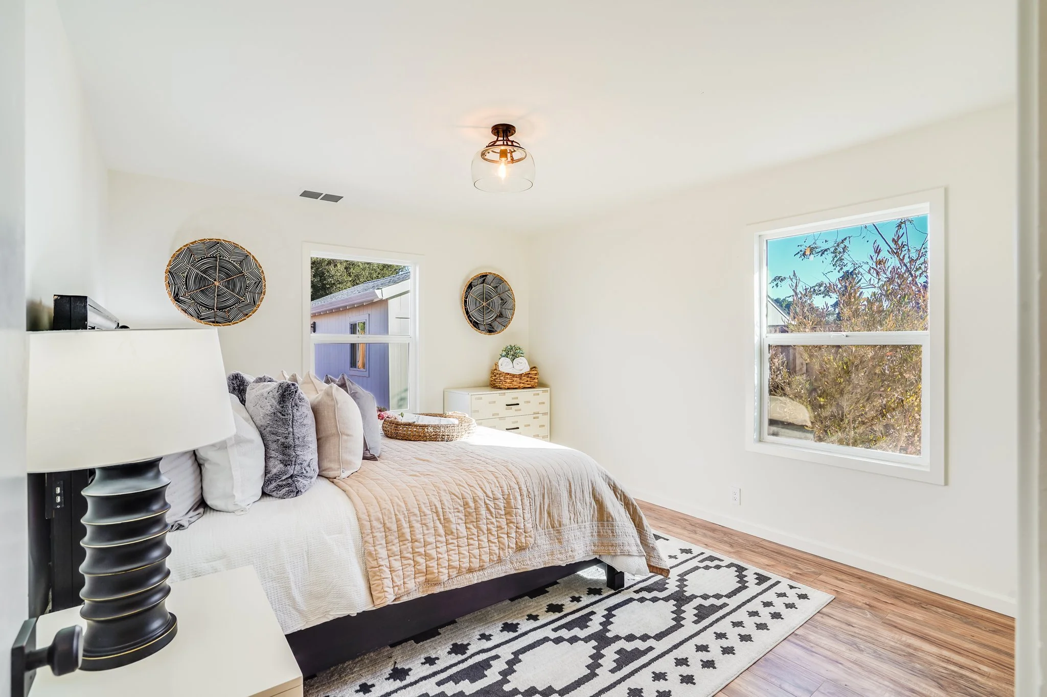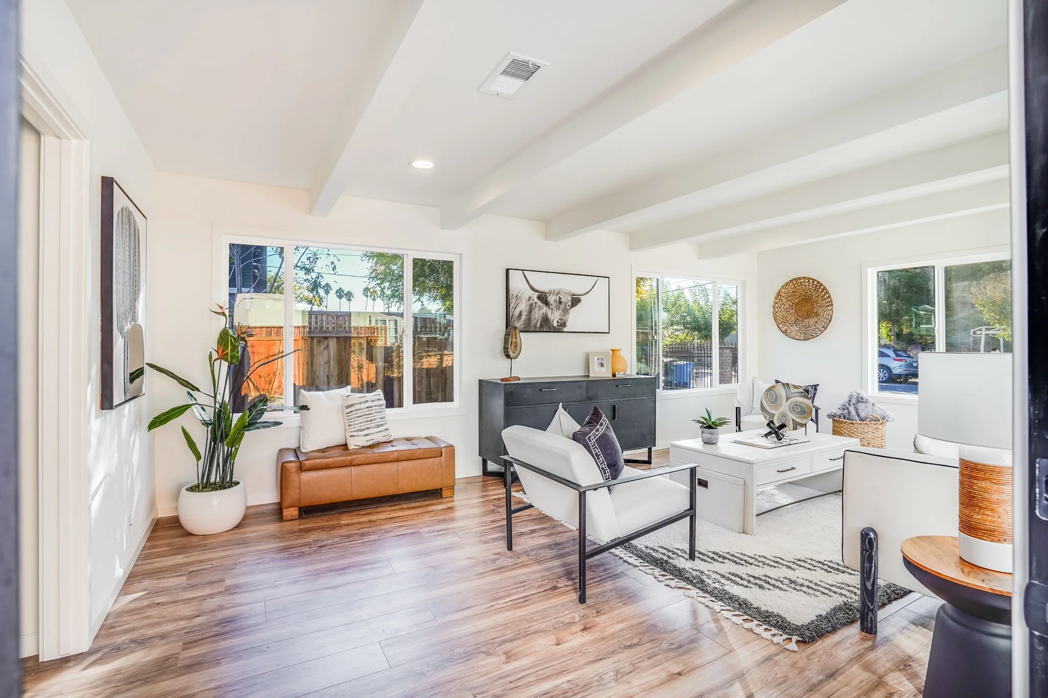 Enter onto a sun-drenched living room with broad windows and an open-beam ceiling.