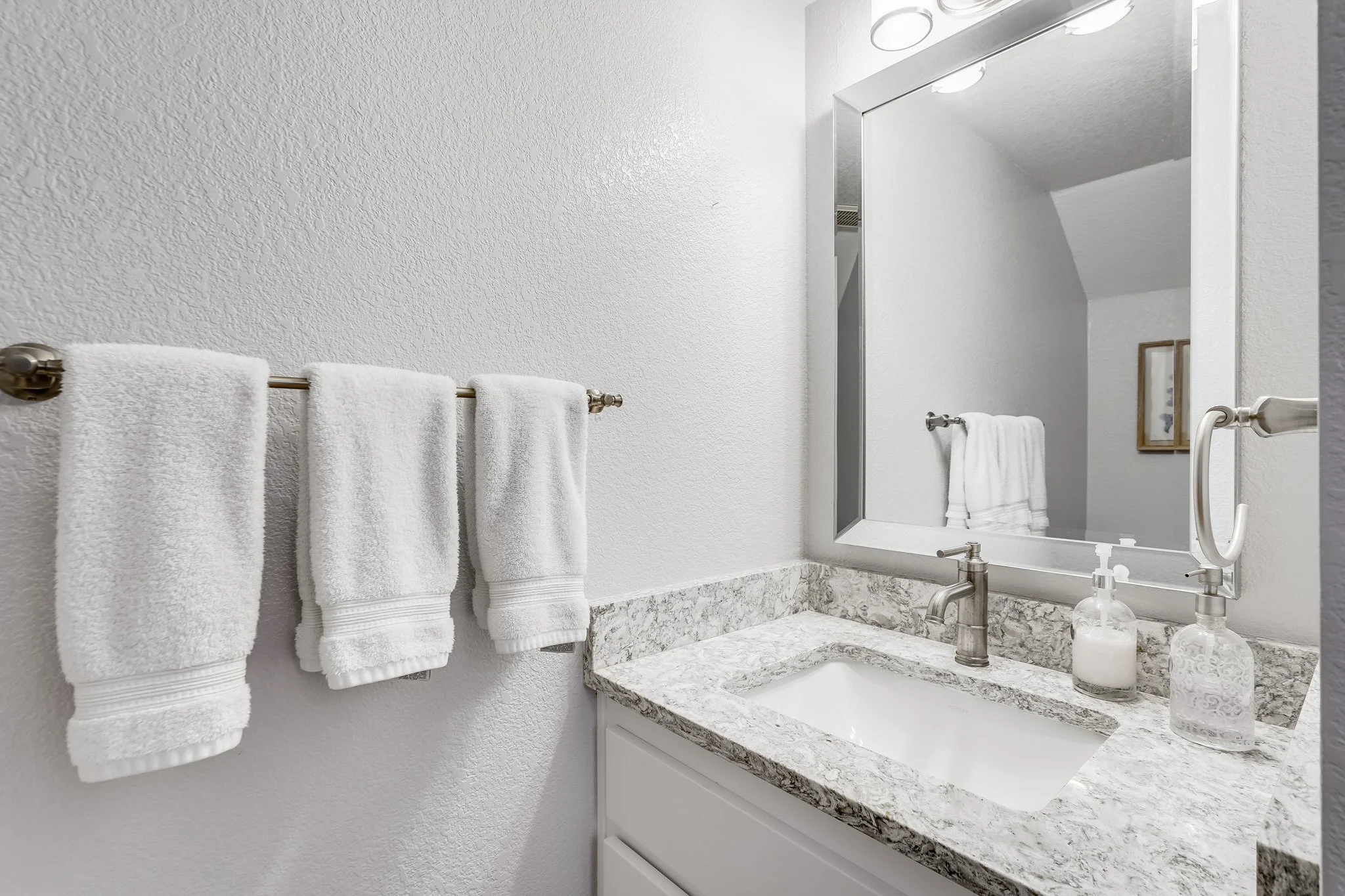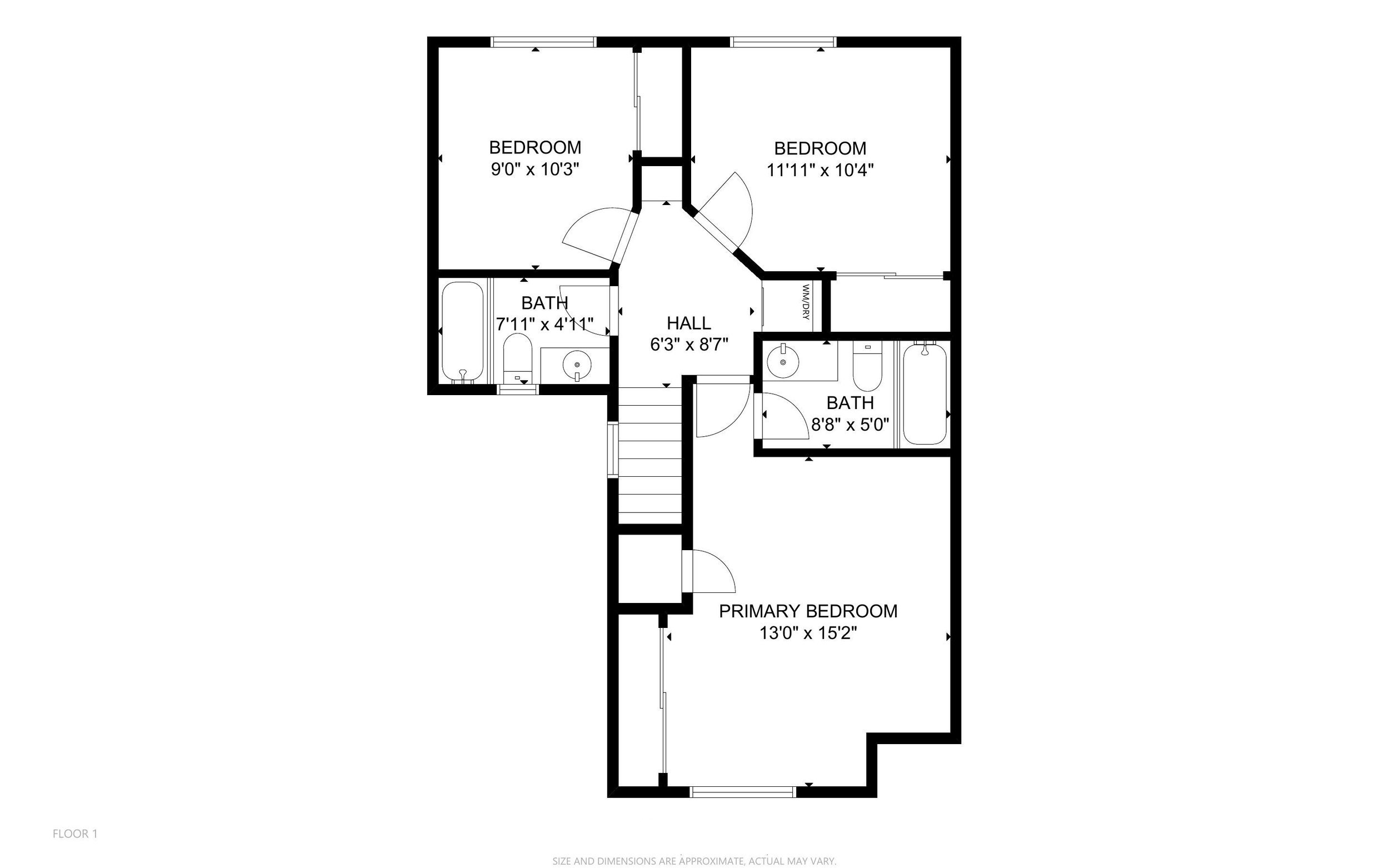 A half bath resides on the entry level, while three bedrooms, two full bathrooms with shower-tub combos, and the laundry area are located upstairs.