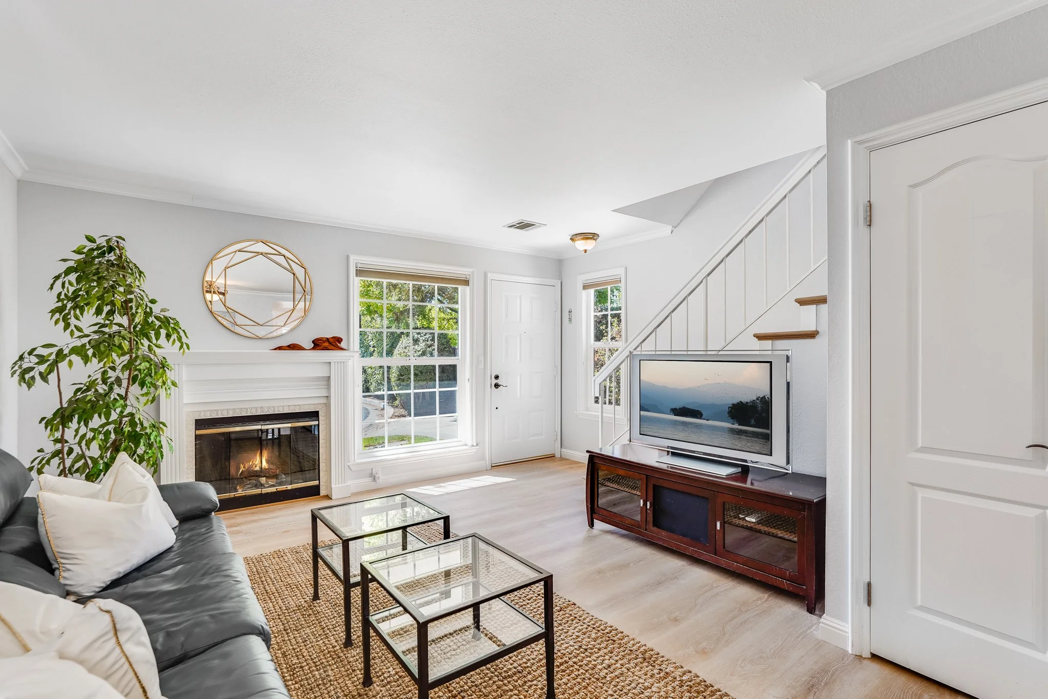 Brimming with natural light, the spacious living room boasts a classic fireplace and crown molding.