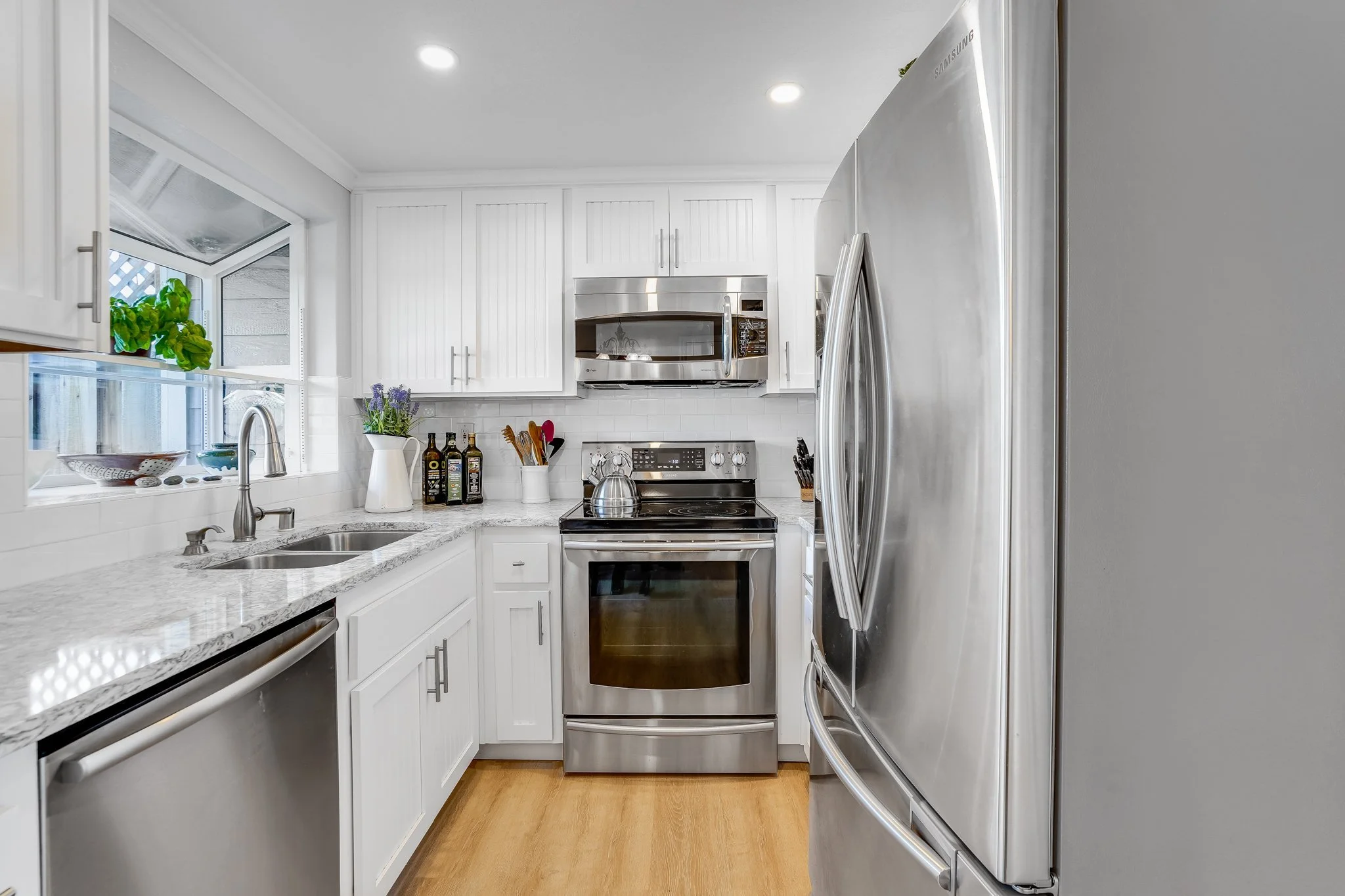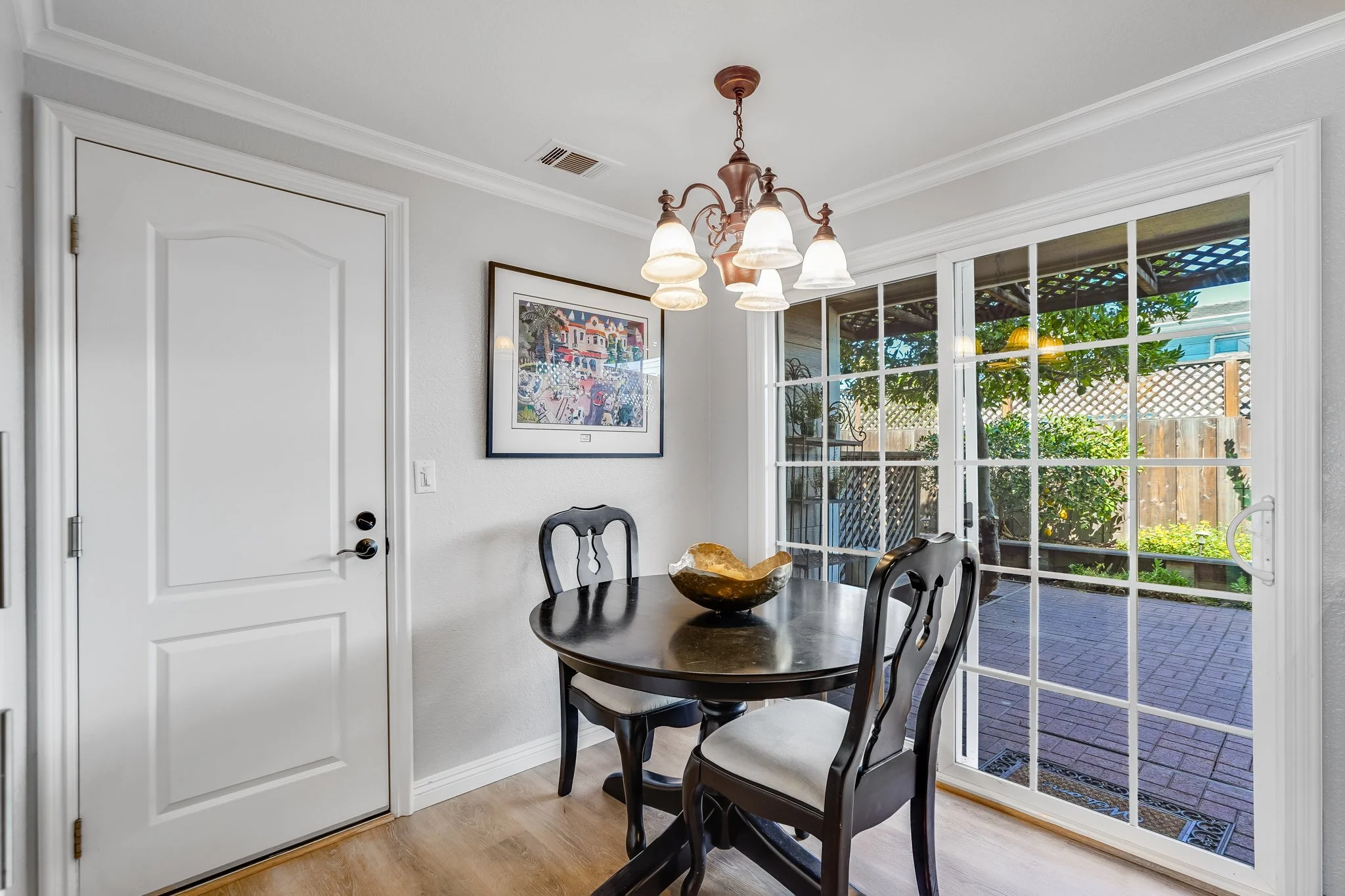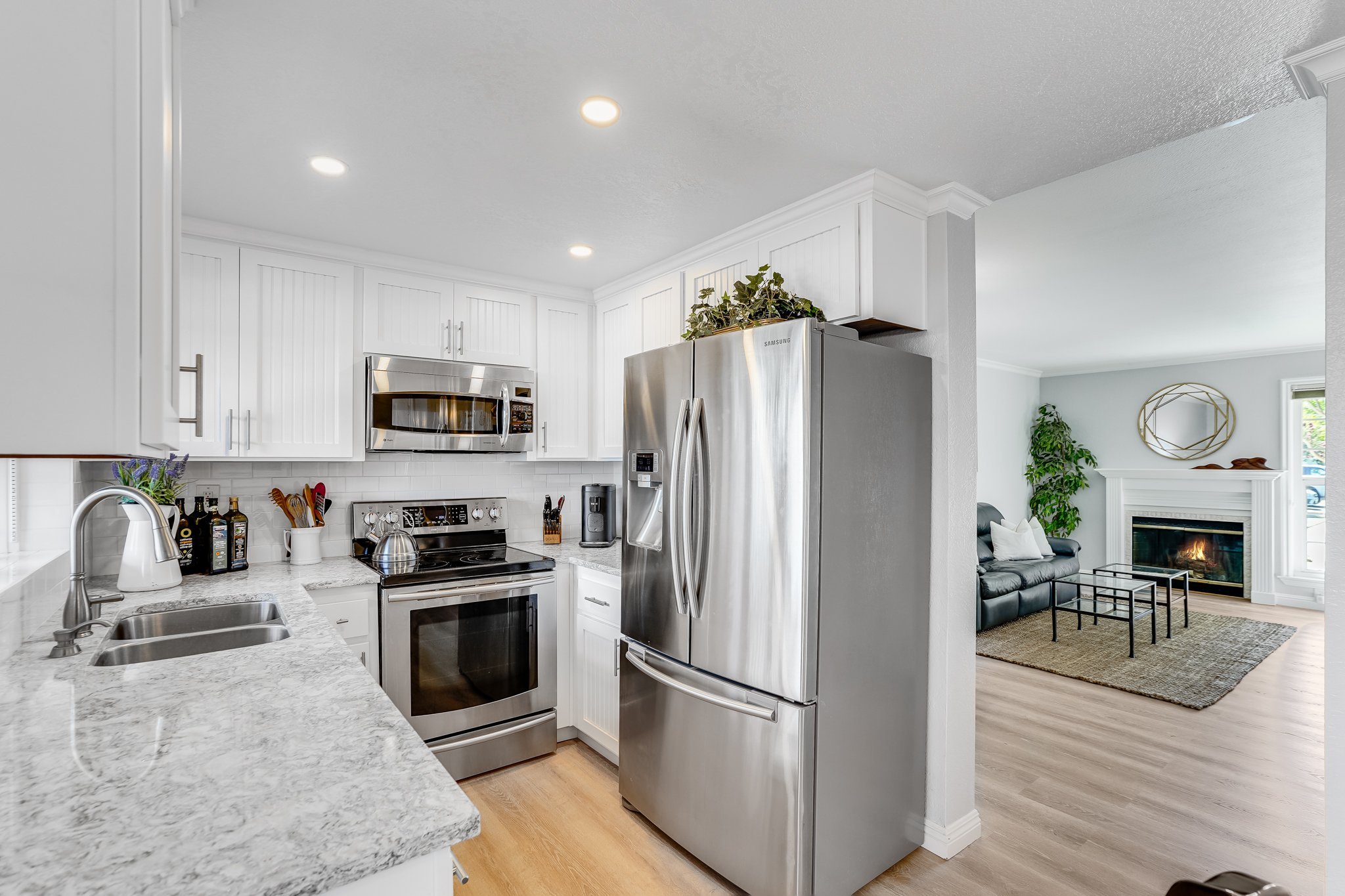 The dine-in kitchen has been updated with all of your needs in mind. Subway tile backsplash rests between white, shaker cabinetry, stainless steel appliances shimmer under recessed lighting, and glass sliders seamlessly flow out to the stone patio.