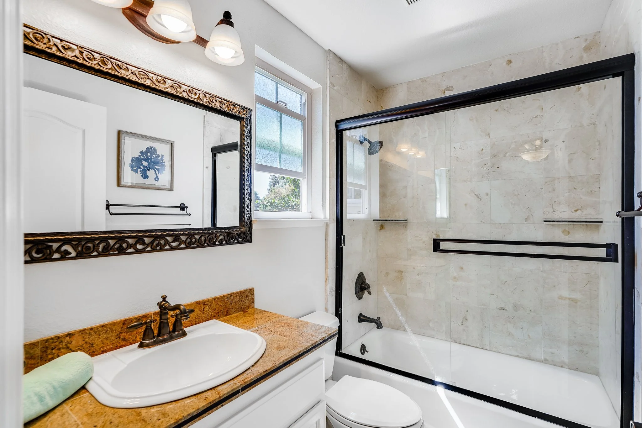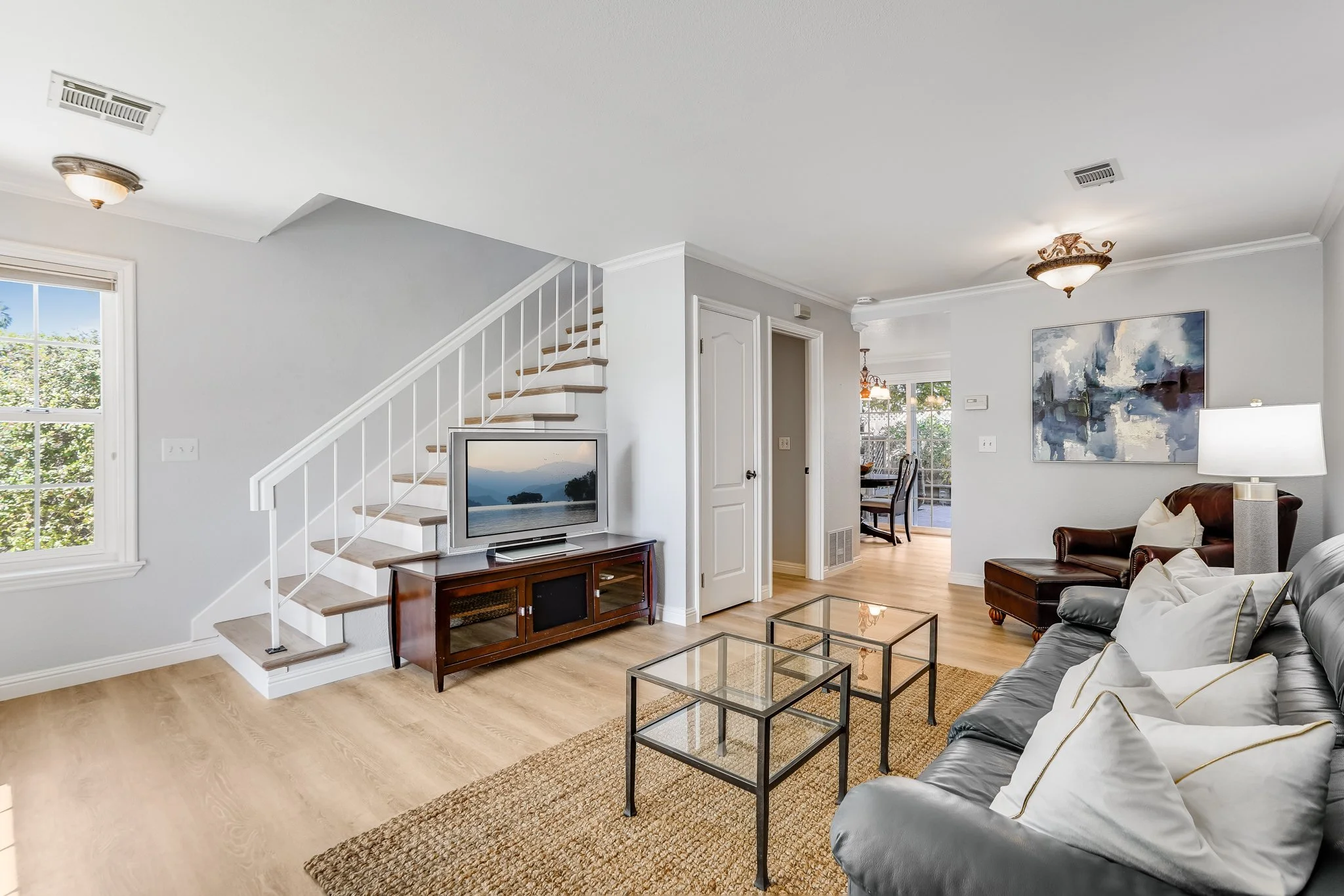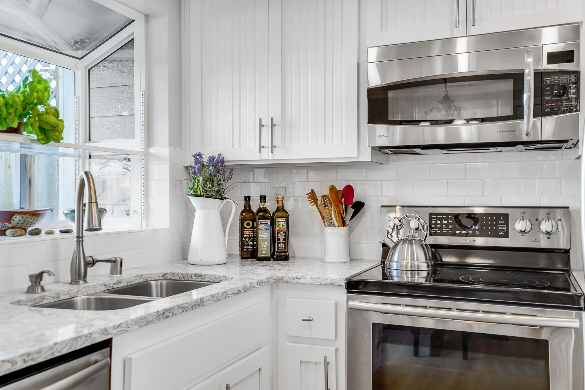 The dine-in kitchen has been updated with all of your needs in mind. Subway tile backsplash rests between white, shaker cabinetry, stainless steel appliances shimmer under recessed lighting, and glass sliders seamlessly flow out to the stone patio.