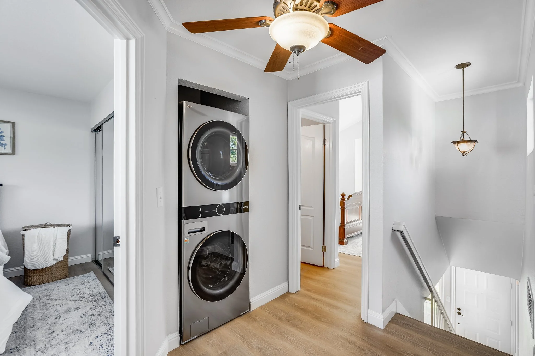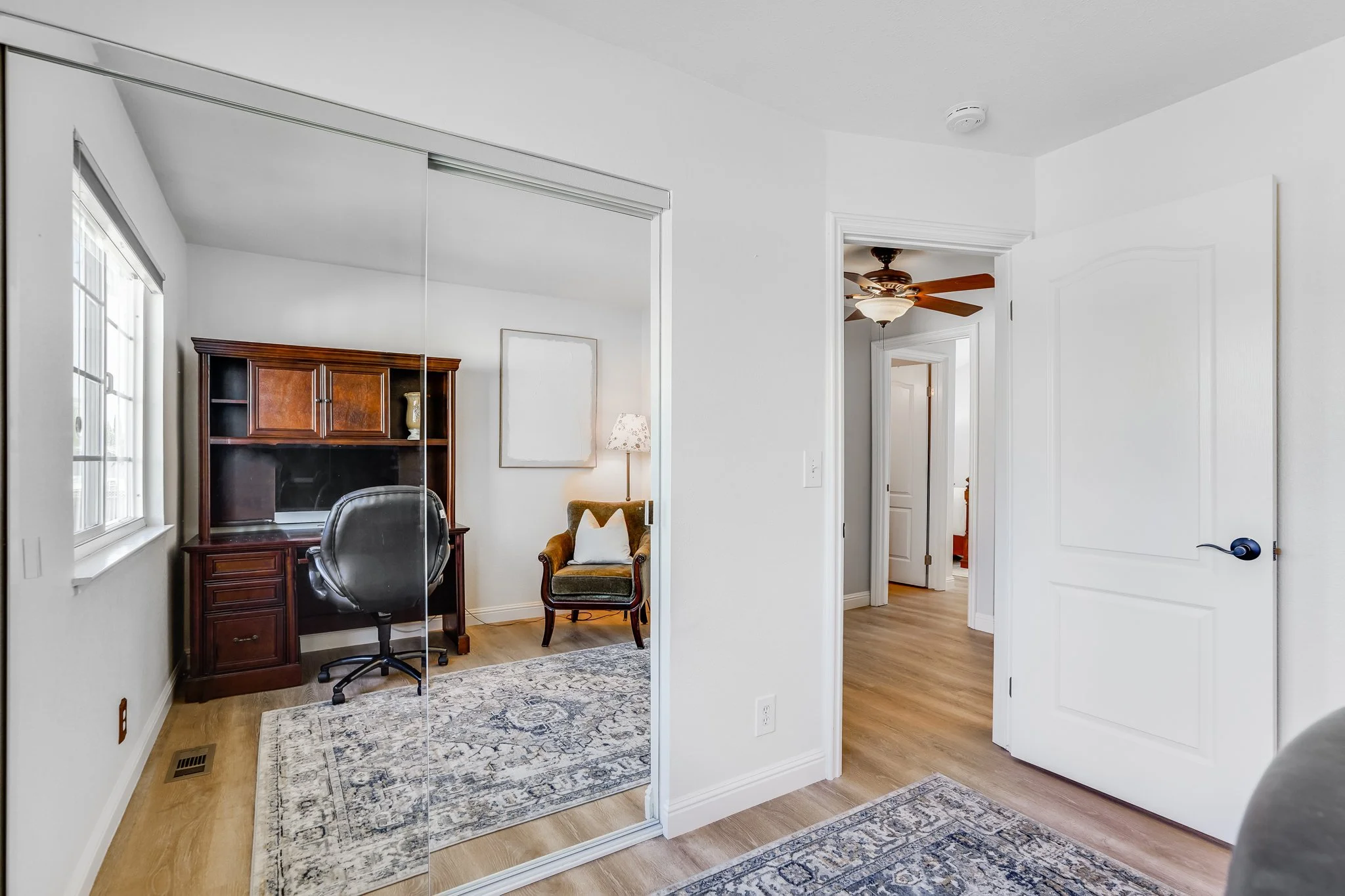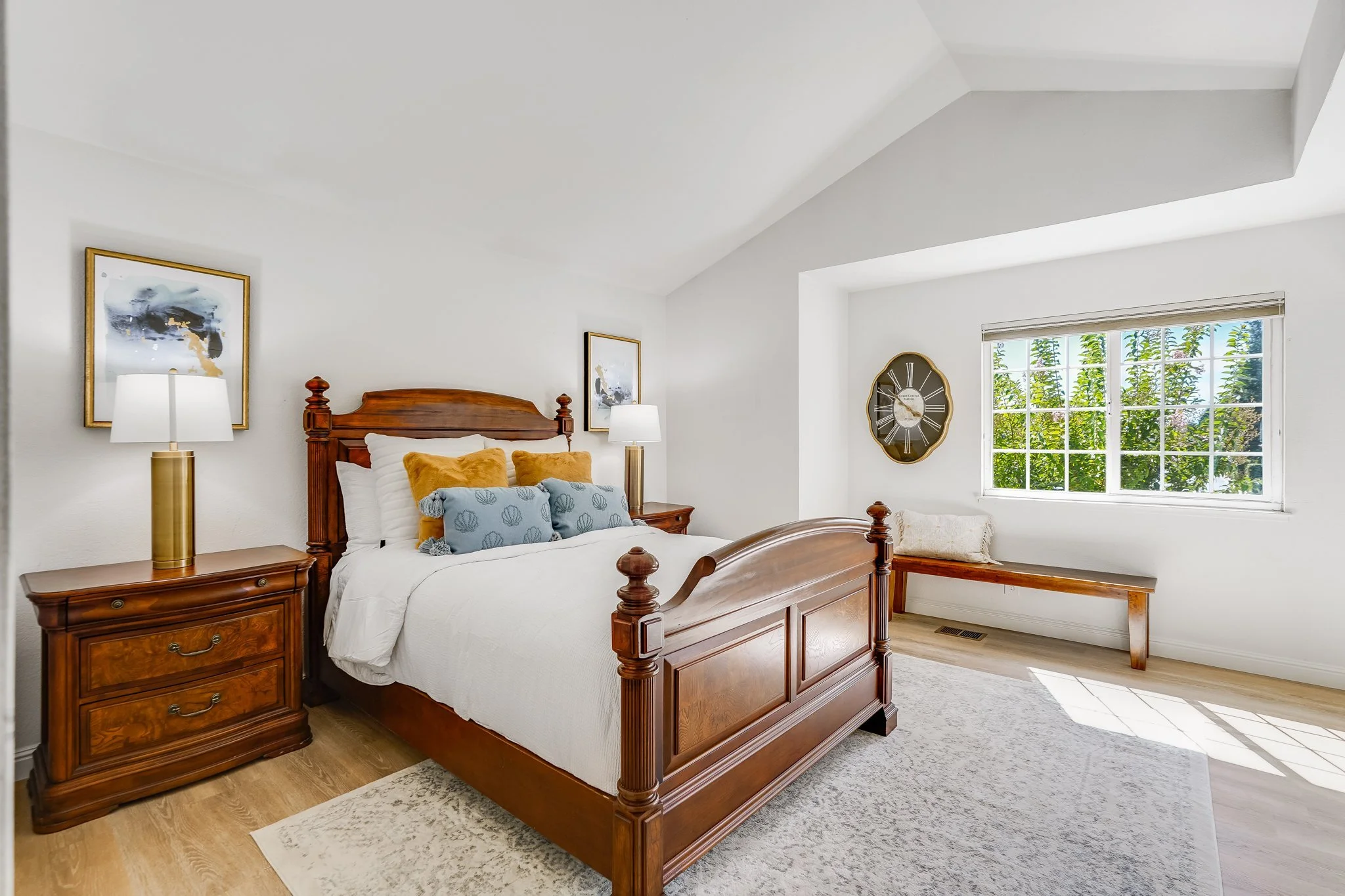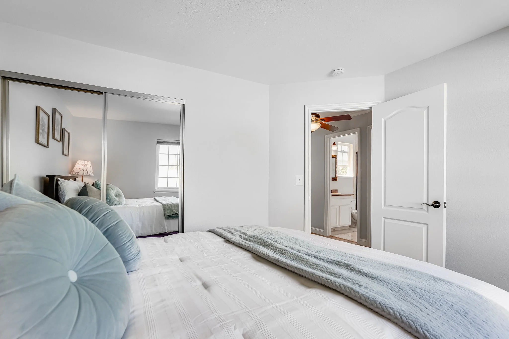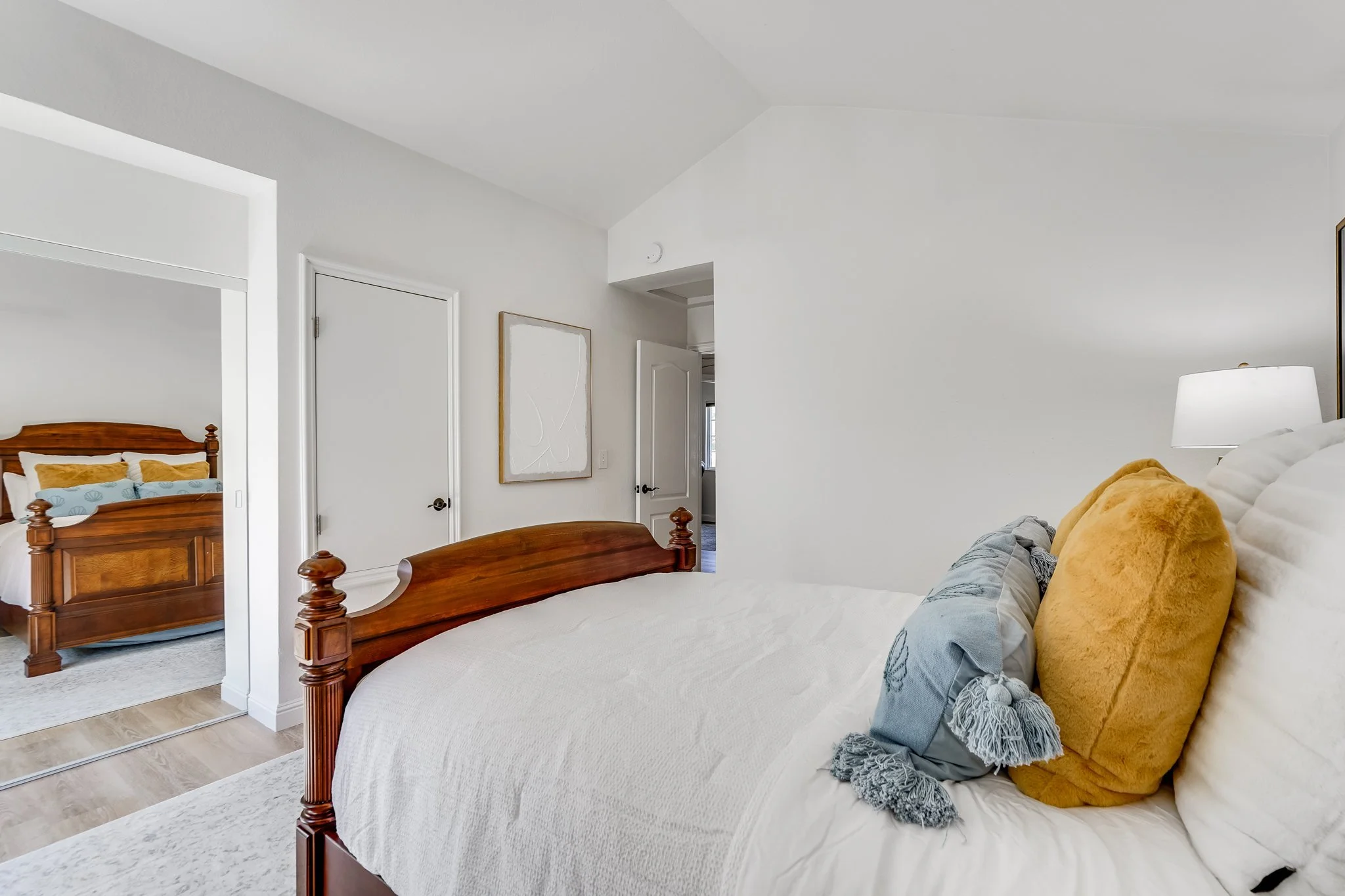 In the primary bedroom suite, vaulted ceilings and a mirrored closet create an airy atmosphere that enhances relaxation.