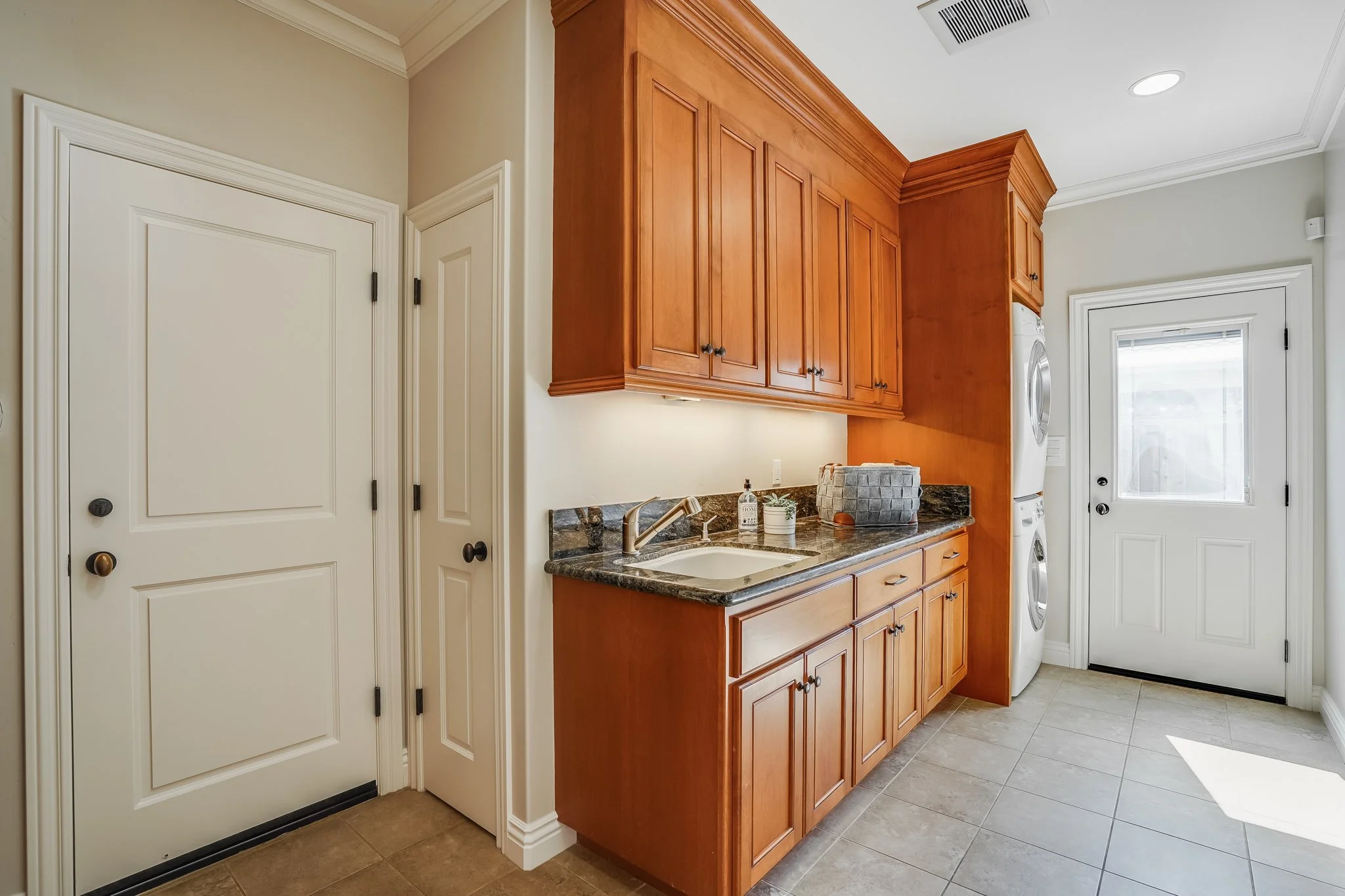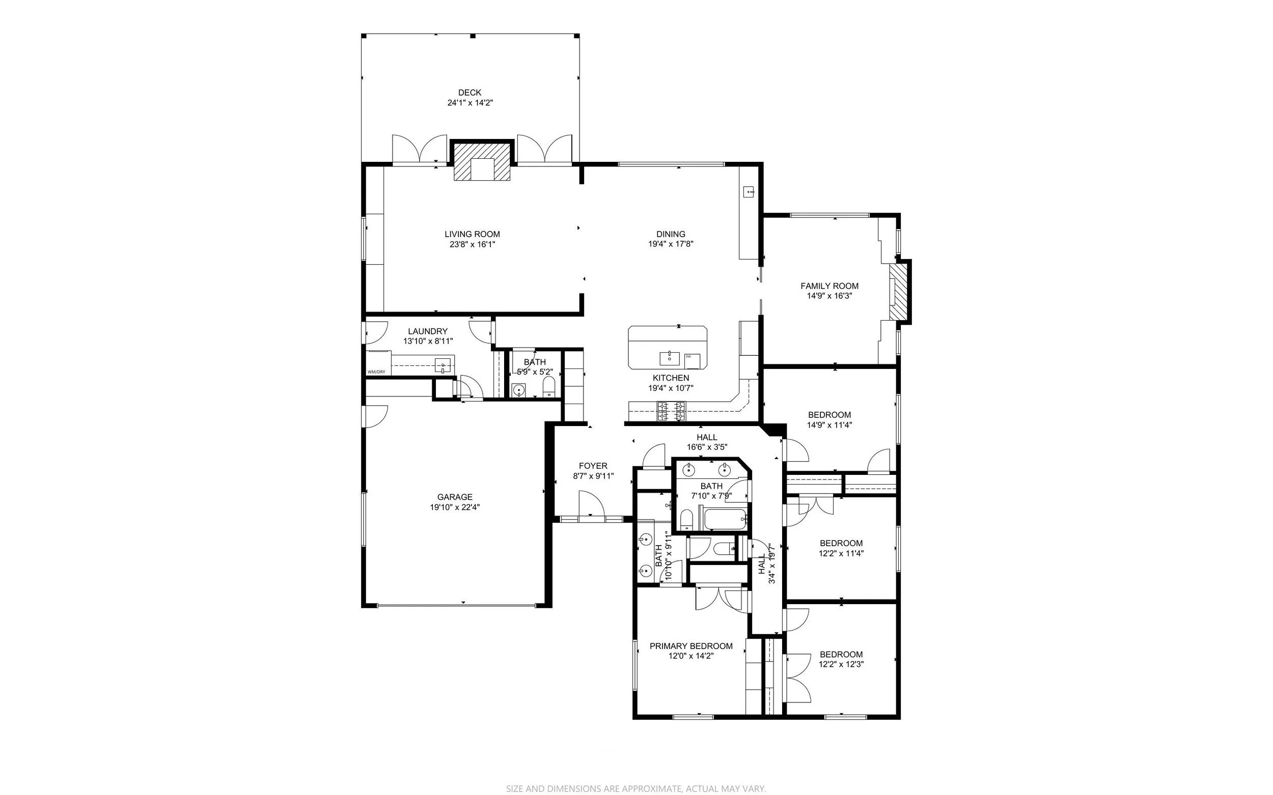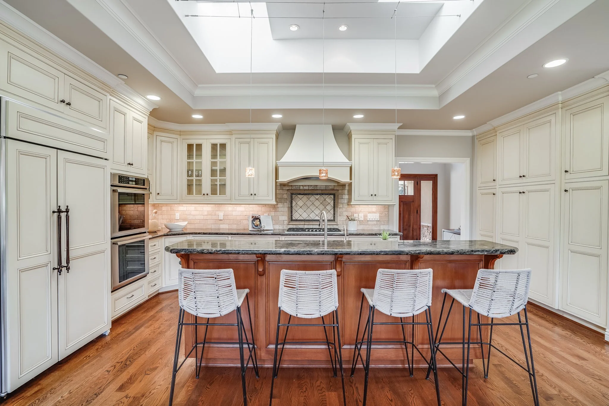 Kitchen includes custom cabinetry, granite countertops, and a two-tier island with bar seating.