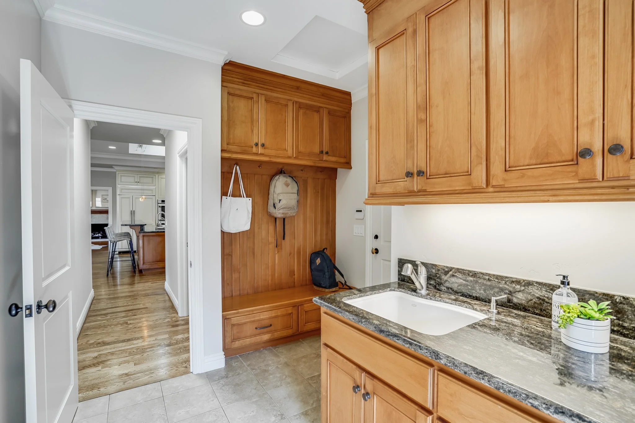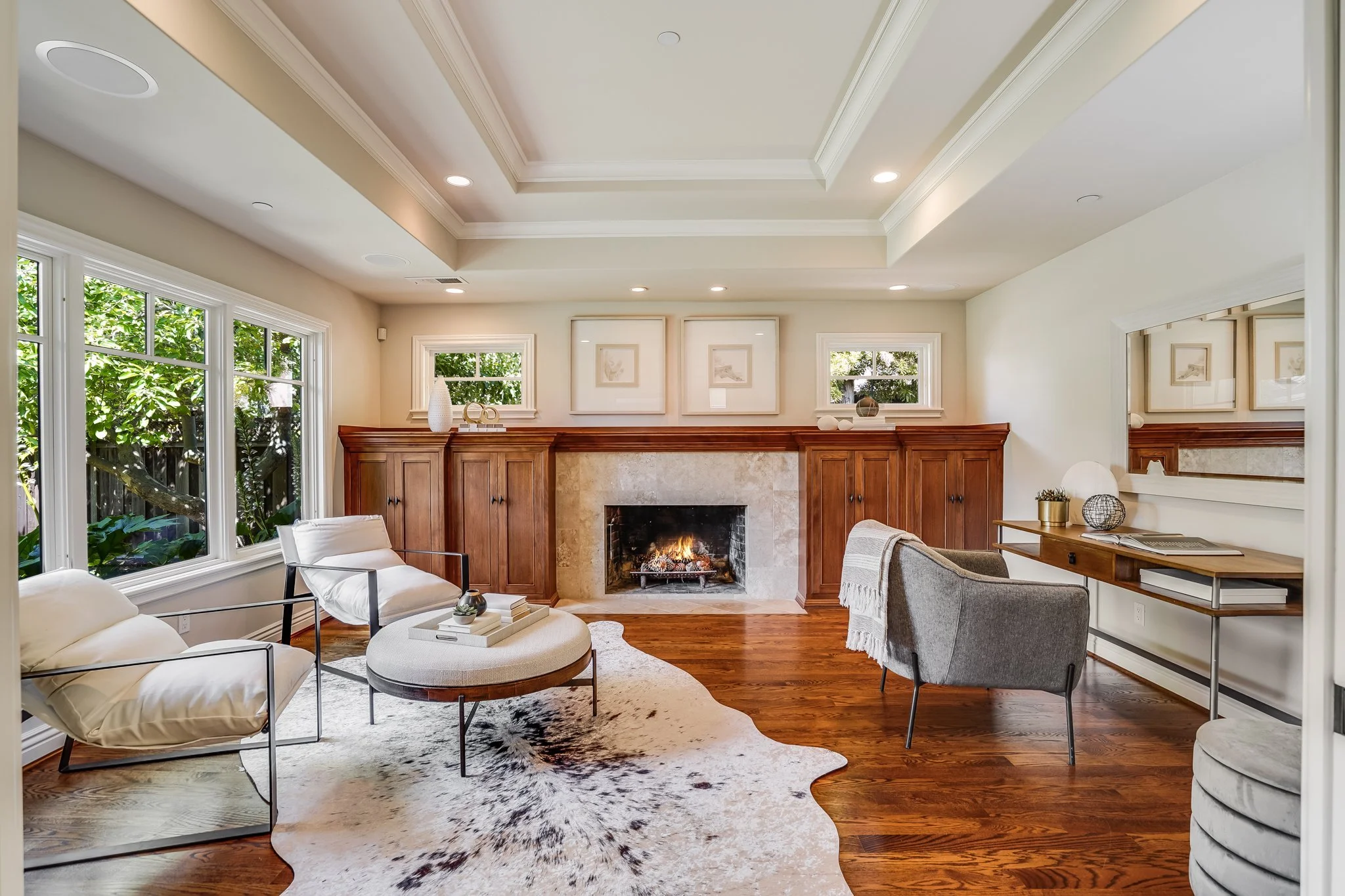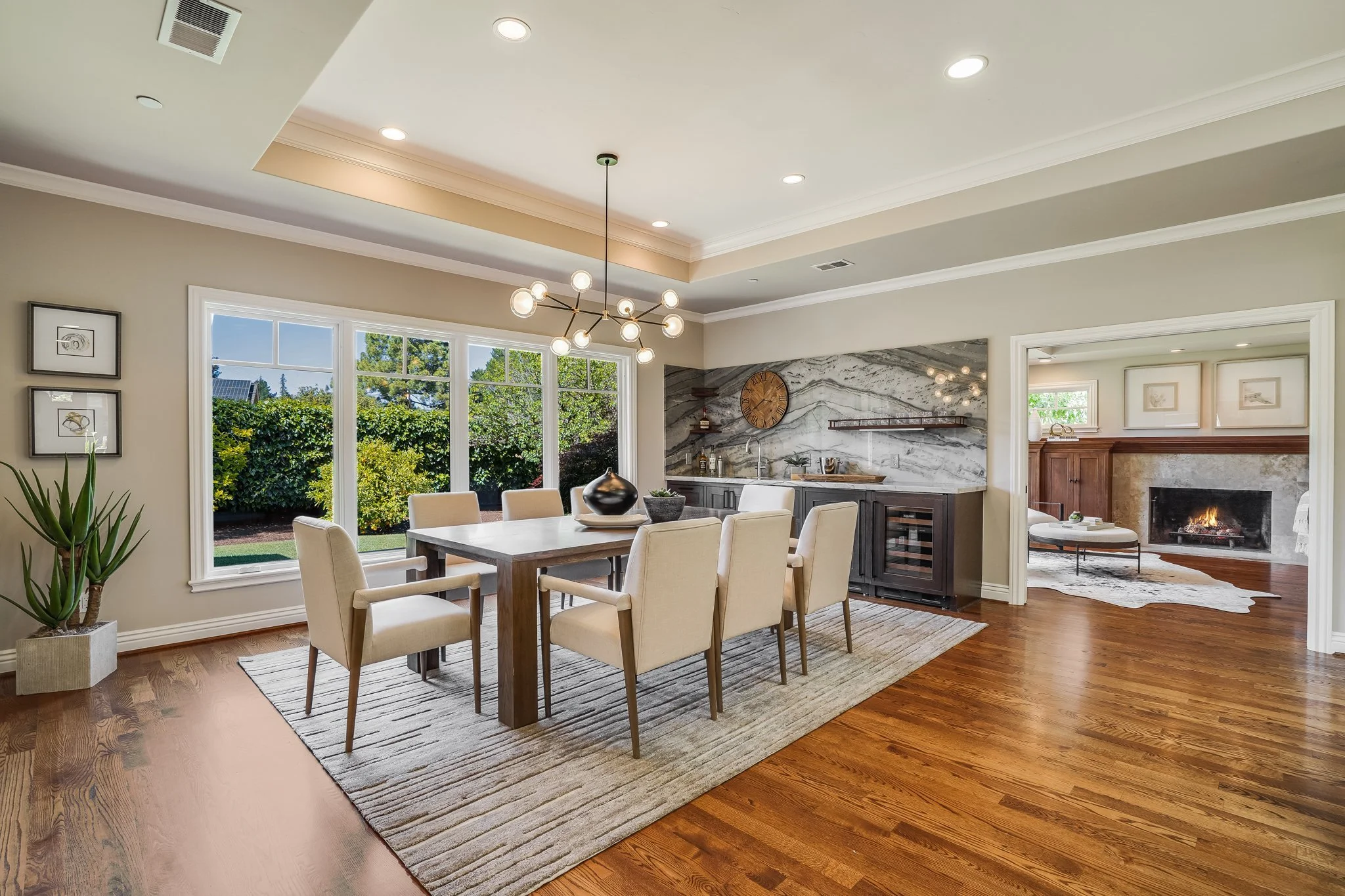 Great Room is optimized for entertaining, with a spacious family room featuring an additional fireplace and a sun-soaked dining space with a newly built bar.