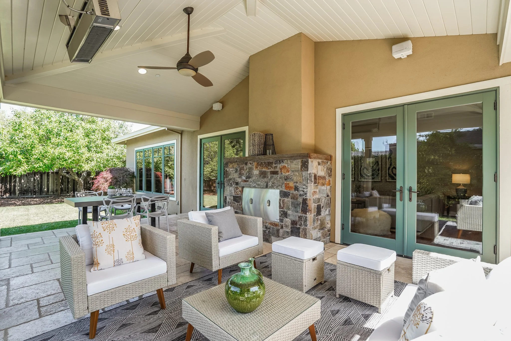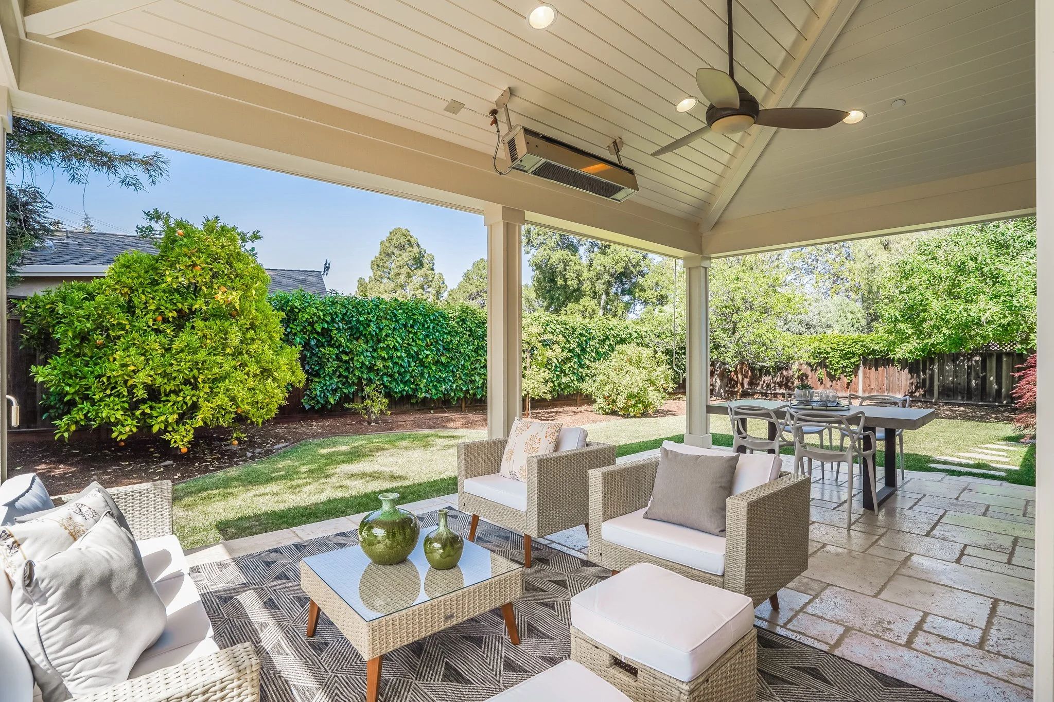 Gorgeous, private backyard offers the perfect entertaining space, with a covered patio featuring a gas fireplace, 6 fruit trees and plenty of greenery.