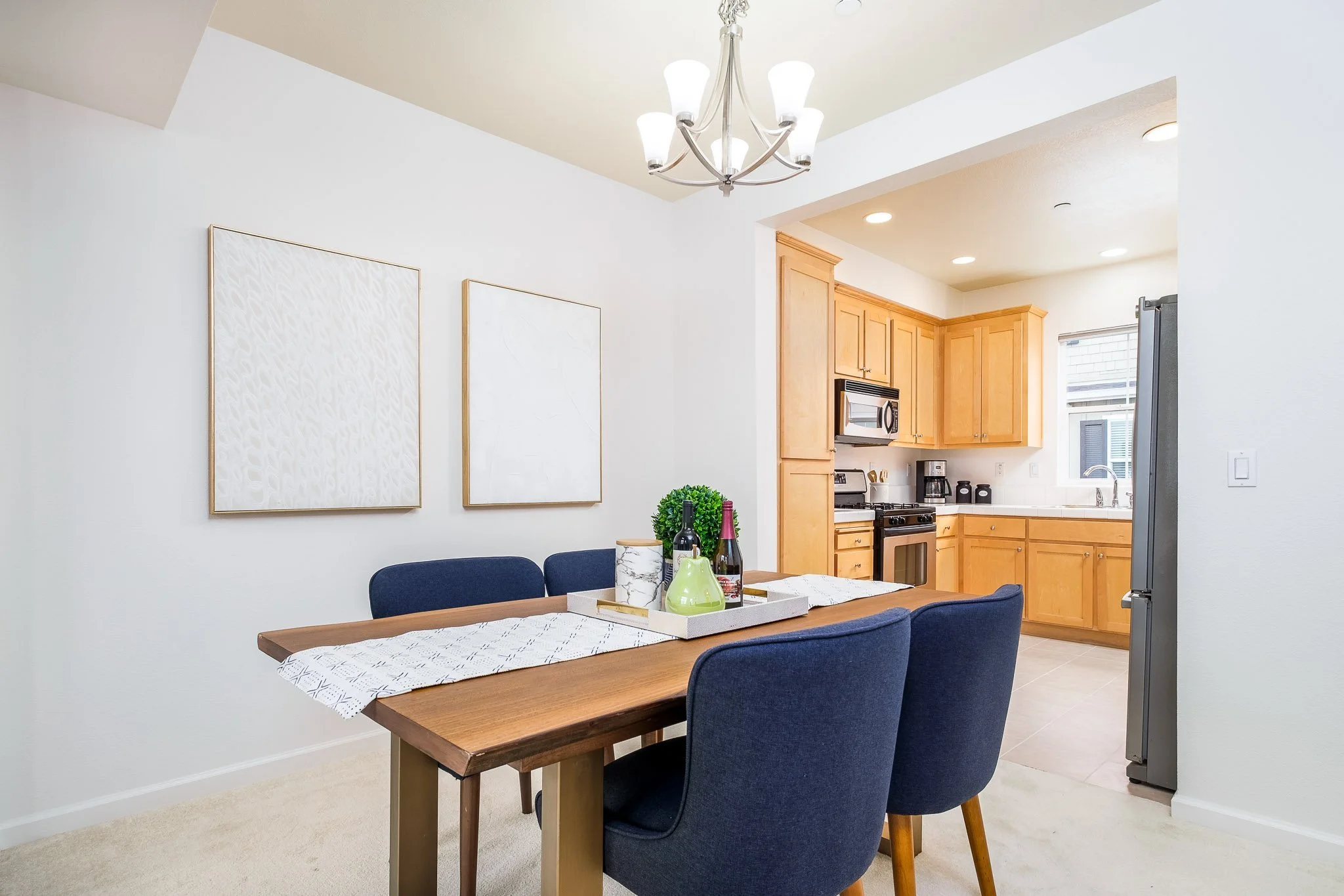 Beyond, find an open kitchen boasting new tile flooring, ample storage and modern appliances including a gas range, French Door refrigerator, and dishwasher