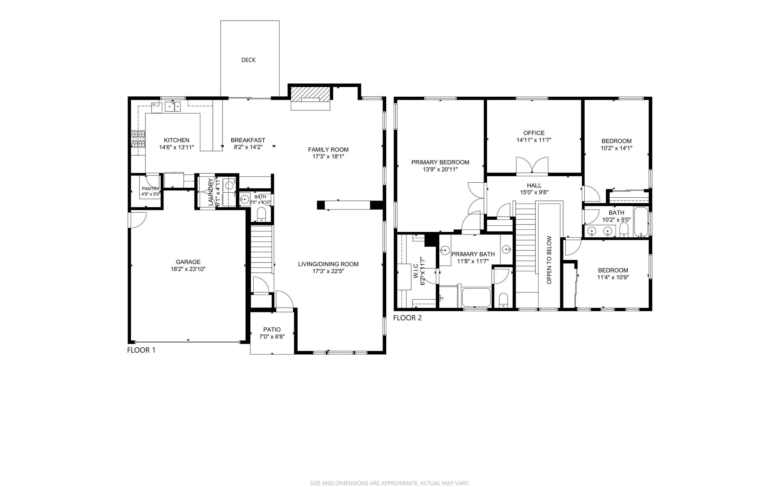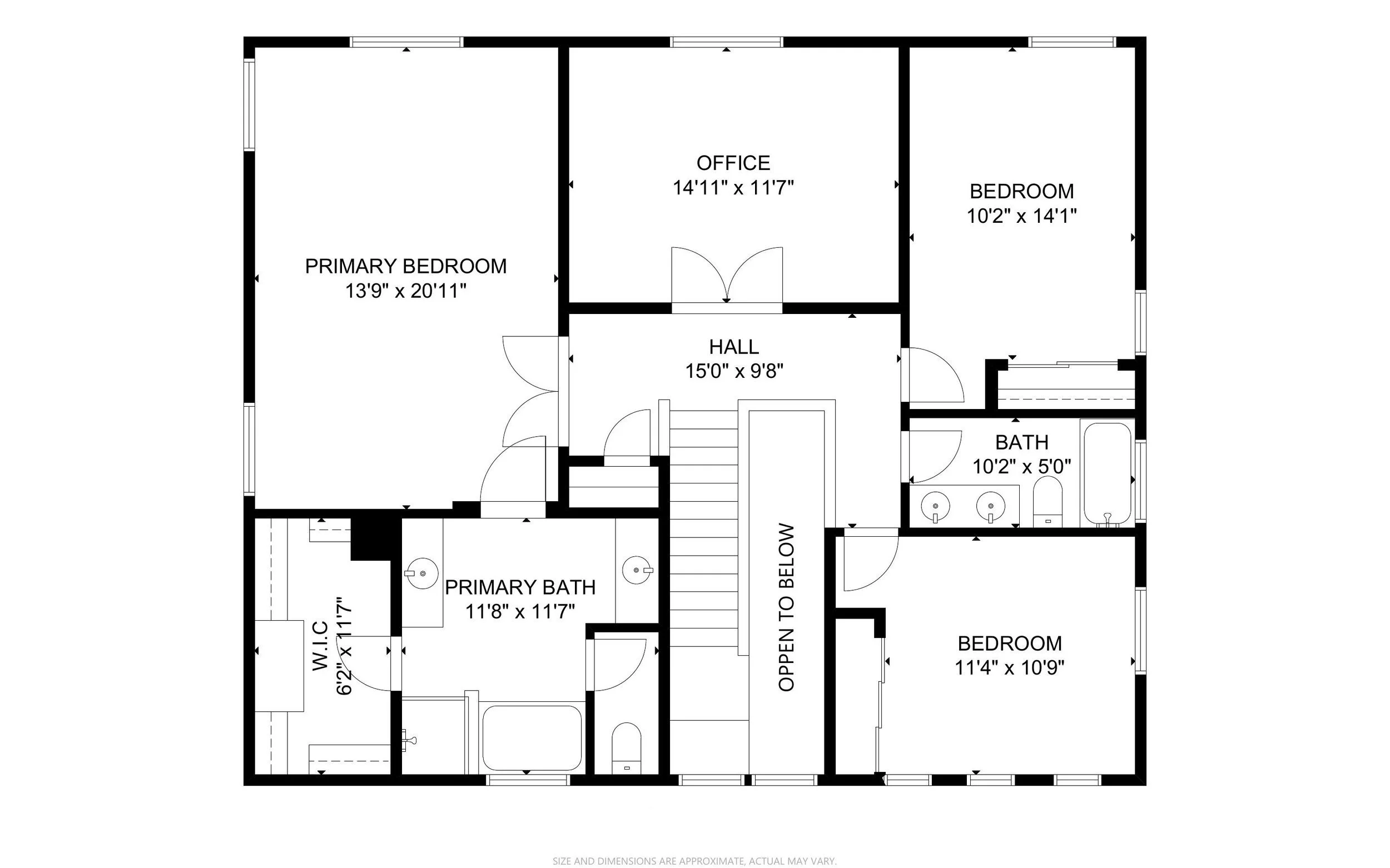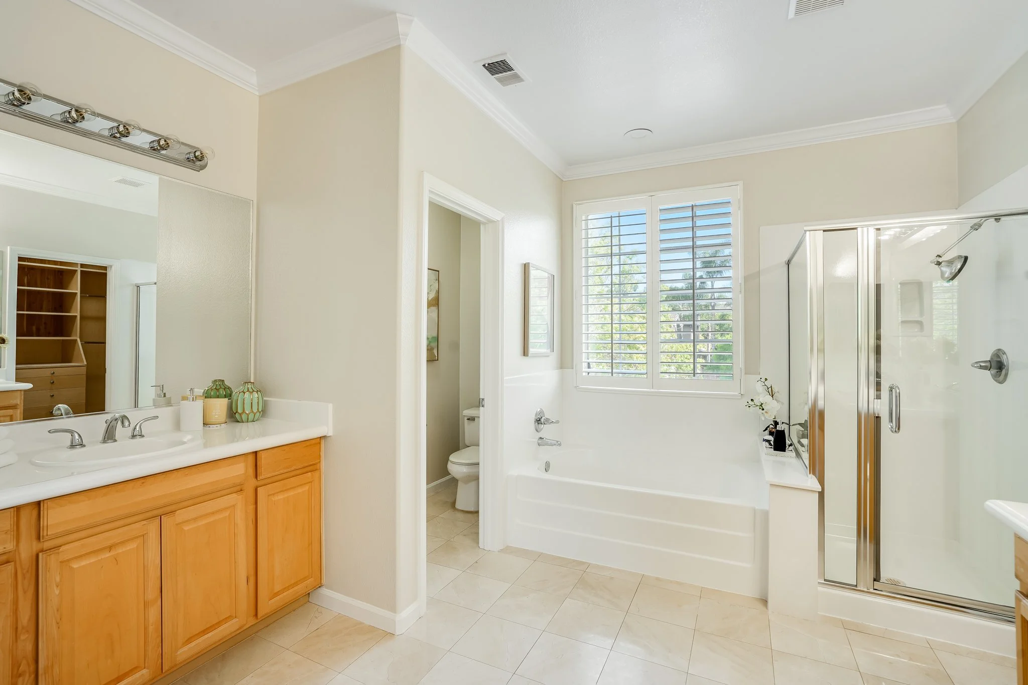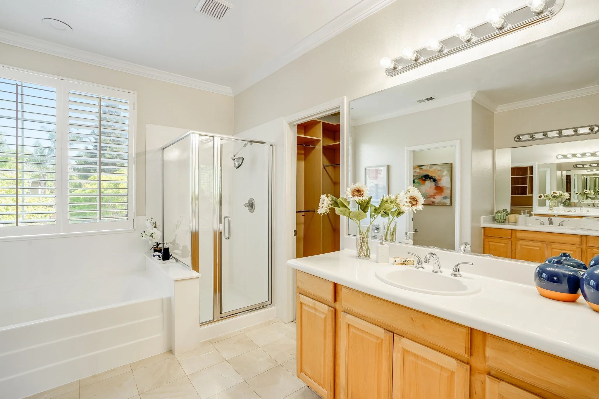 Upstairs, find a primary bedroom with a sizeable en-suite bath including an oversized tub, two sinks, and a walk-in closet